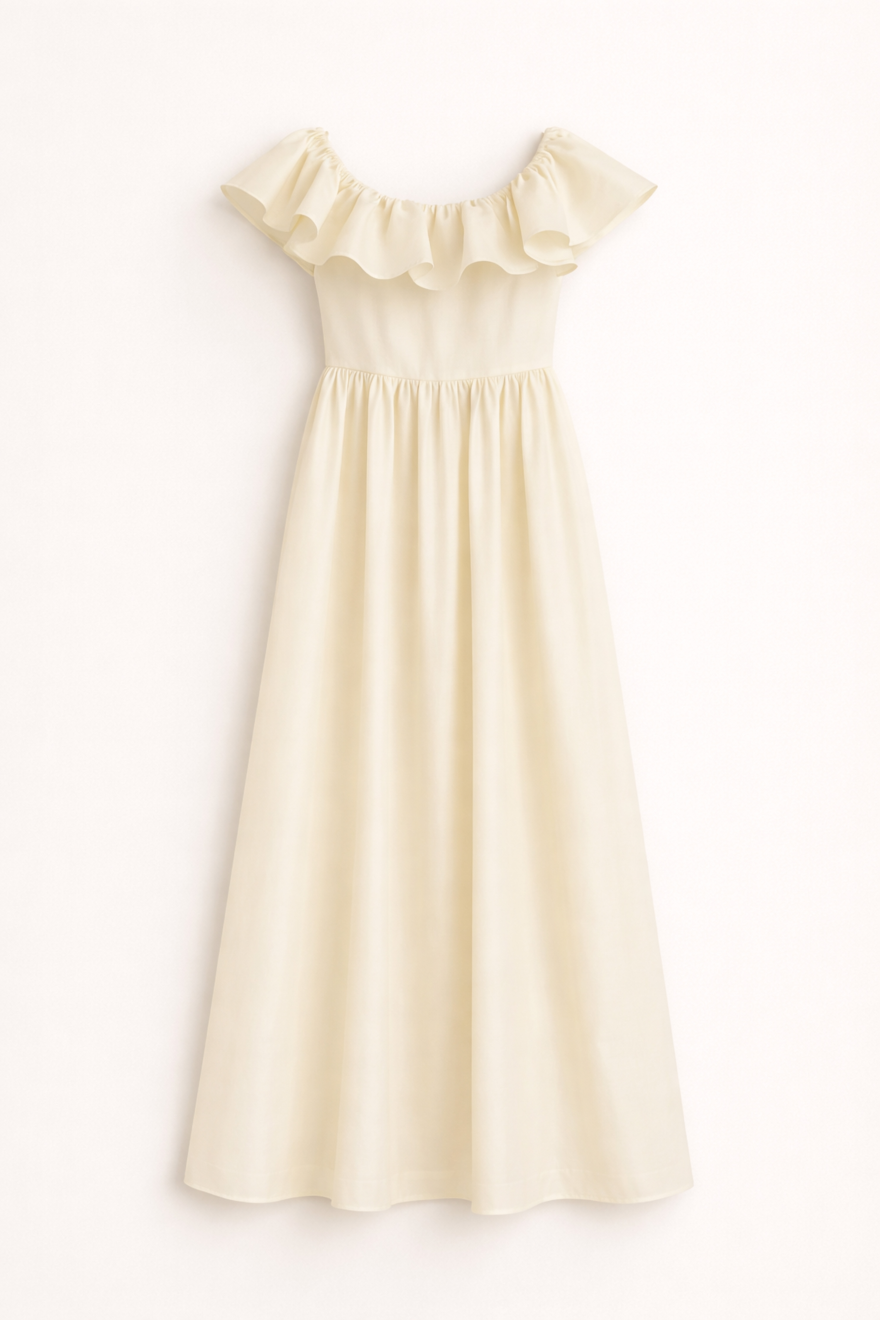 Long dress with wide off-the-shoulder neckline and ruffles.