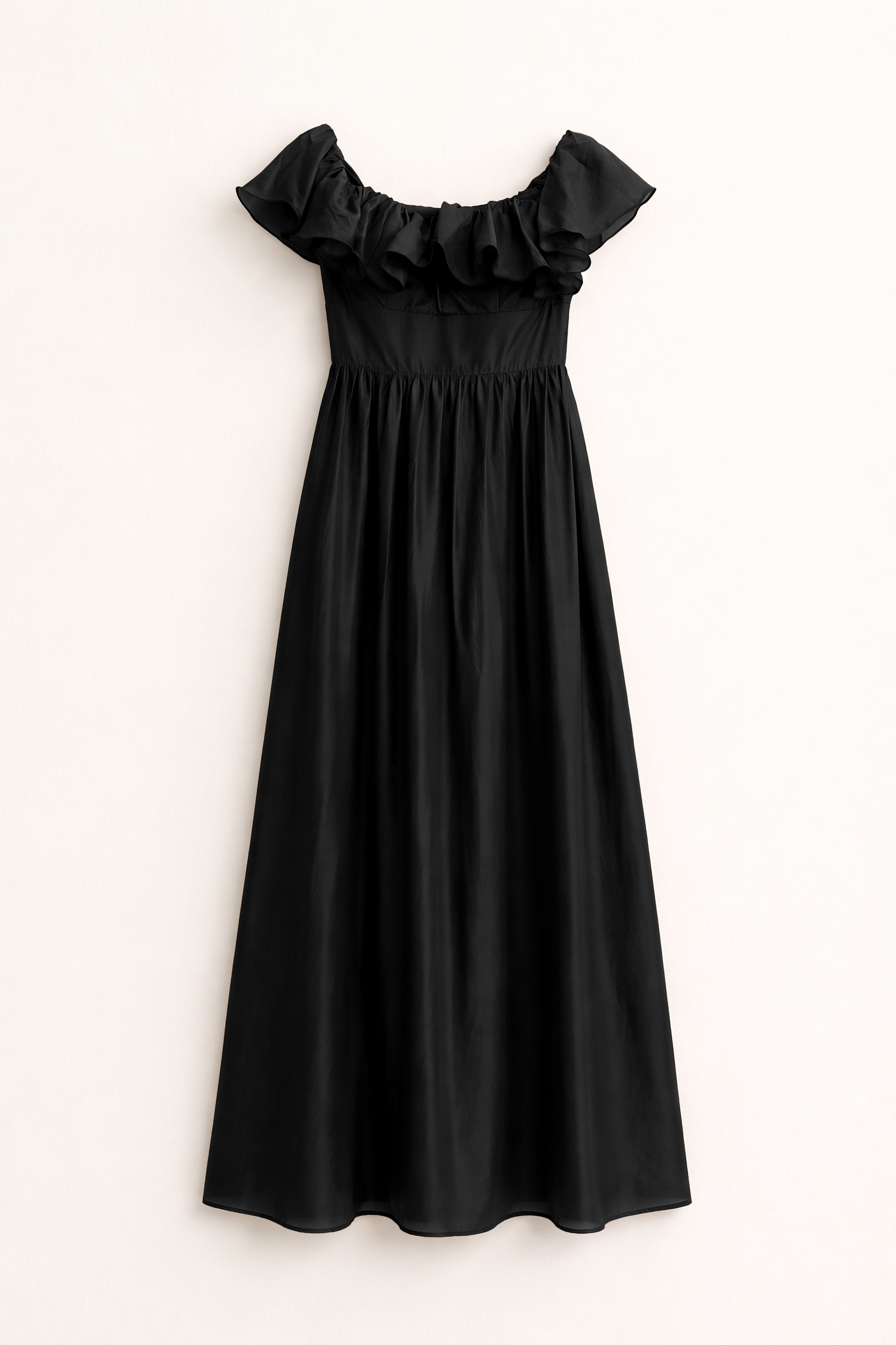 Long dress with wide off-the-shoulder neckline and ruffles.