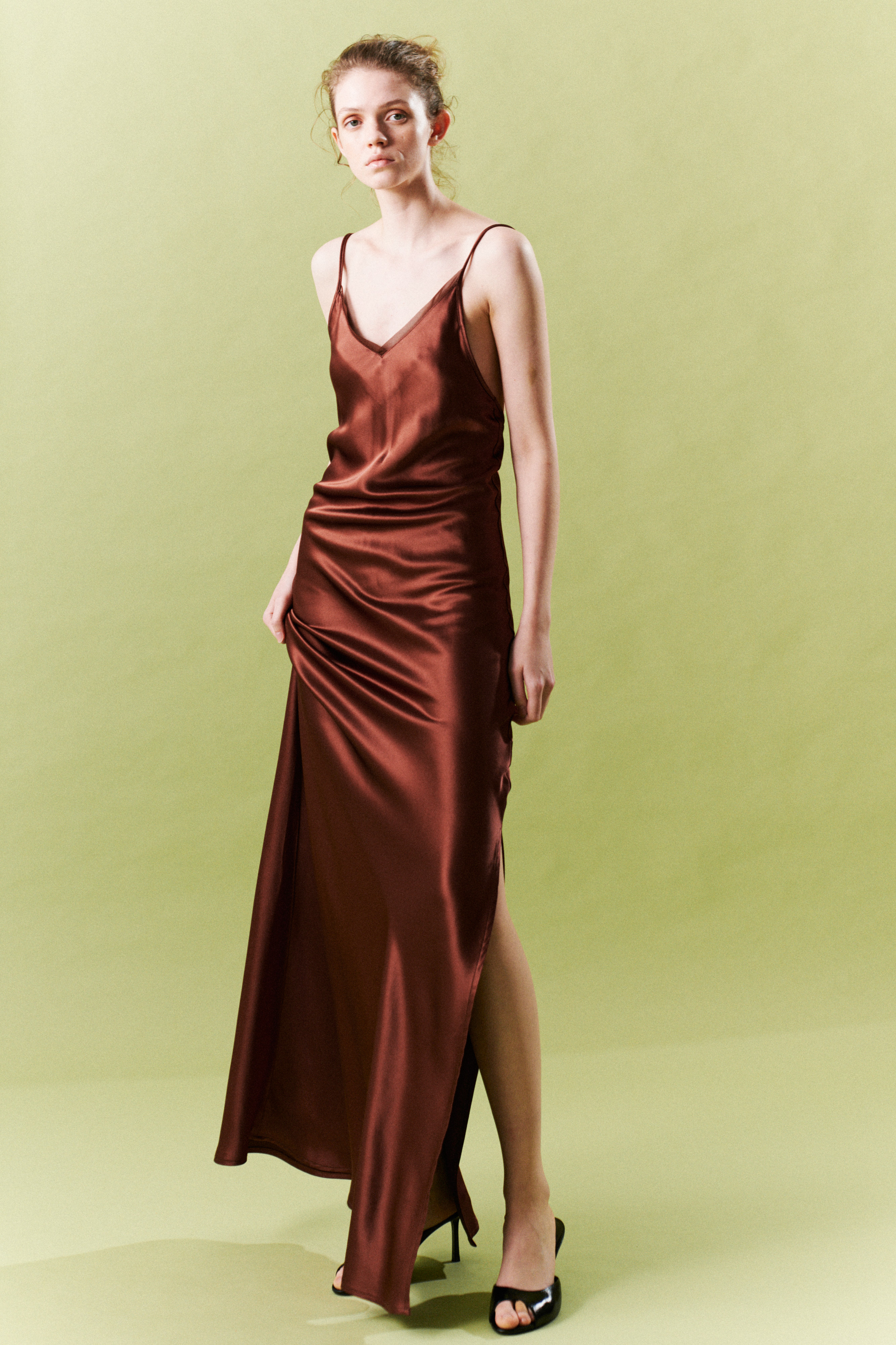 Long dress in flowing and satin satin.