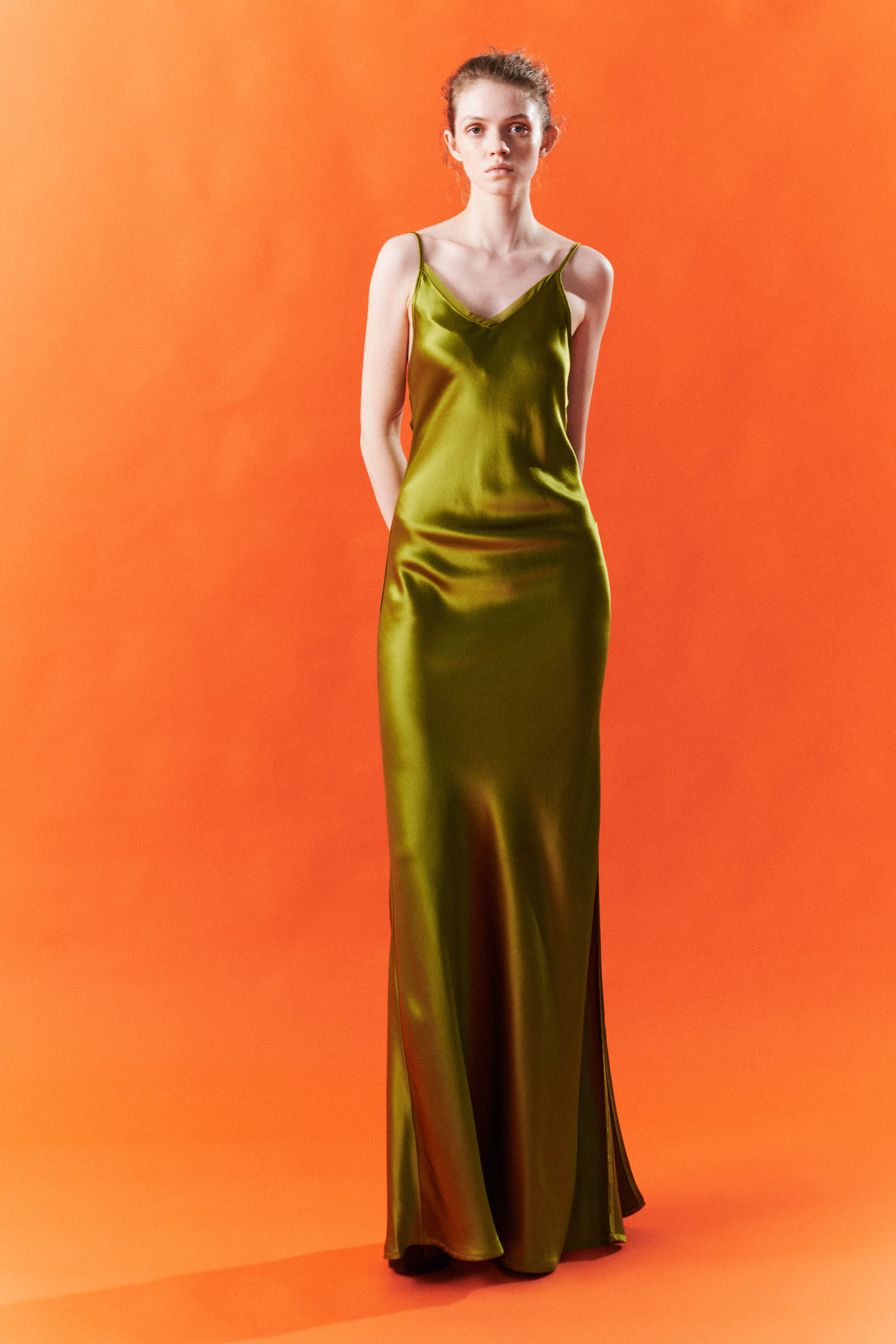 Long dress with wide off-the-shoulder neckline and ruffles.