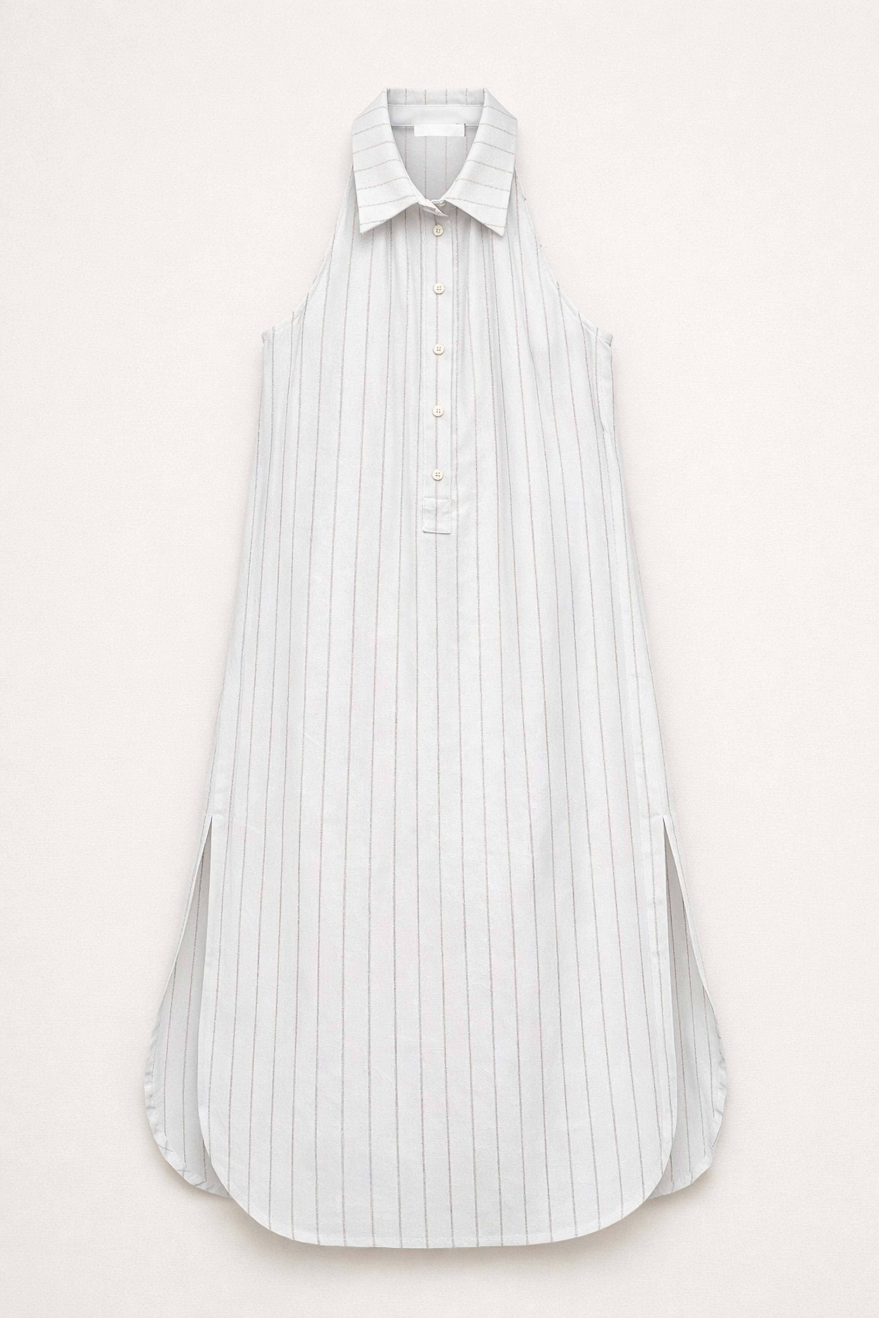 Long dress with wide off-the-shoulder neckline and ruffles.