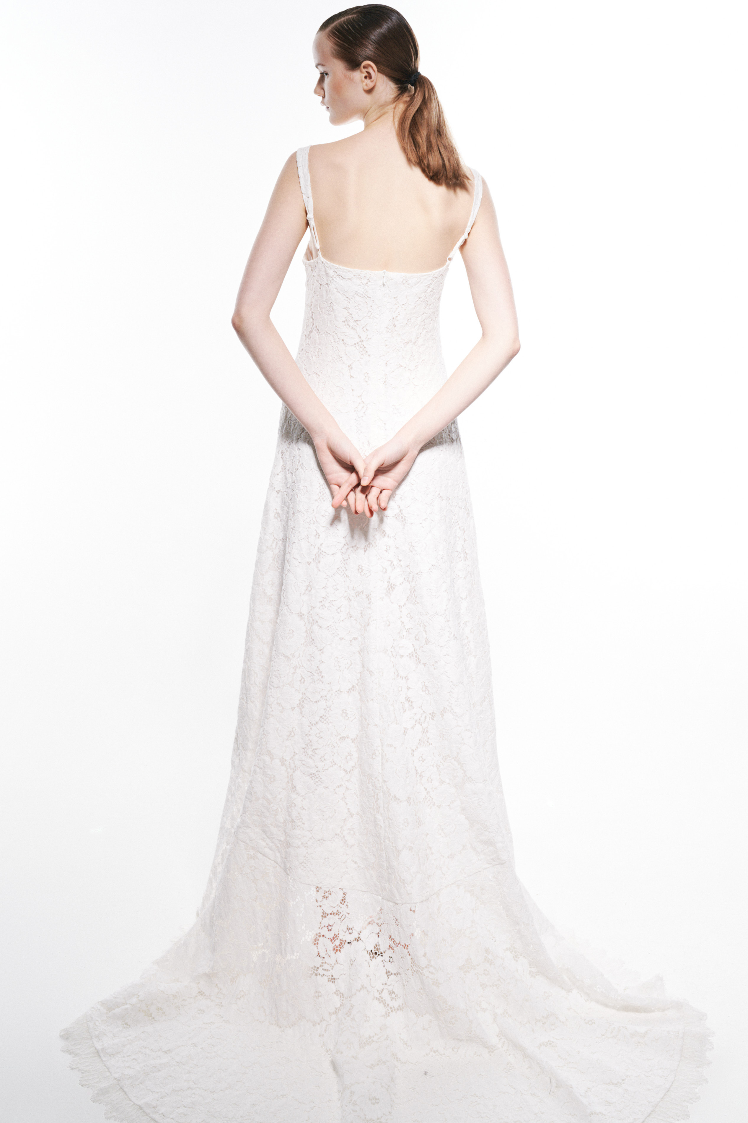Straight neckline with adjustable thin shoulder straps.