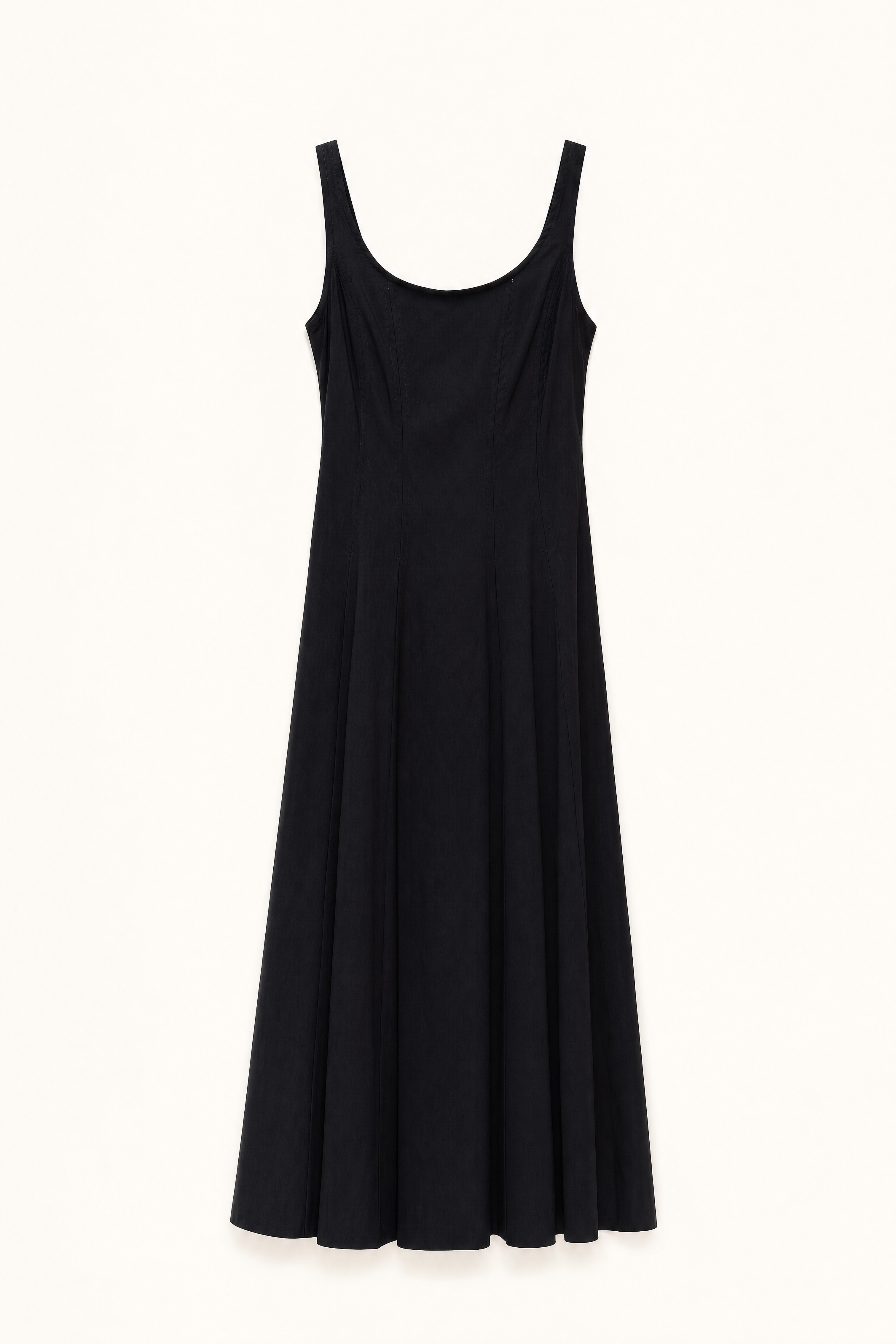 Long dress with wide rounded neckline. Construction with vertical shaping seams. Wide, flared skirt with fluid movement. Side closure with invisible zip. Regular fit, available in size S, M, L.
