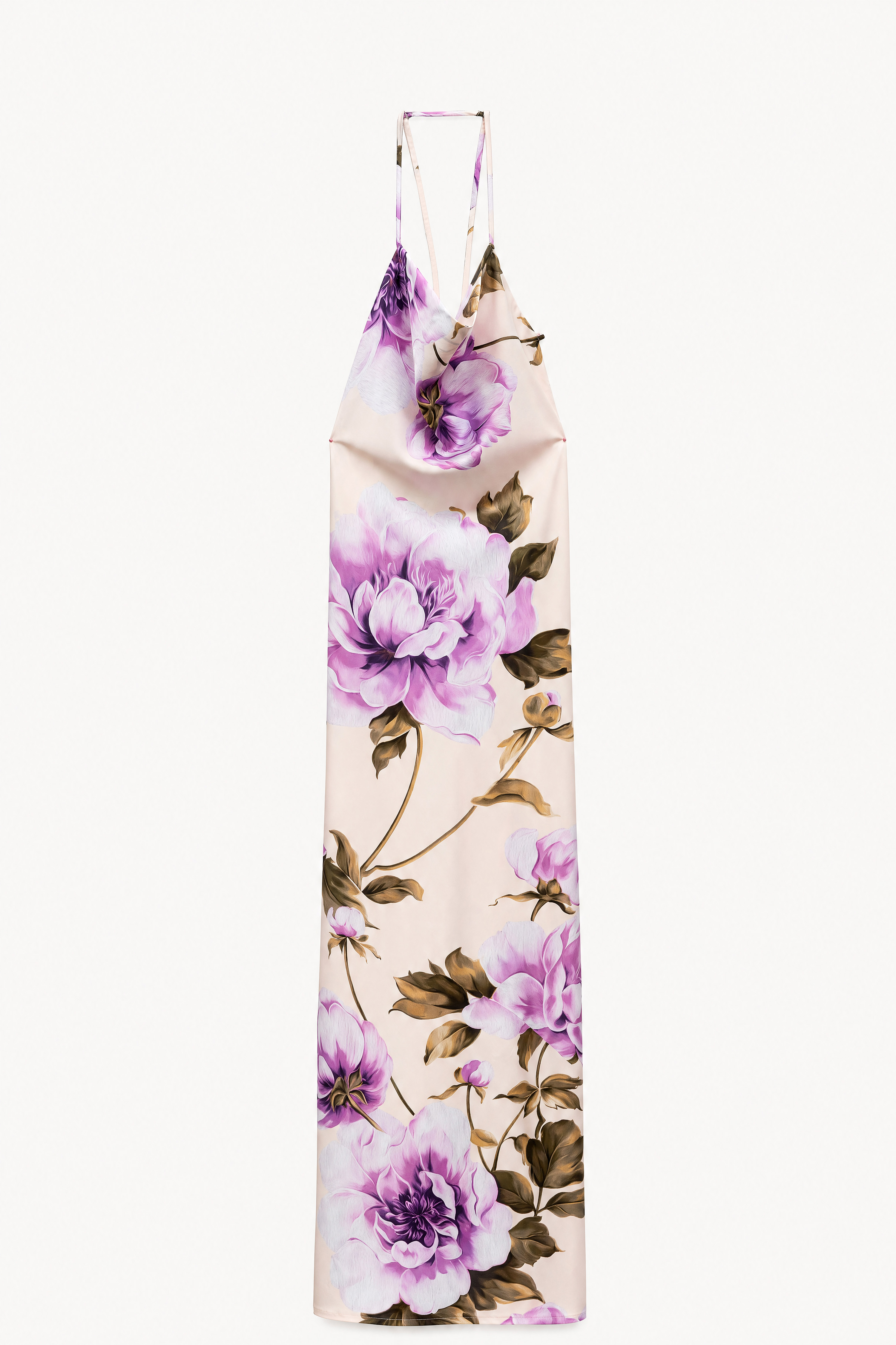 Long dress with all-over floral print. Draped neckline with adjustable ties at the back. Adjustable thin shoulder straps. Wide back. Back closure with invisible central zip. Regular fit, available in size S, M, L.
