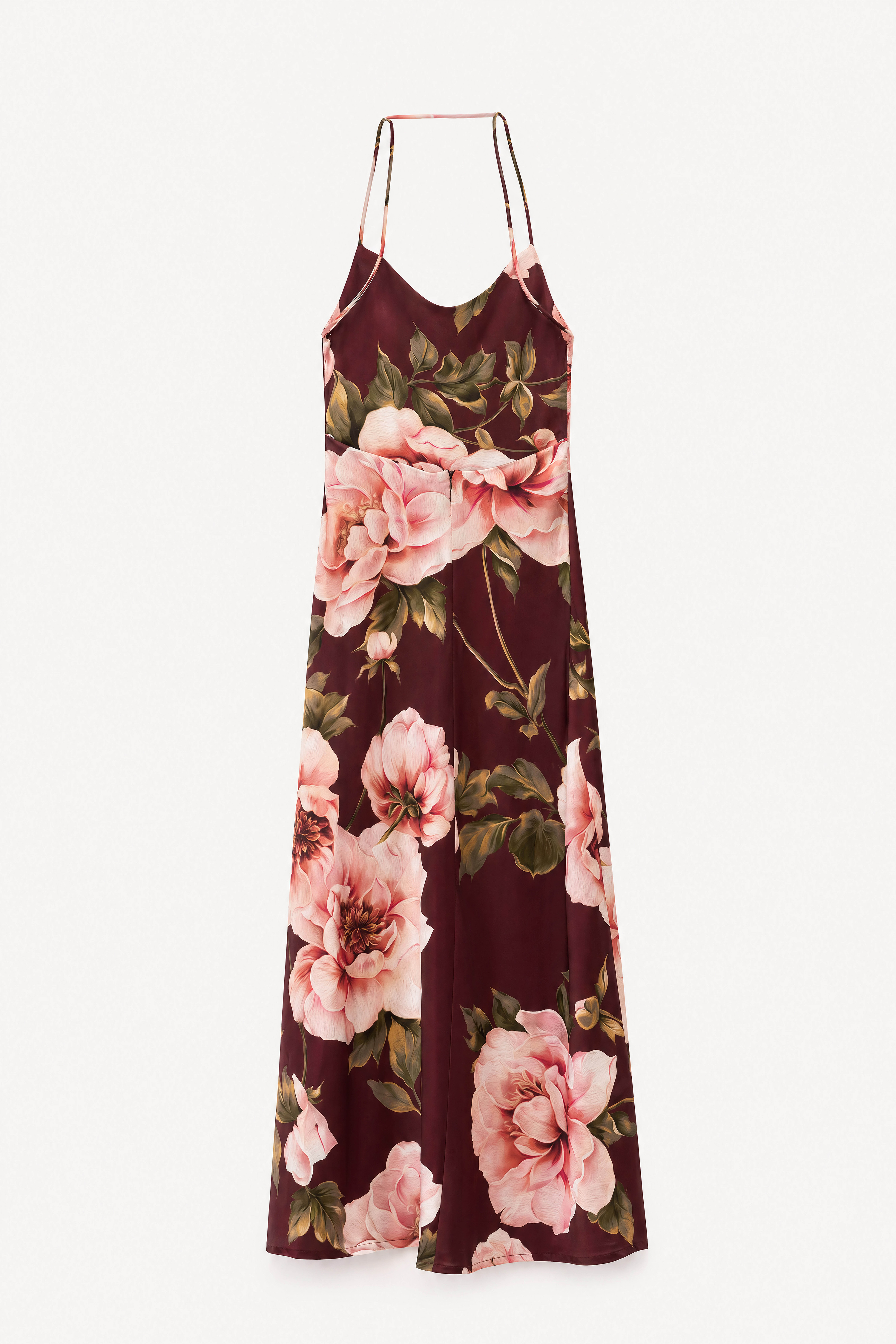 Long dress with all-over floral print. Draped neckline with adjustable ties at the back. Adjustable thin shoulder straps. Wide back. Back closure with invisible central zip. Regular fit, available in size S, M, L.