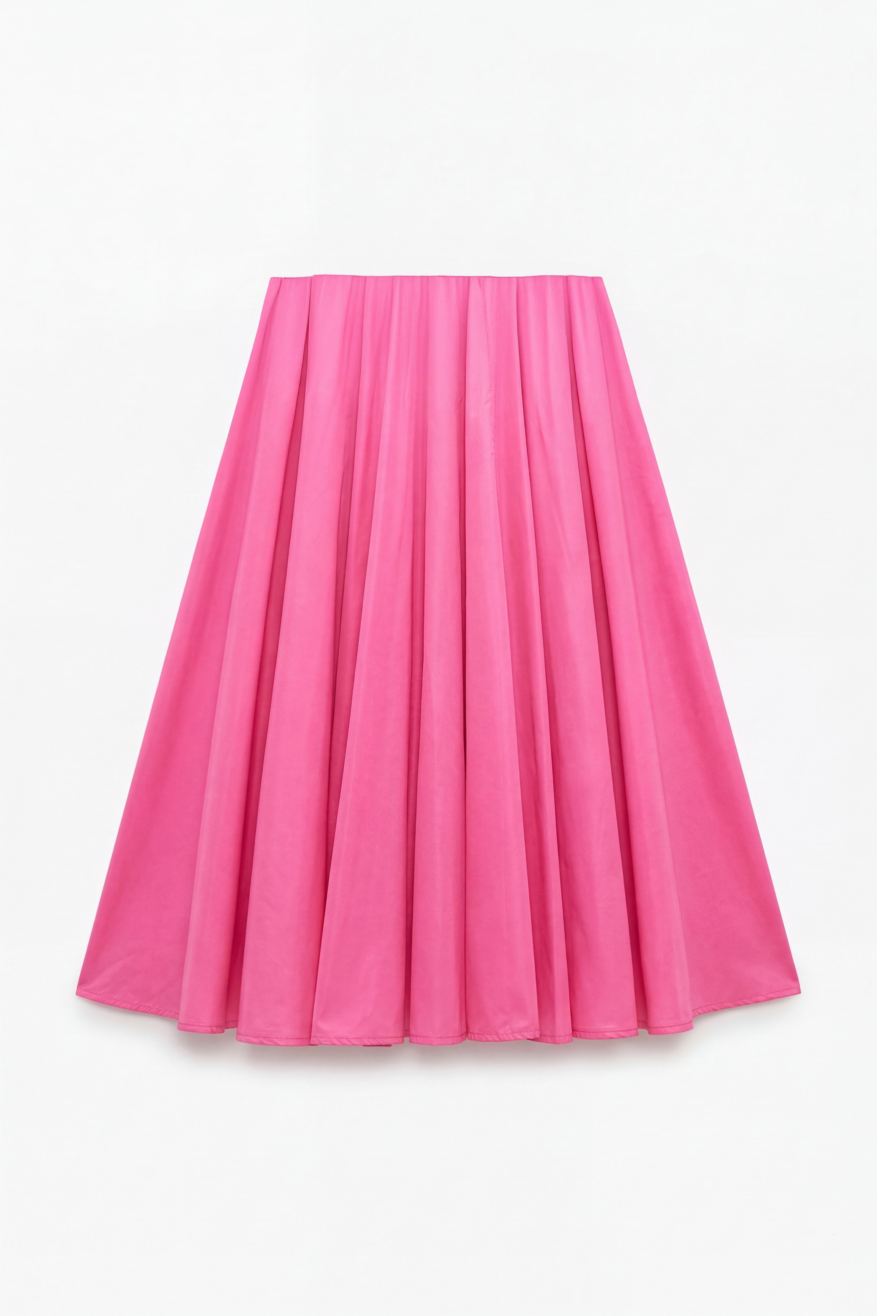 High-waisted midi skirt with a flared and flowing cut. It features a central slit on the back. Central back closure with invisible zip. Regular fit, available in size S, M, L.