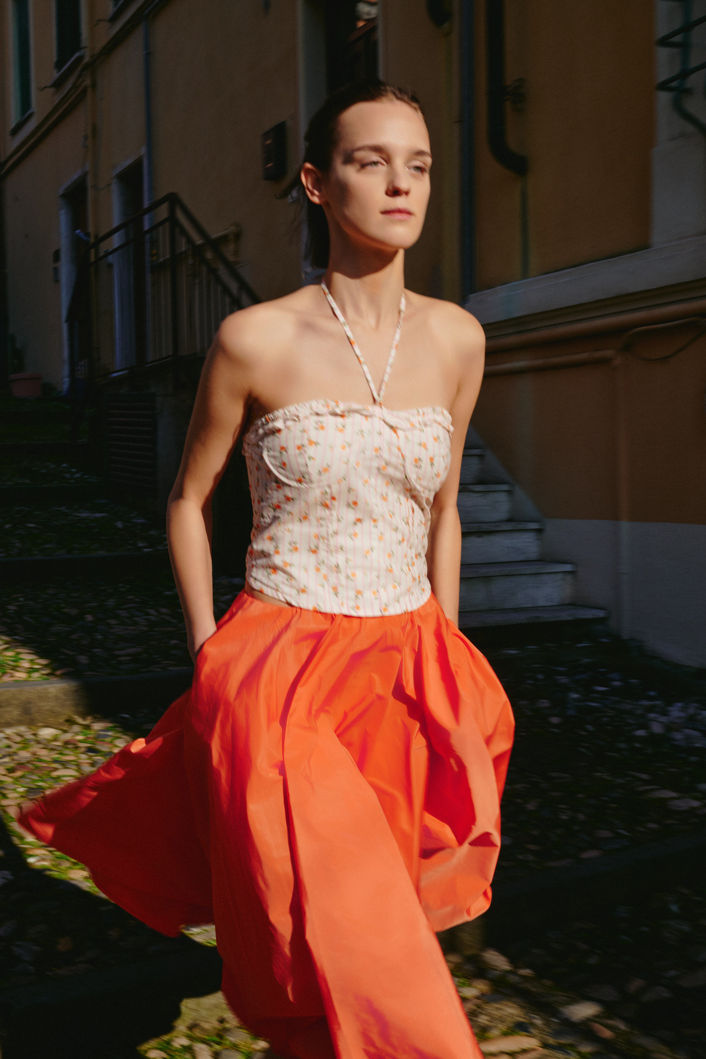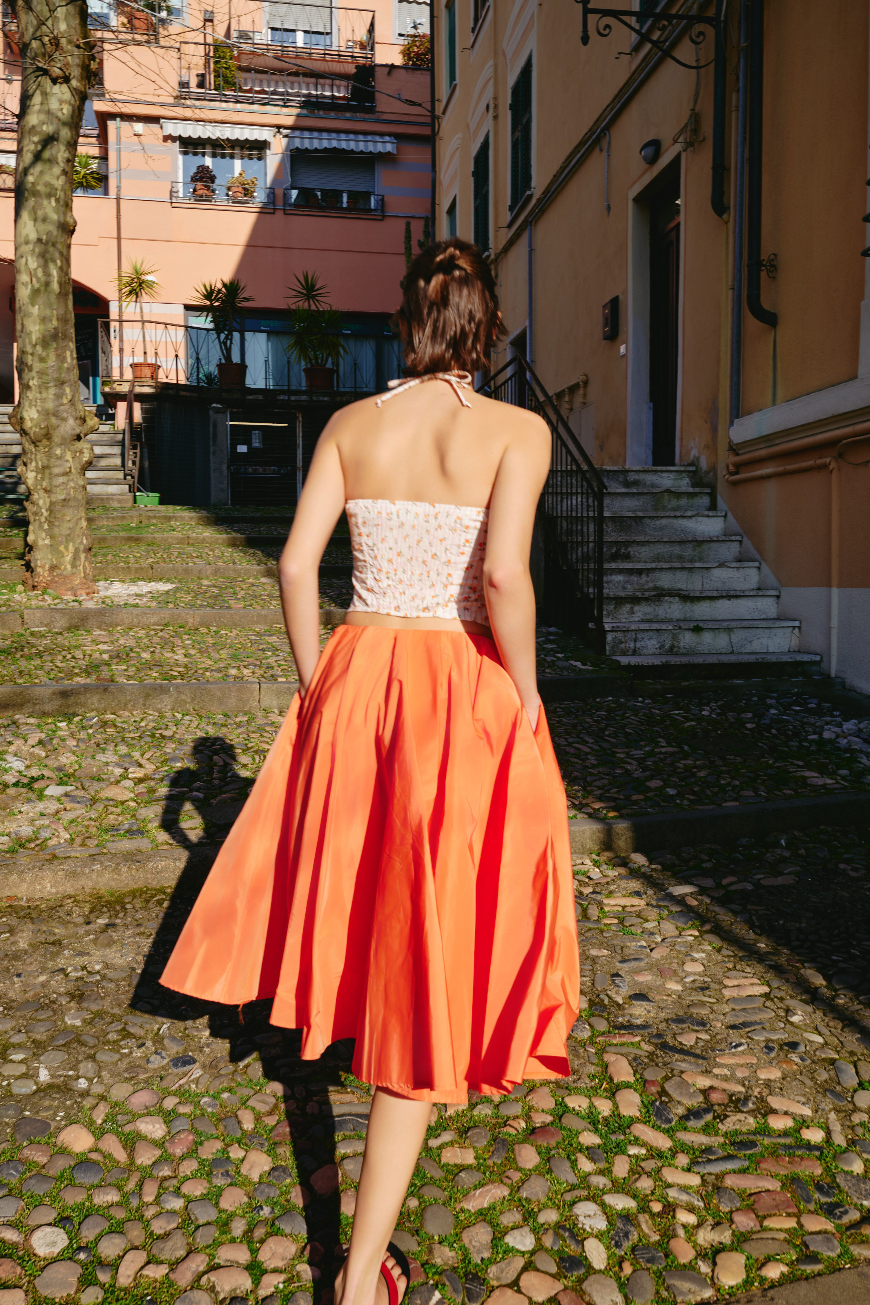 High-waisted midi skirt with a flared and flowing cut. It features a central slit on the back. Central back closure with invisible zip. Regular fit, available in size S, M, L.
