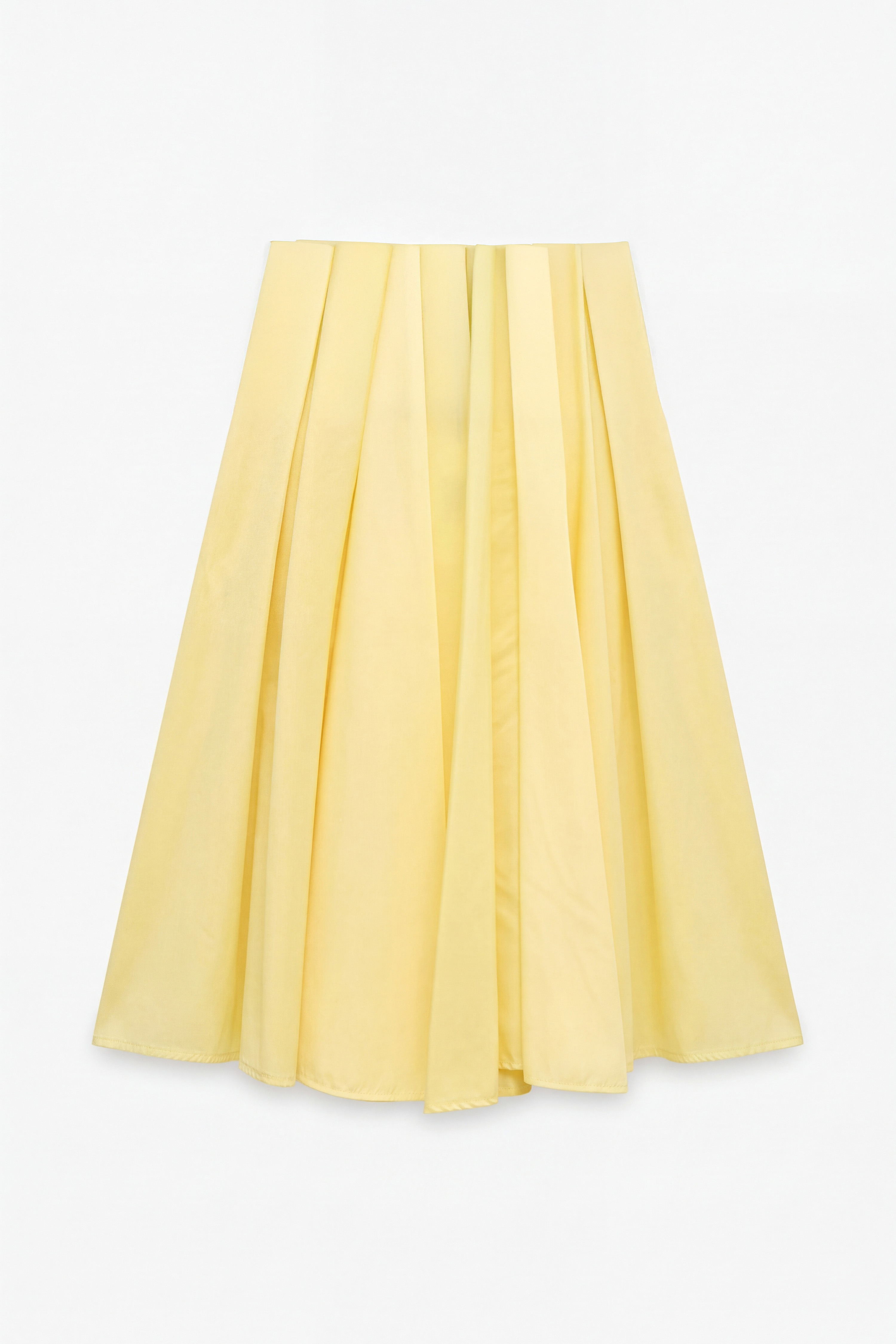 High-waisted midi skirt with a flared and flowing cut. It features a central slit on the back. Central back closure with invisible zip. Regular fit, available in size S, M, L.