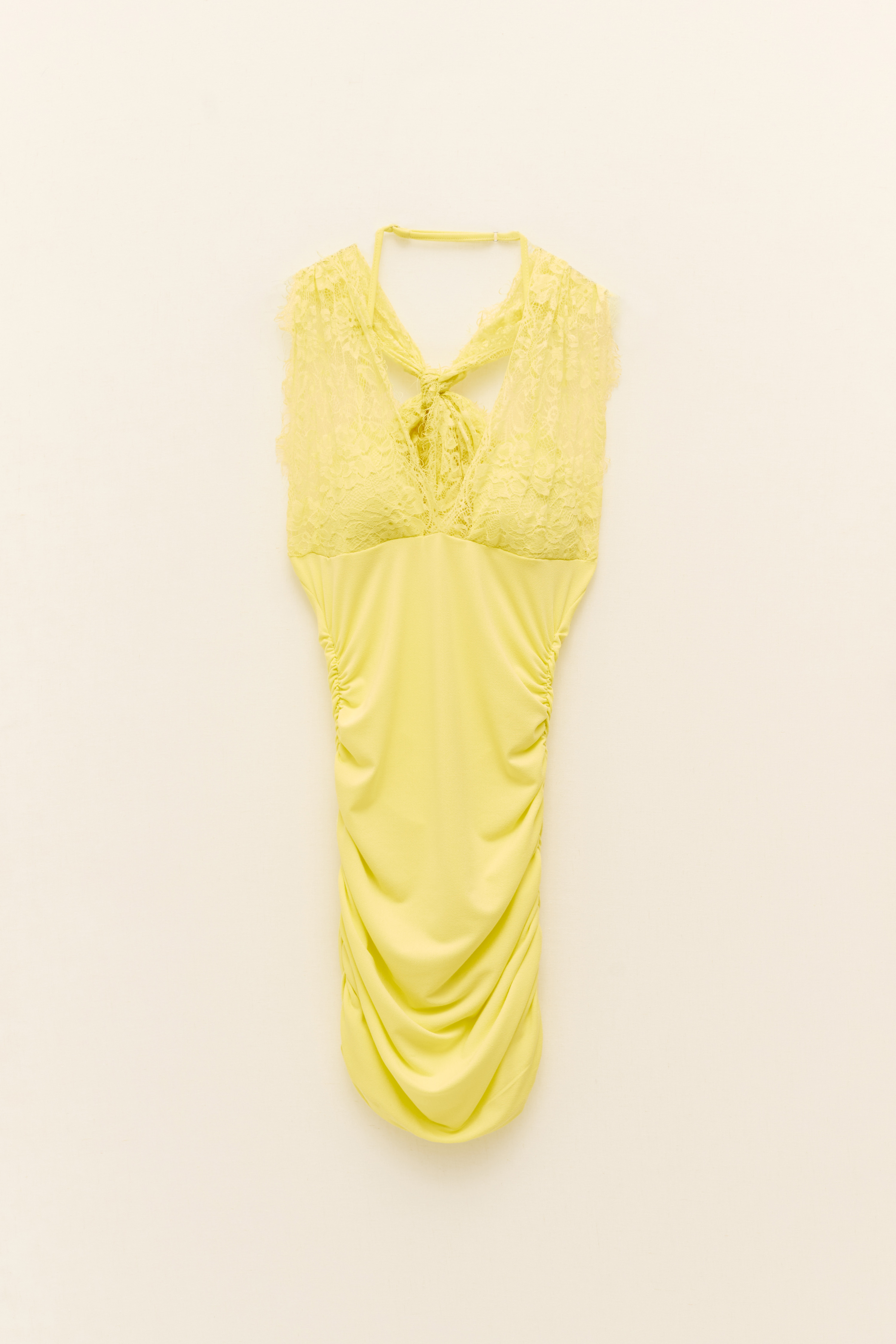 Dress in semi-transparent satin fabric. Deep V-neck. Adjustable thin shoulder straps. Front and side ruffle details. Adjustable back strap. Inner lining. Regular fit, available in size S/M, M/L.