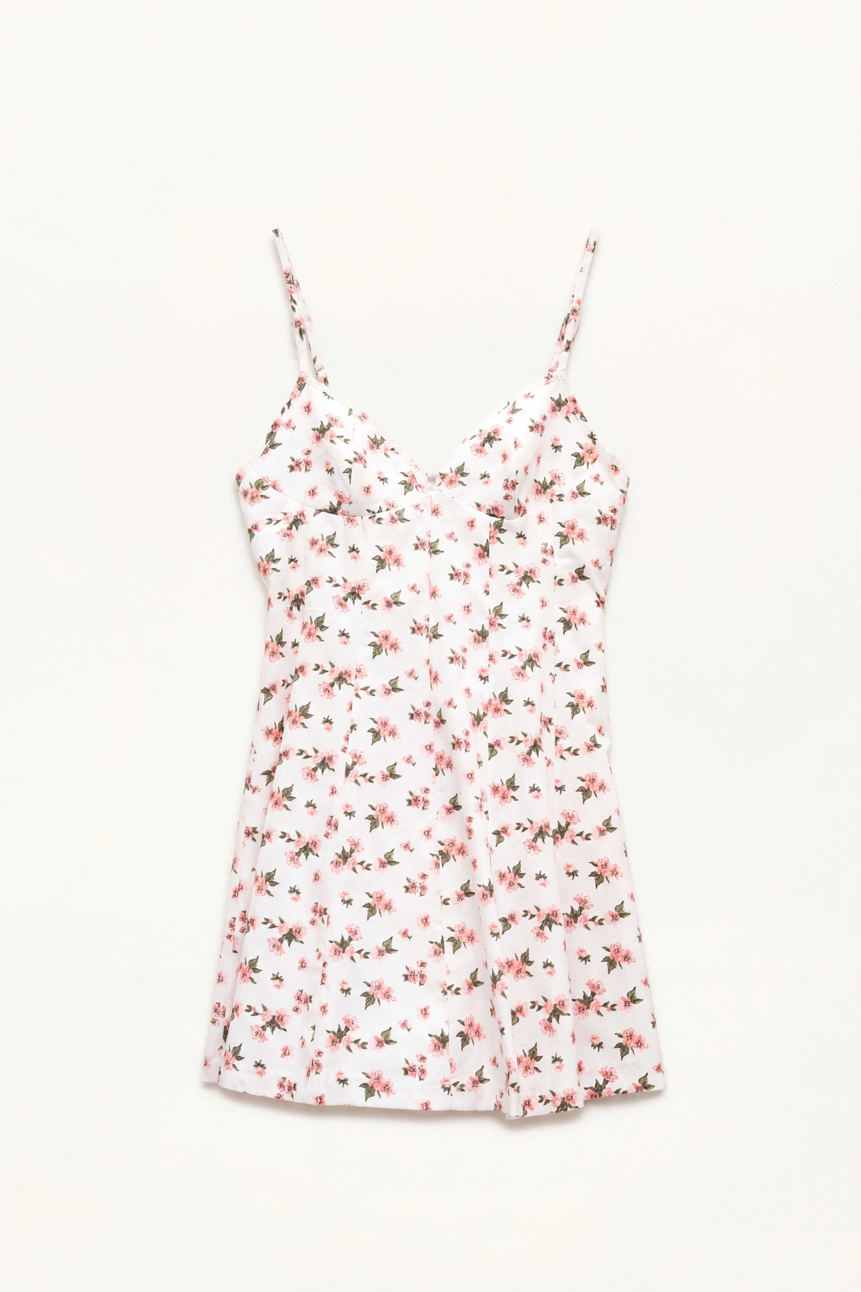 Mini dress with all-over floral print. Sweetheart neckline with structured cups. Adjustable thin shoulder straps. Lining. Fitted bodice with shaped seams. Invisible zip closure on the back. Regular fit, available in size S, M, L.