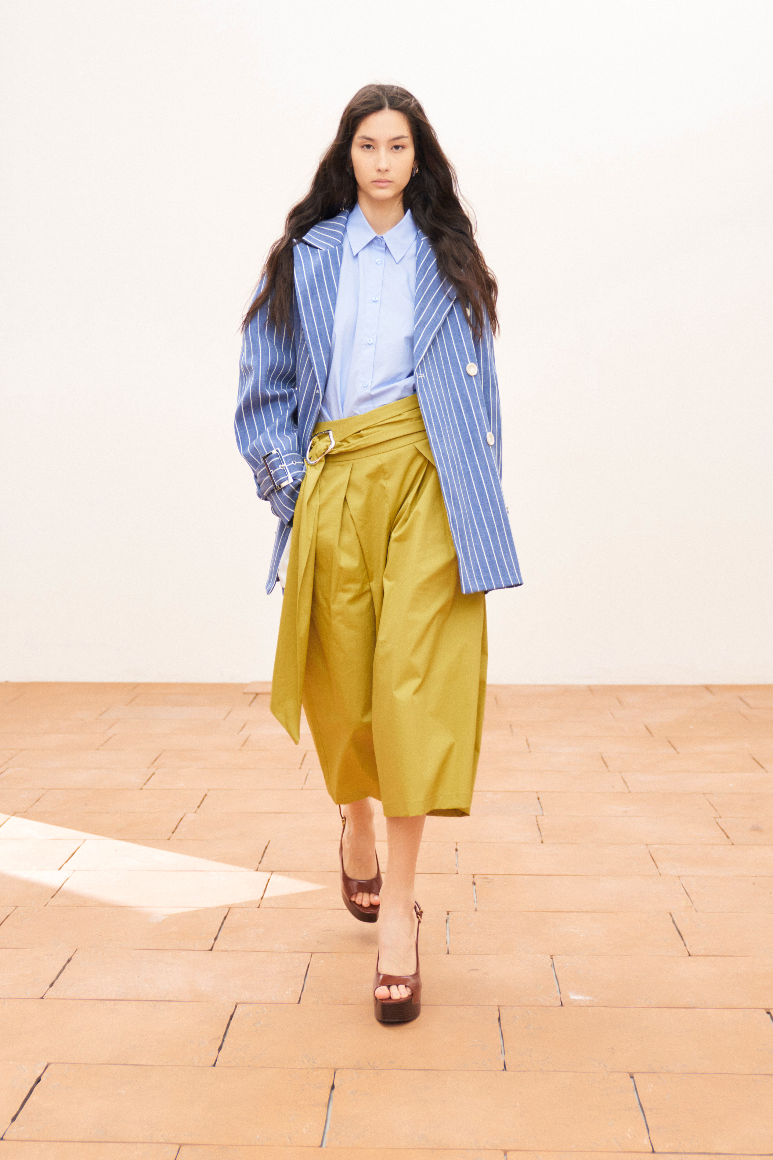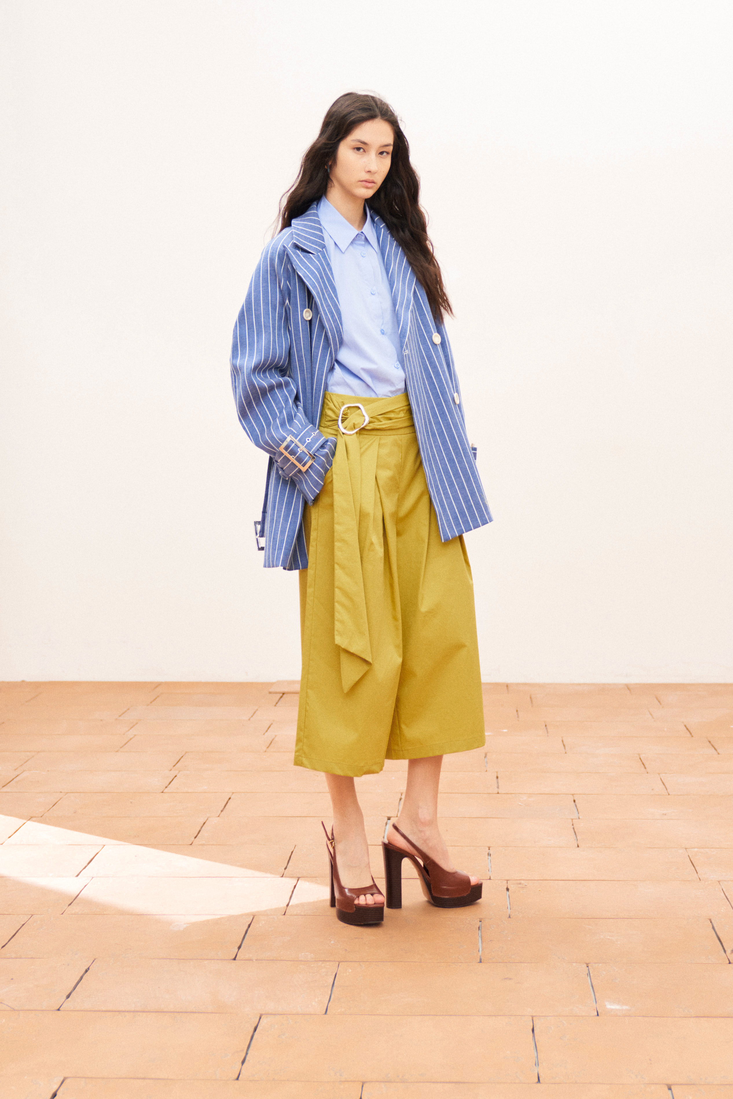 Mandarin collar. Long sleeves with cuffs.