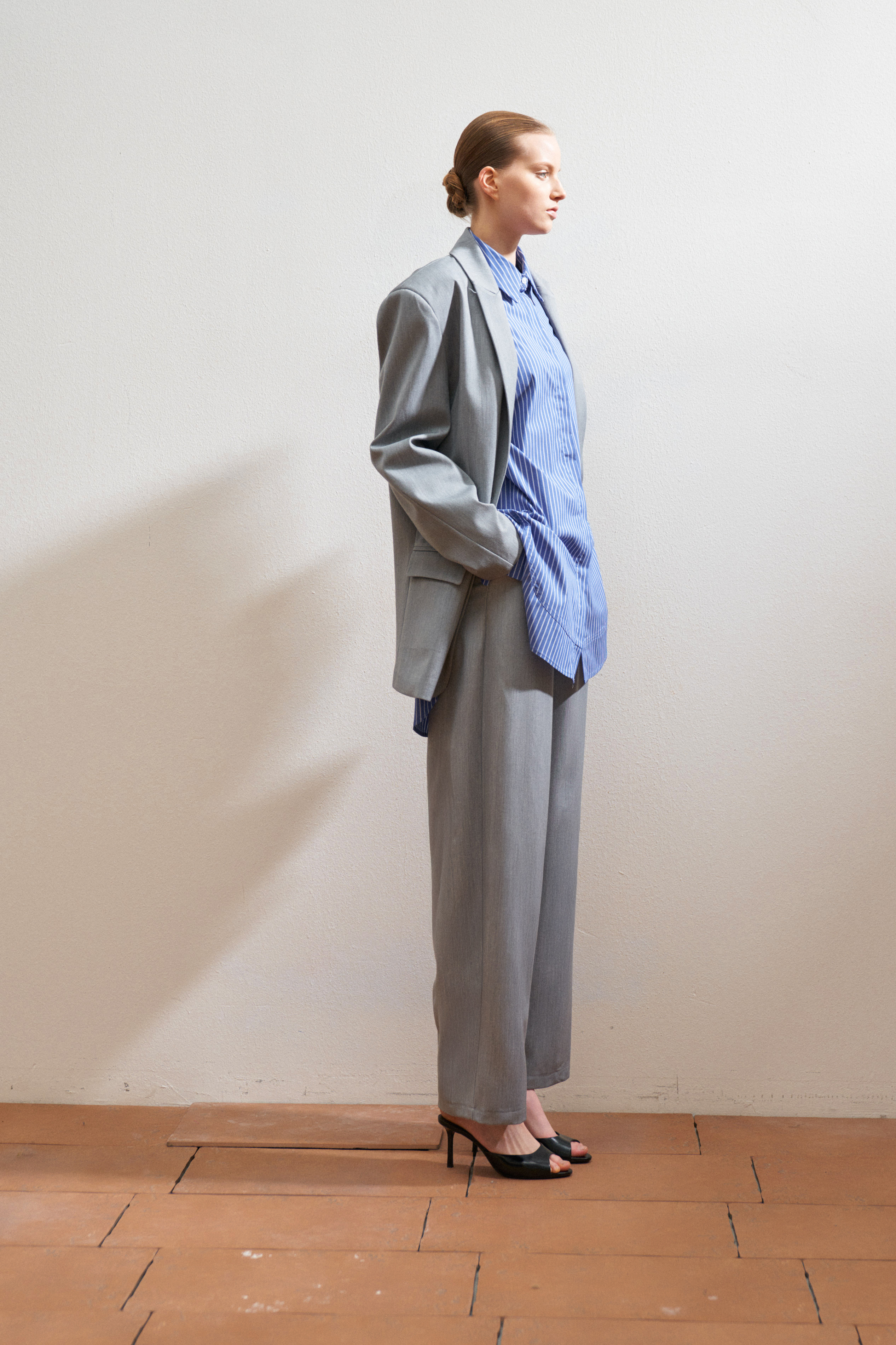 Mandarin collar. Long sleeves with cuffs.