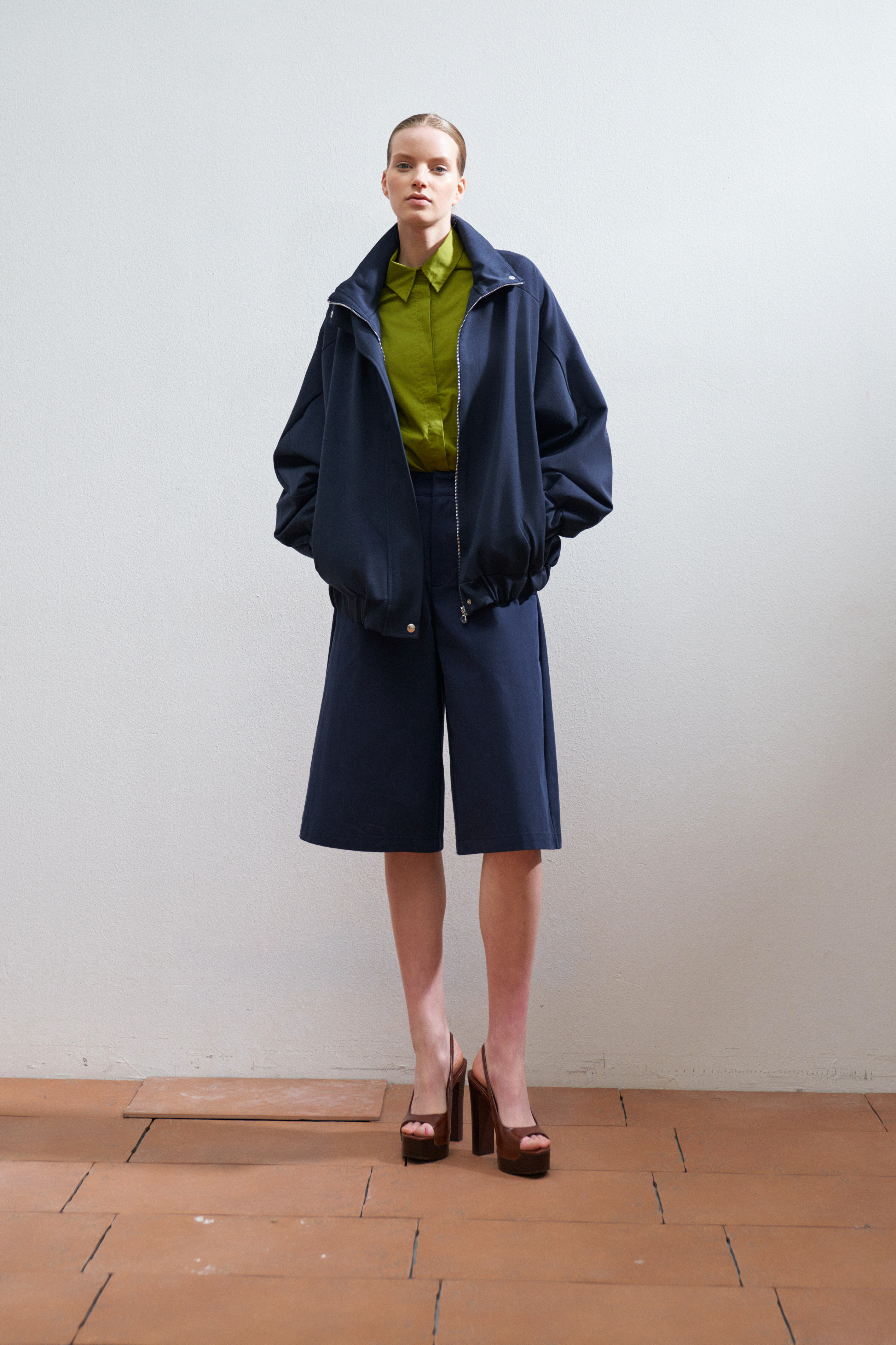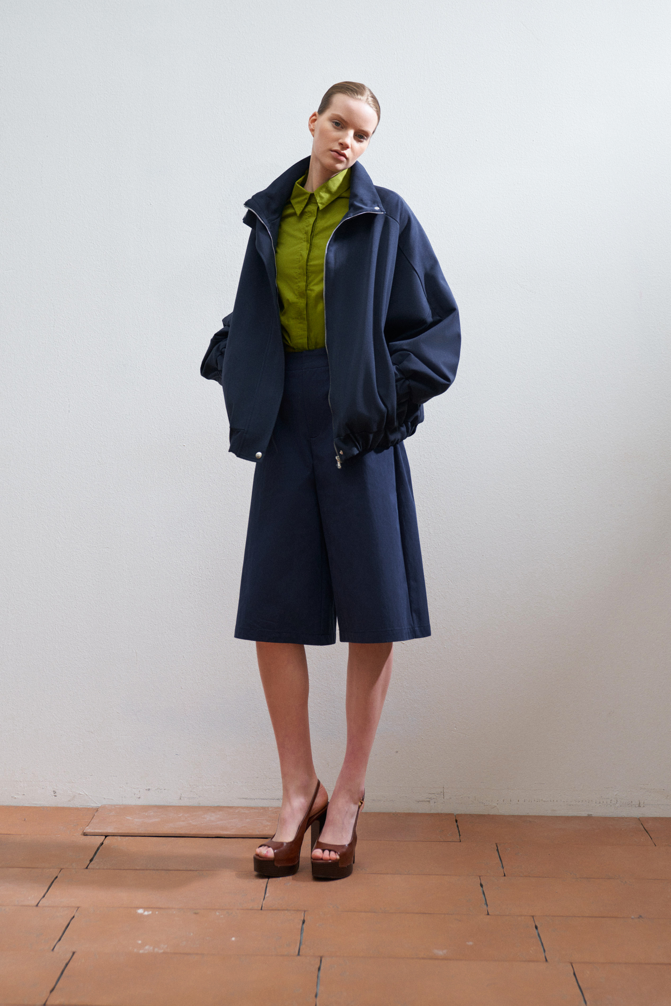 Mandarin collar. Long sleeves with cuffs.
