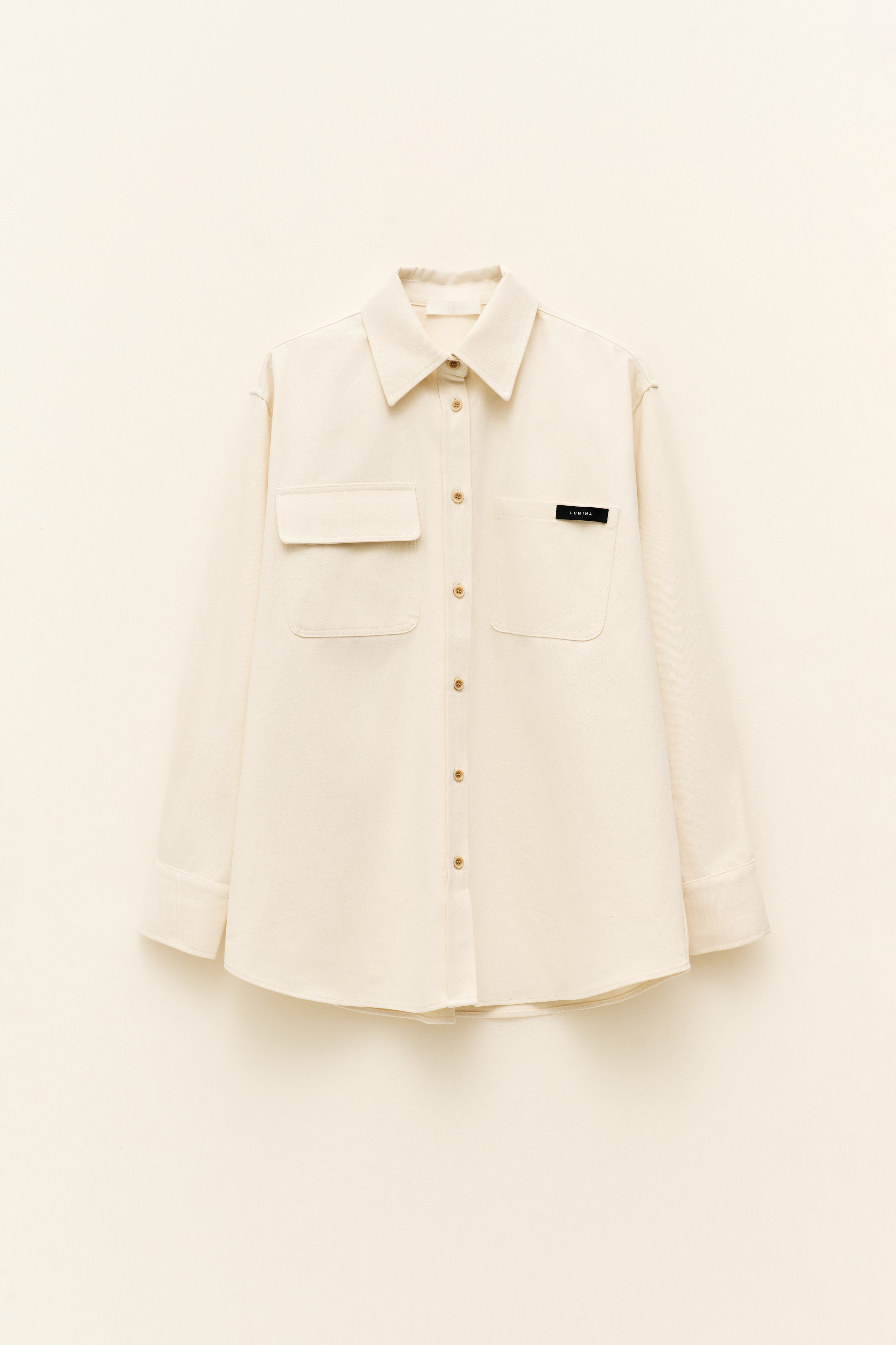 Patch pocket on the chest. Slightly rounded hem.
