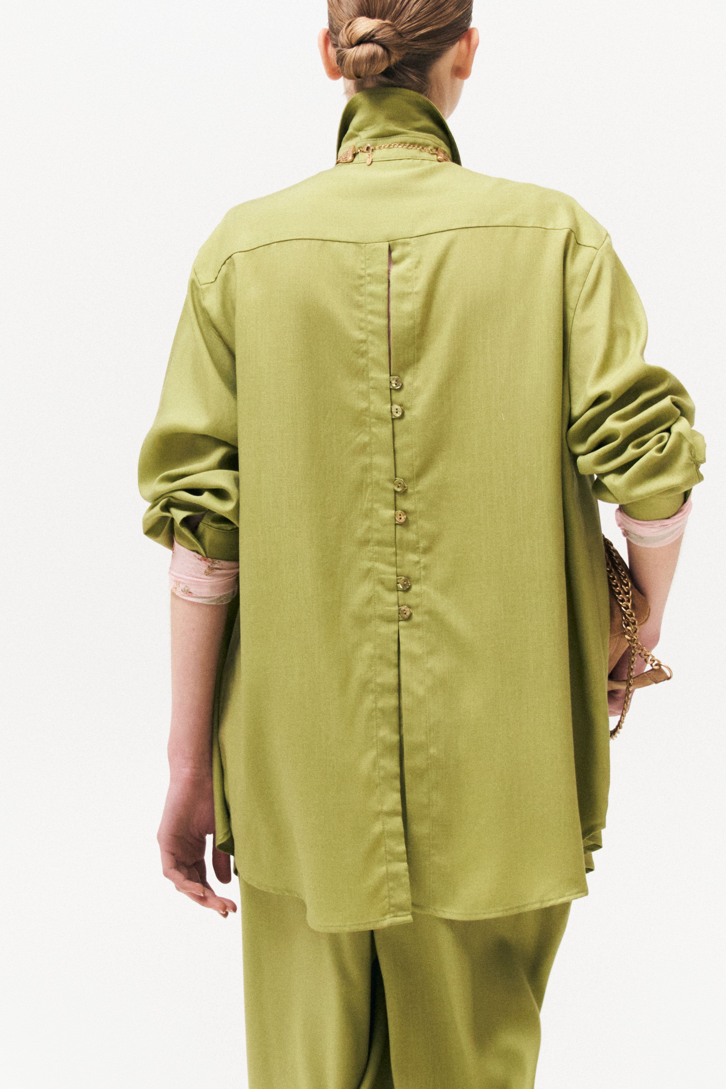 Mandarin collar. Long sleeves with cuffs.
