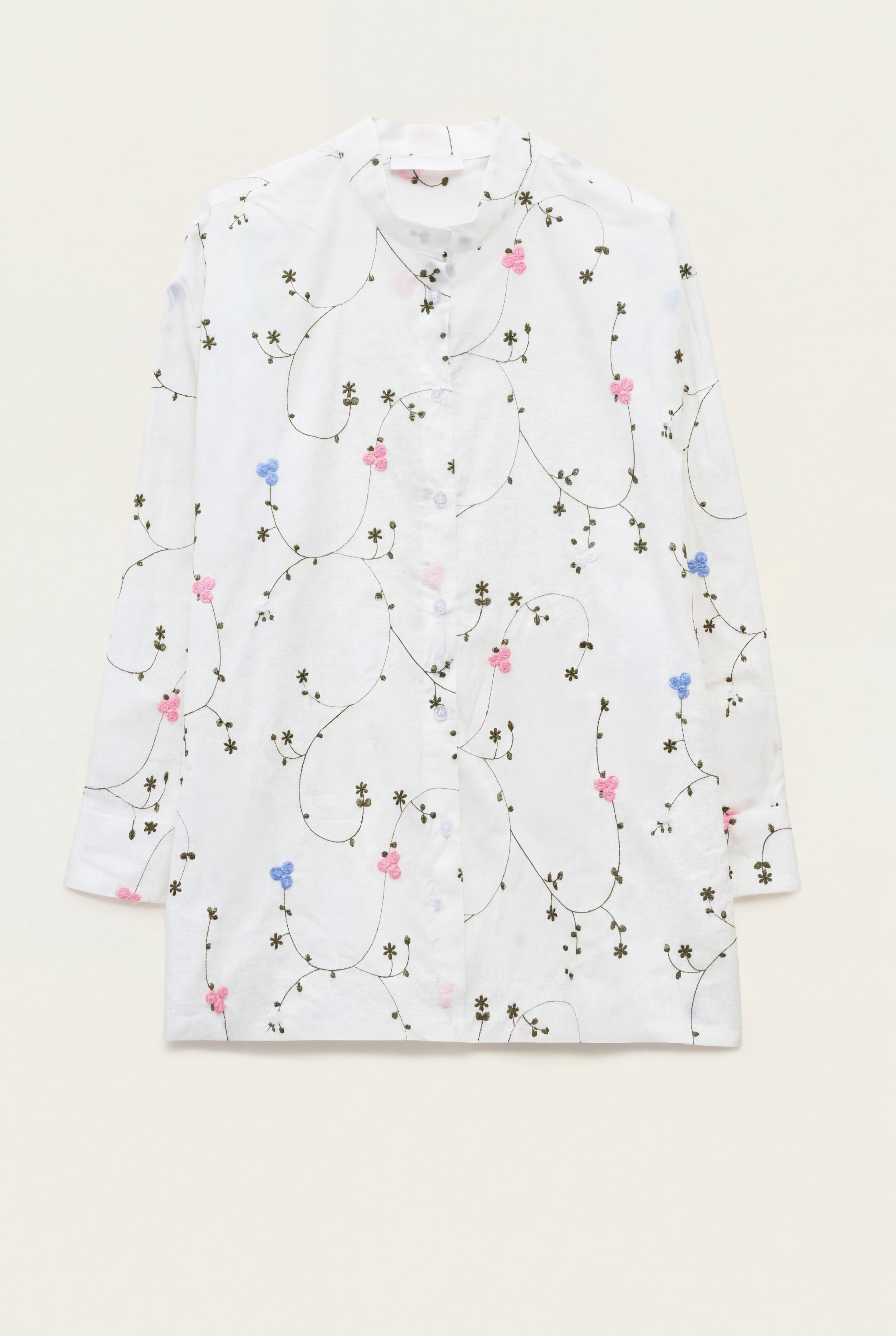 Multi-colored floral embroidered cotton shirt. Mandarin collar. Long sleeves with cuffs. Side slits at the bottom. Front button closure. Regular fit, available in size S/M, M/L.
