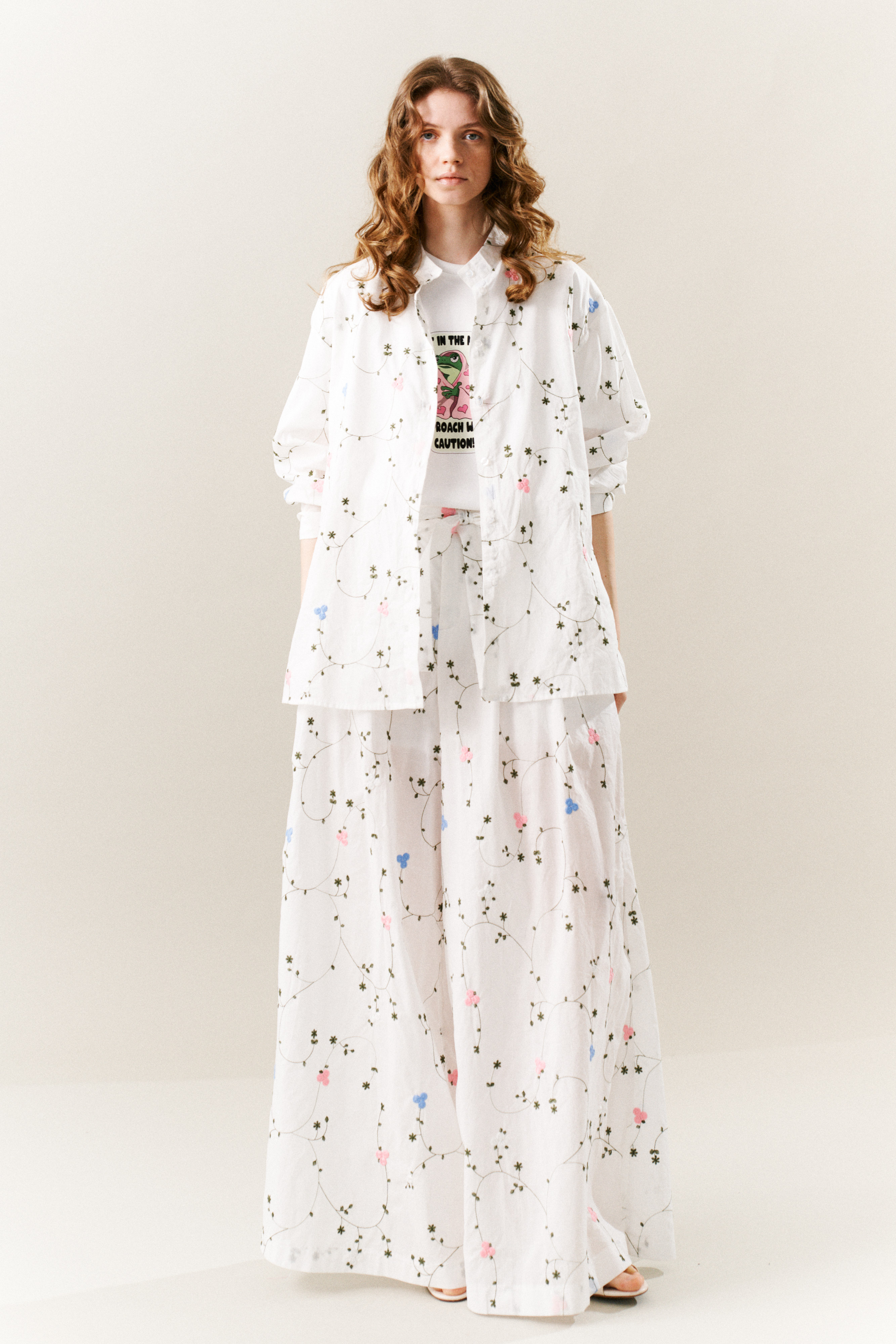 Wide-leg trousers with multicolor floral embroidery in cotton. High waist with belt loops and matching tie belt. Front pleats. Functional side pockets. Front closure with zip, button and hook. Regular fit, available in size S, M, L.