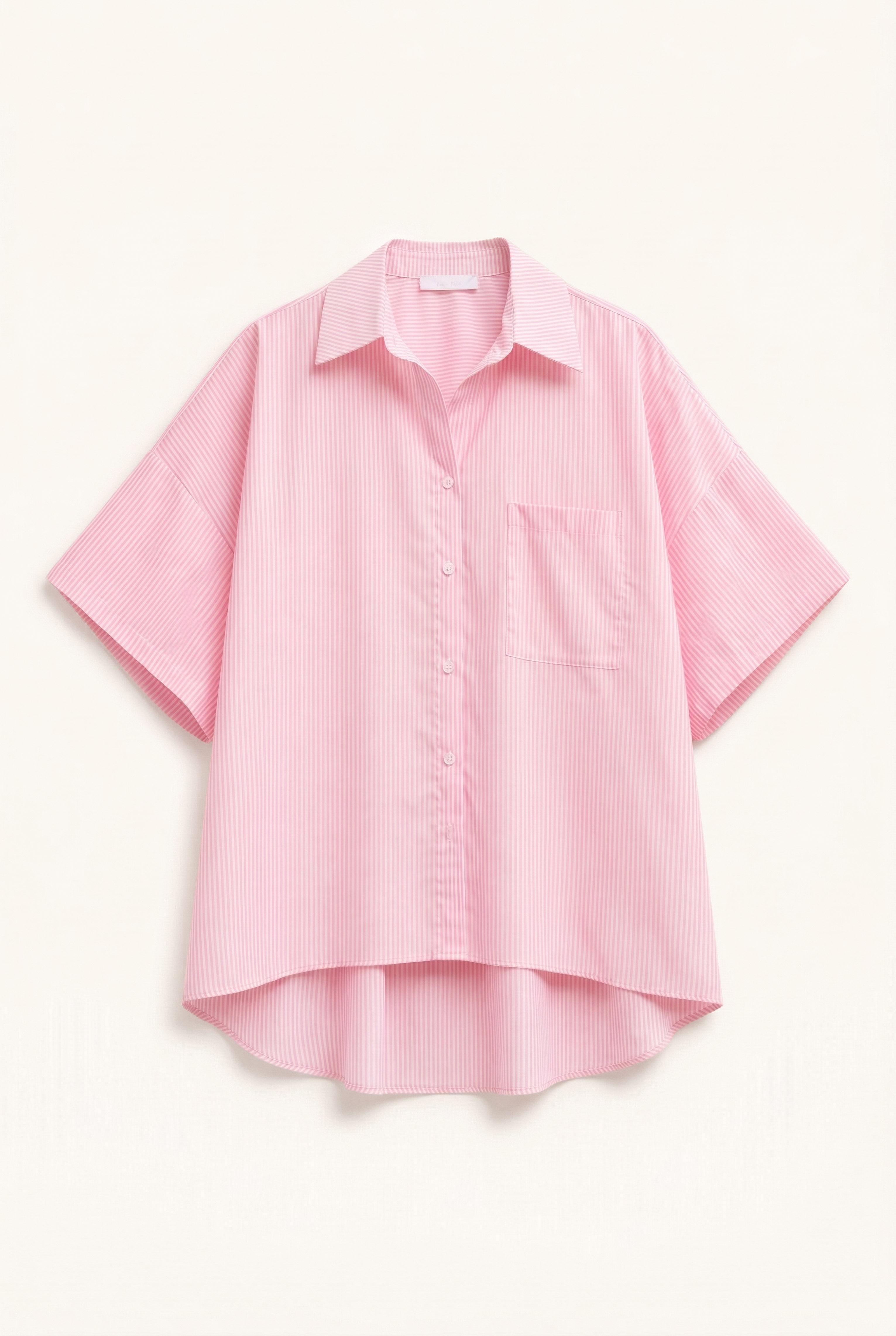Oversized shirt with vertical striped pattern. Pointed collar. Short sleeves with dropped shoulders. Patch pocket on the left side of the chest. Rounded bottom with slightly longer back. Front button fastening. Regular fit, available in ONE size.