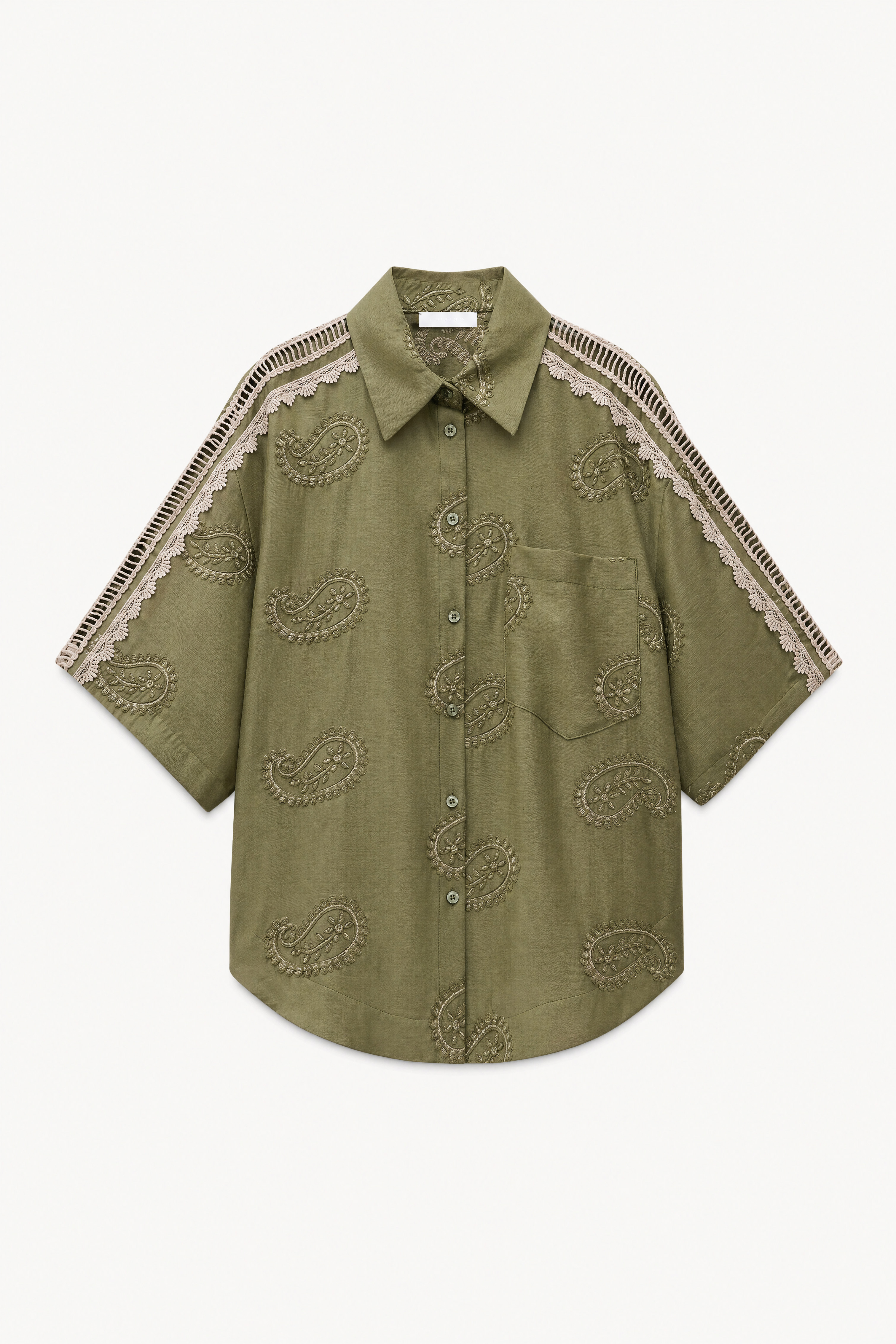 Linen blend shirt with all-over paisley embroidery. Pointed collar. Wide short sleeves with dropped shoulders. Crochet side inserts with openwork workmanship. Patch pocket on the chest. Front button closure. Regular fit, available in ONE size.