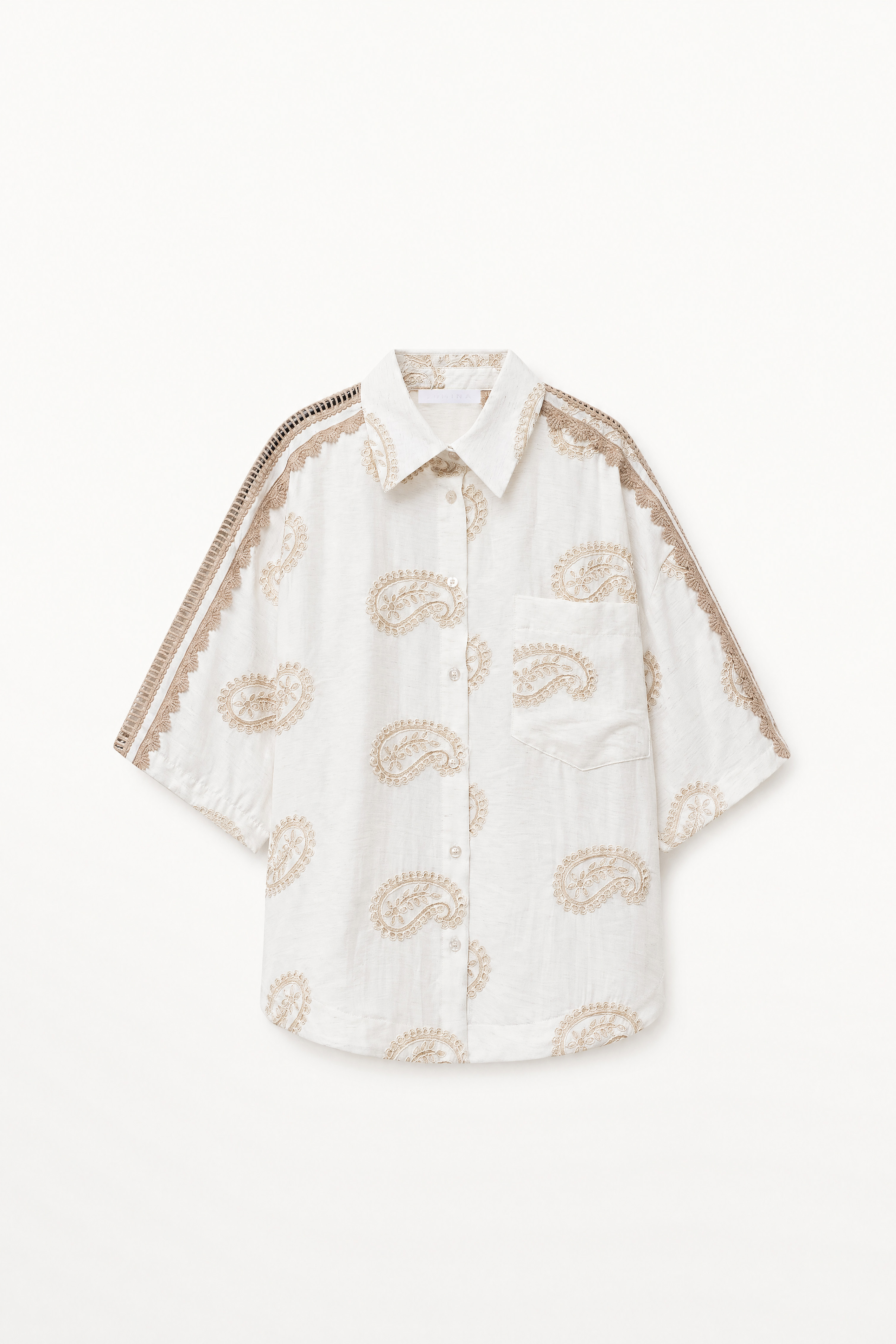 Linen blend shirt with all-over paisley embroidery. Pointed collar. Wide short sleeves with dropped shoulders. Crochet side inserts with openwork workmanship. Patch pocket on the chest. Front button closure. Regular fit, available in ONE size.