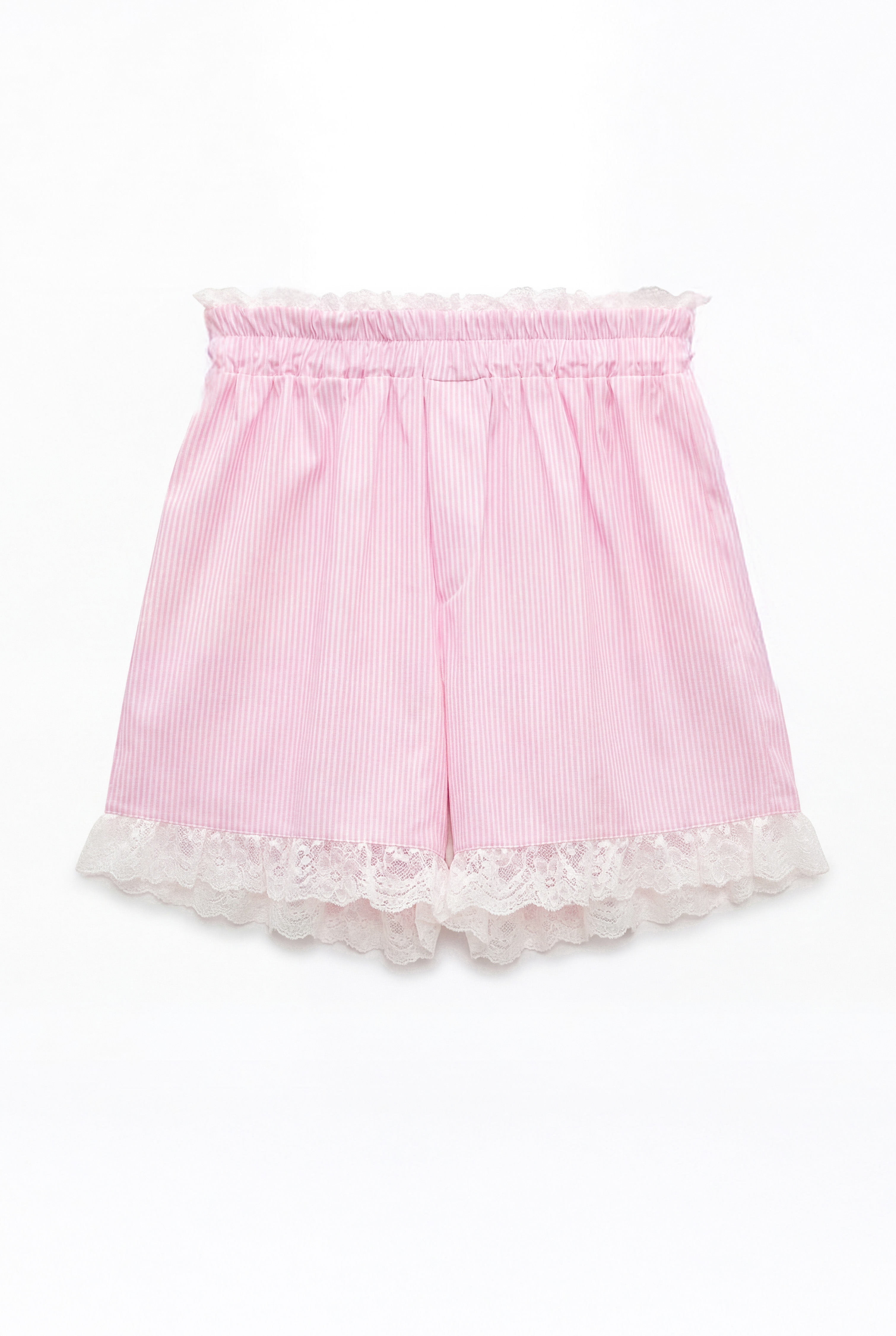 Shorts with vertical striped pattern. Elasticated waist with lace trim. Bottom with floral lace insert with a ruffle effect. Regular fit, available in size S/M, M/L.