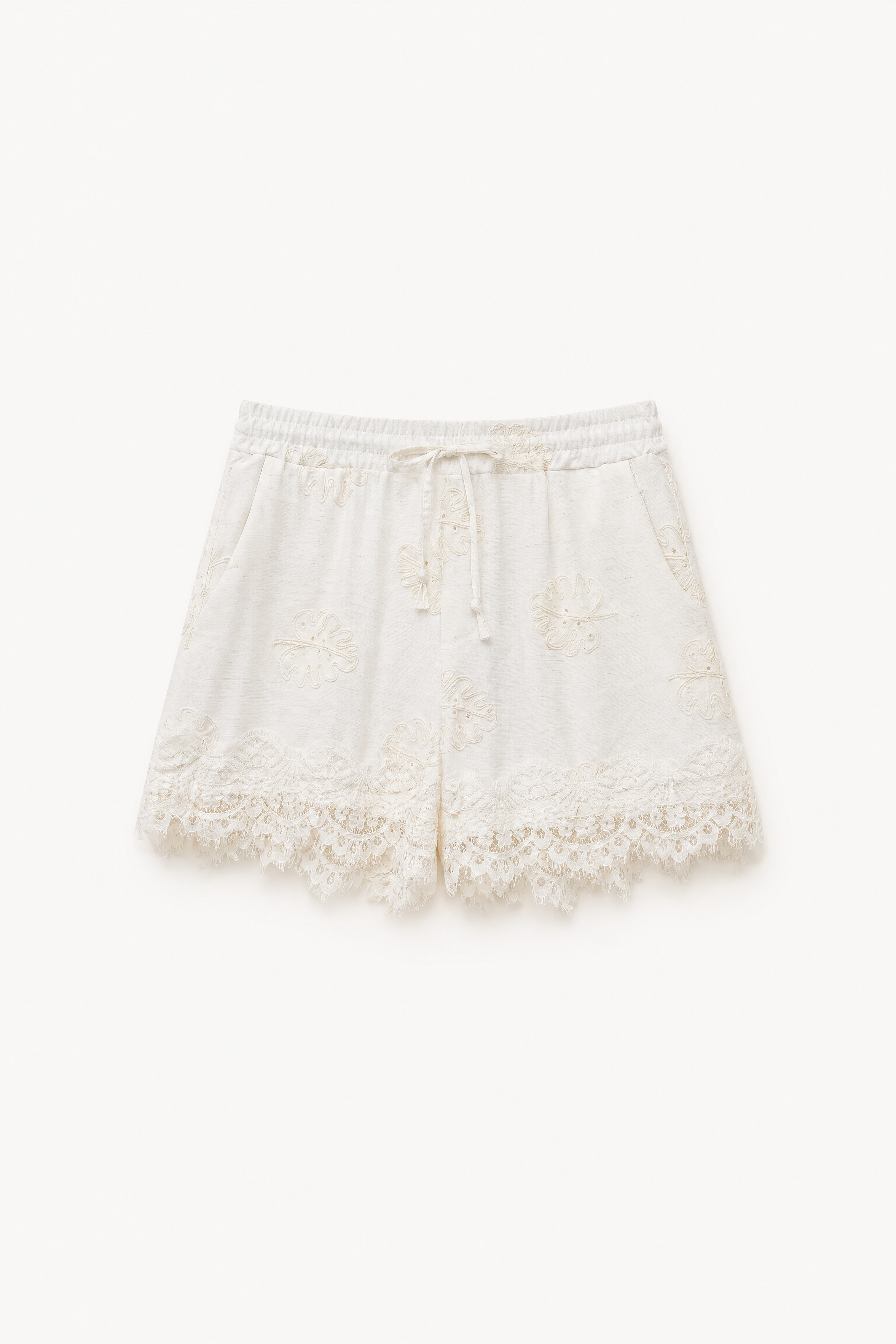 Linen blend shorts with raised embroidery.