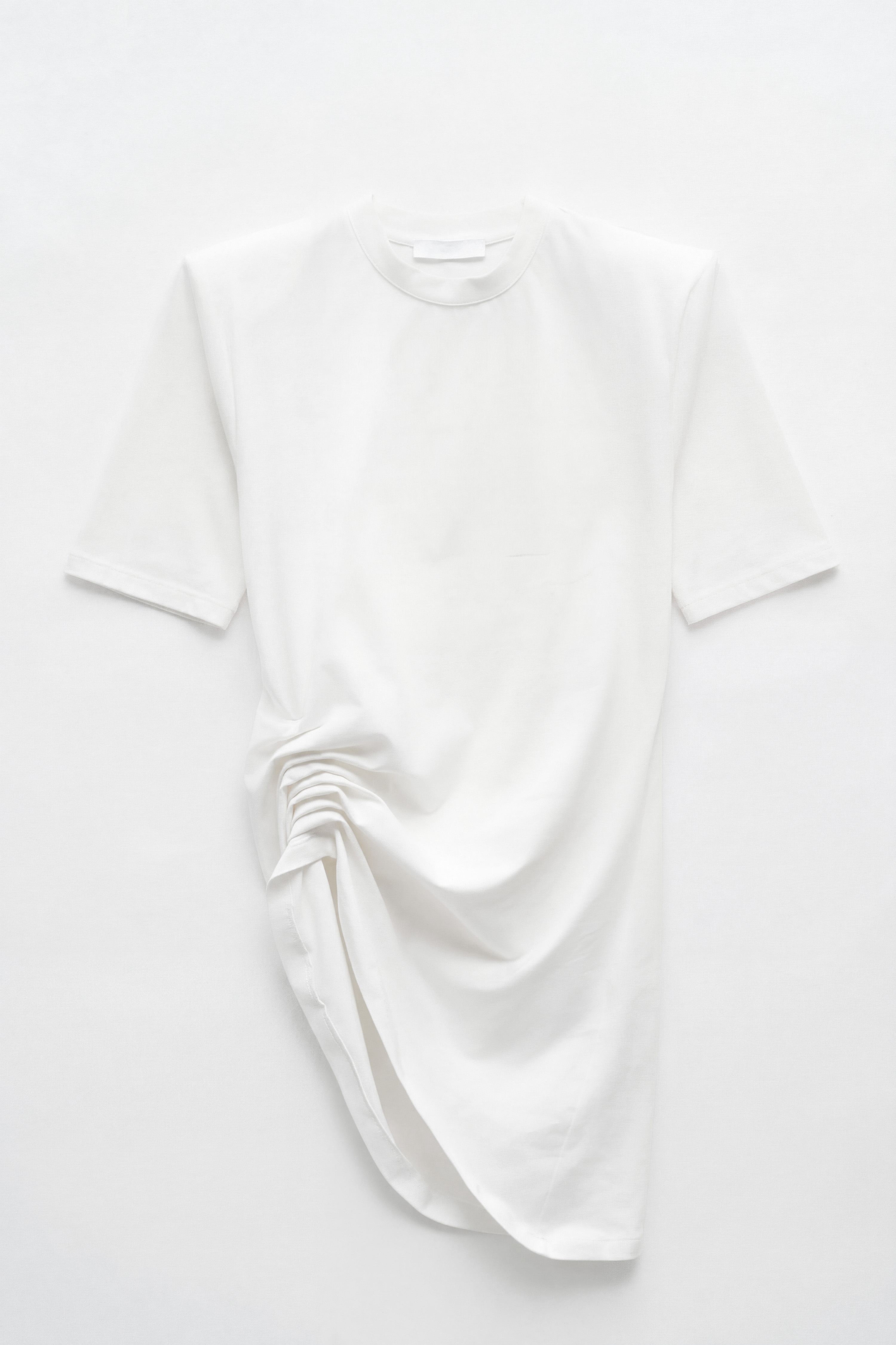 Asymmetrical T-shirt with side drape and gathered detail.