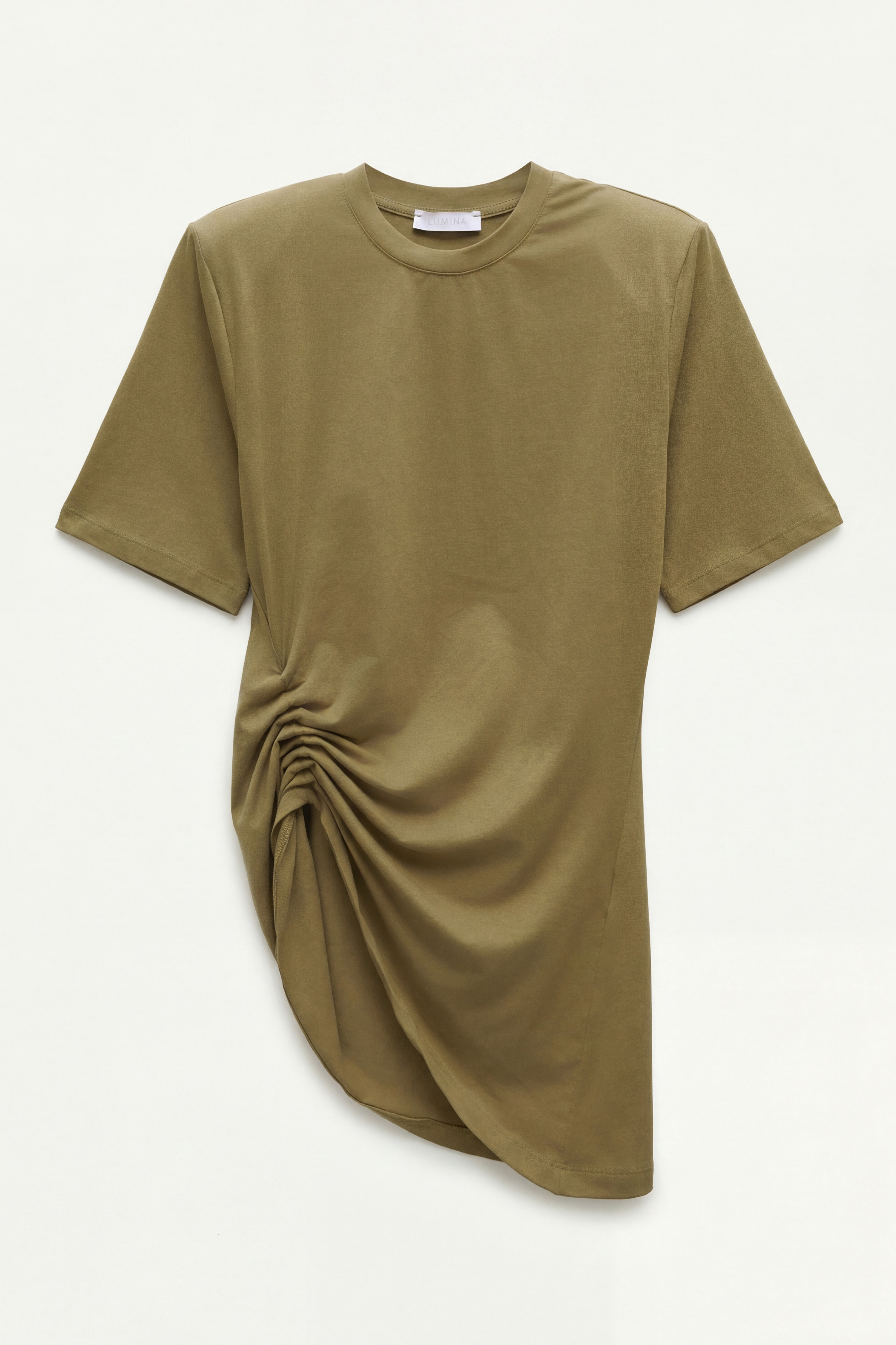 Asymmetrical T-shirt with side drape and gathered detail.