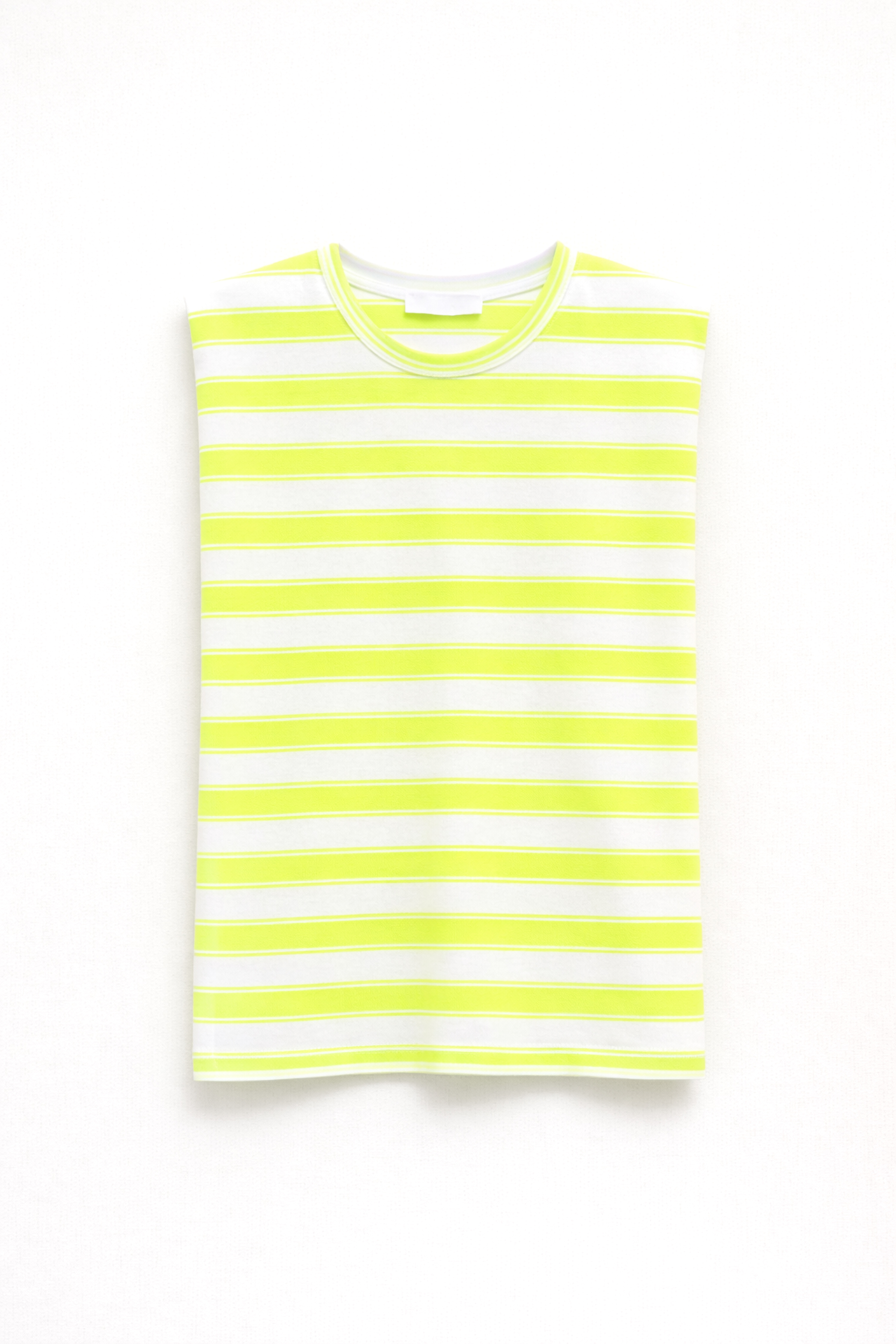 Crew neck T-shirt with fluorescent striped pattern.
