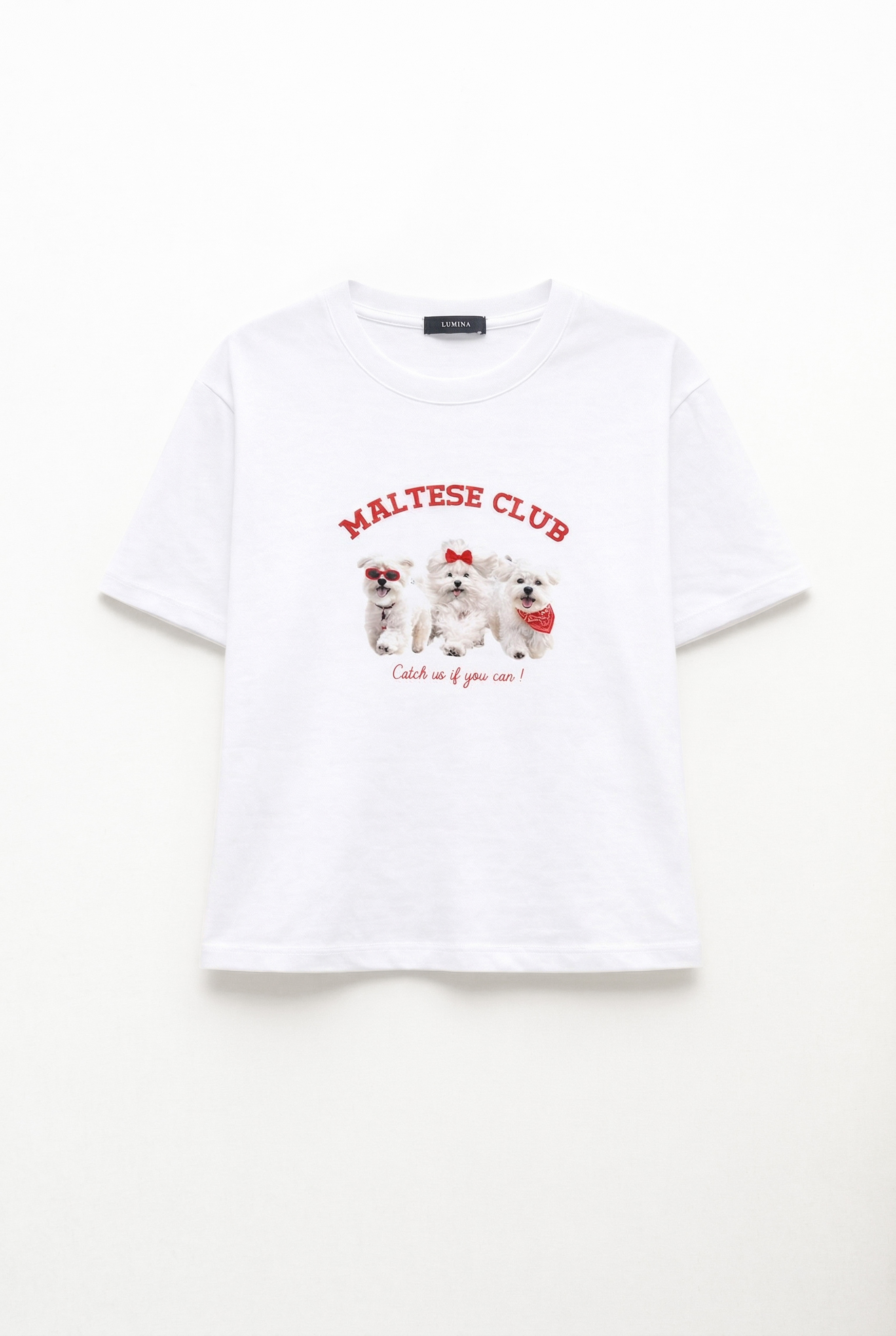 Crew neck, short-sleeved cotton T-shirt with print on the front.