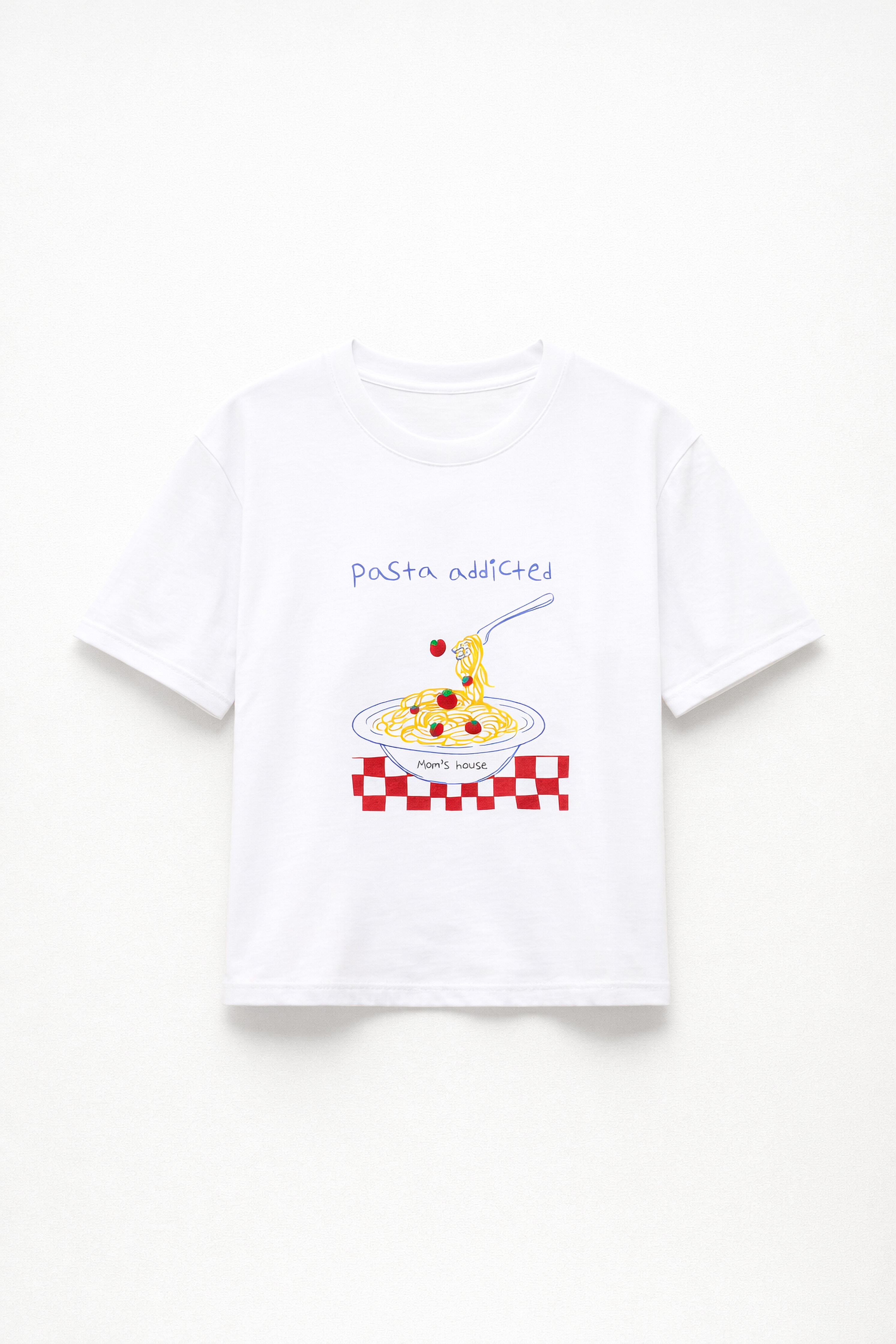 Crew neck, short-sleeved cotton T-shirt with print on the front.