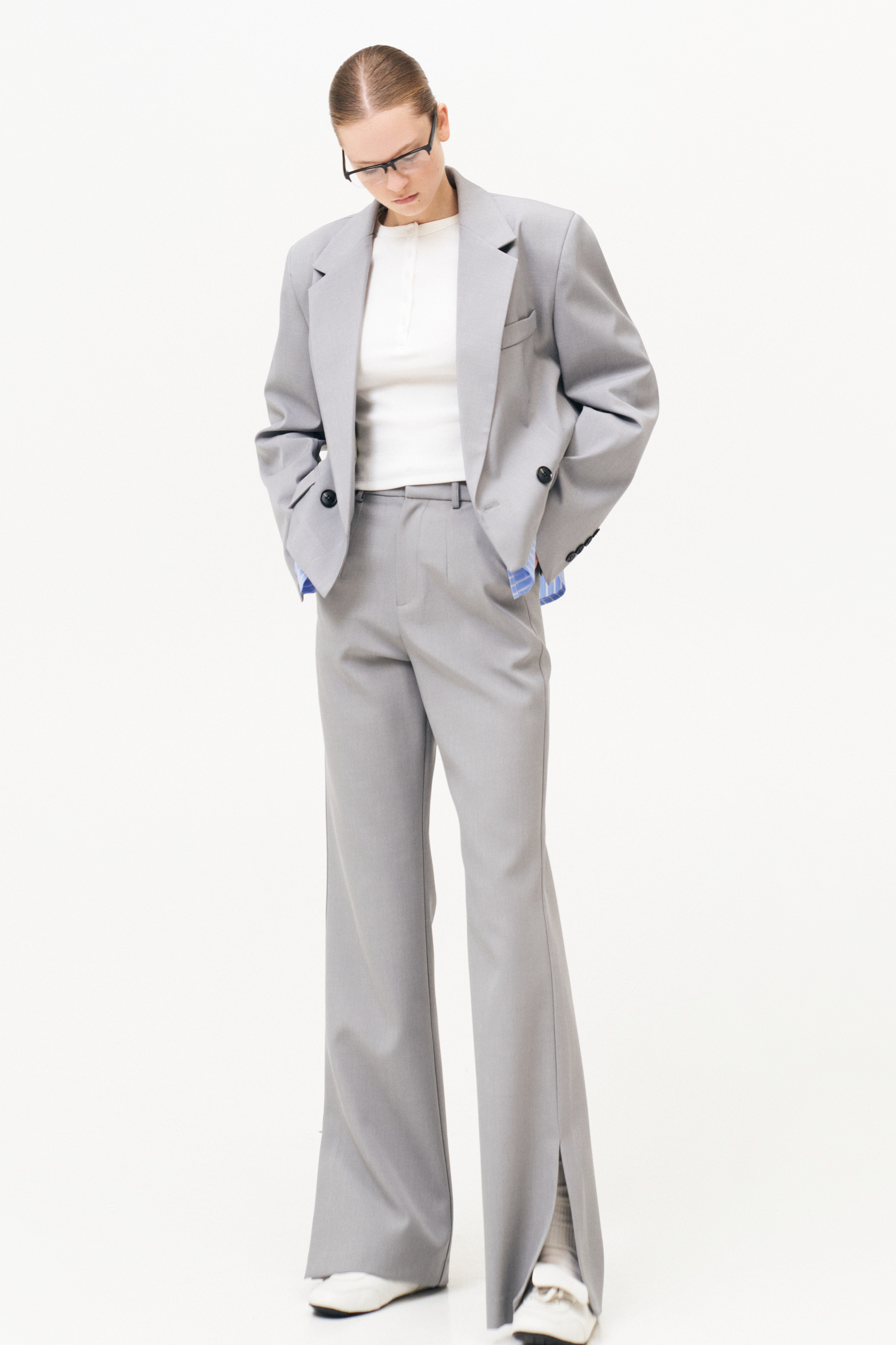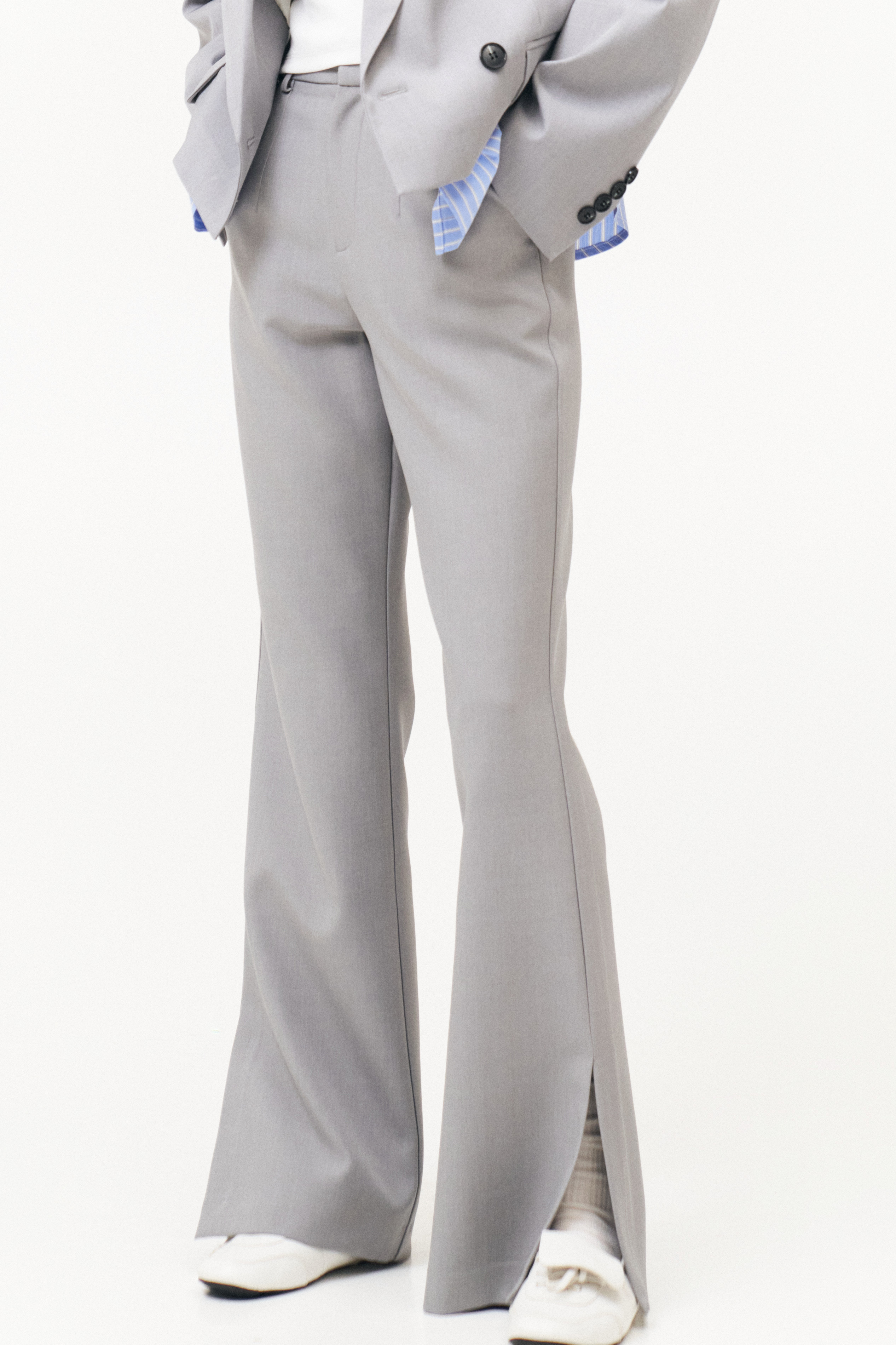 Long trousers with side slits at the bottom.
