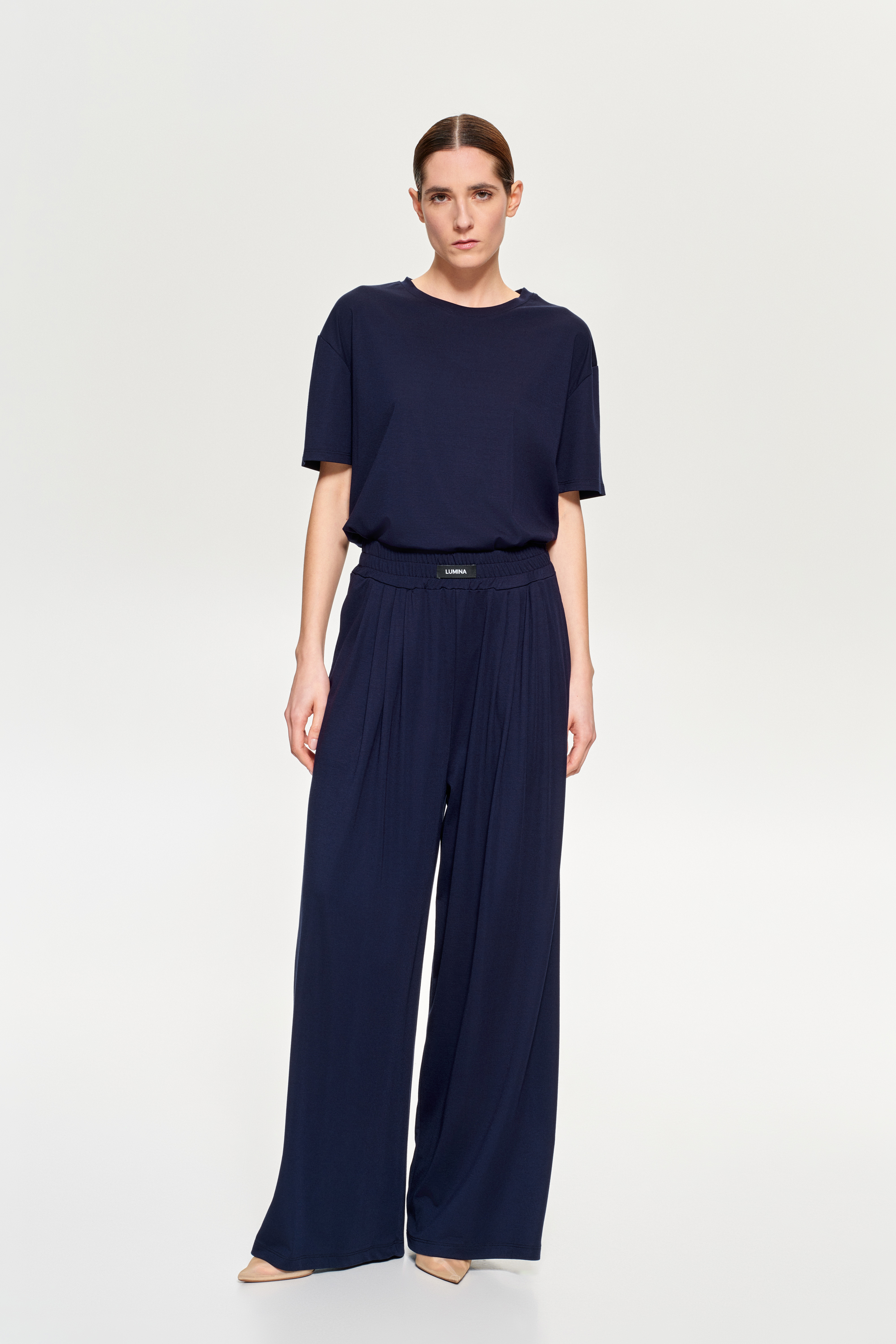 Wide-leg palazzo trousers.