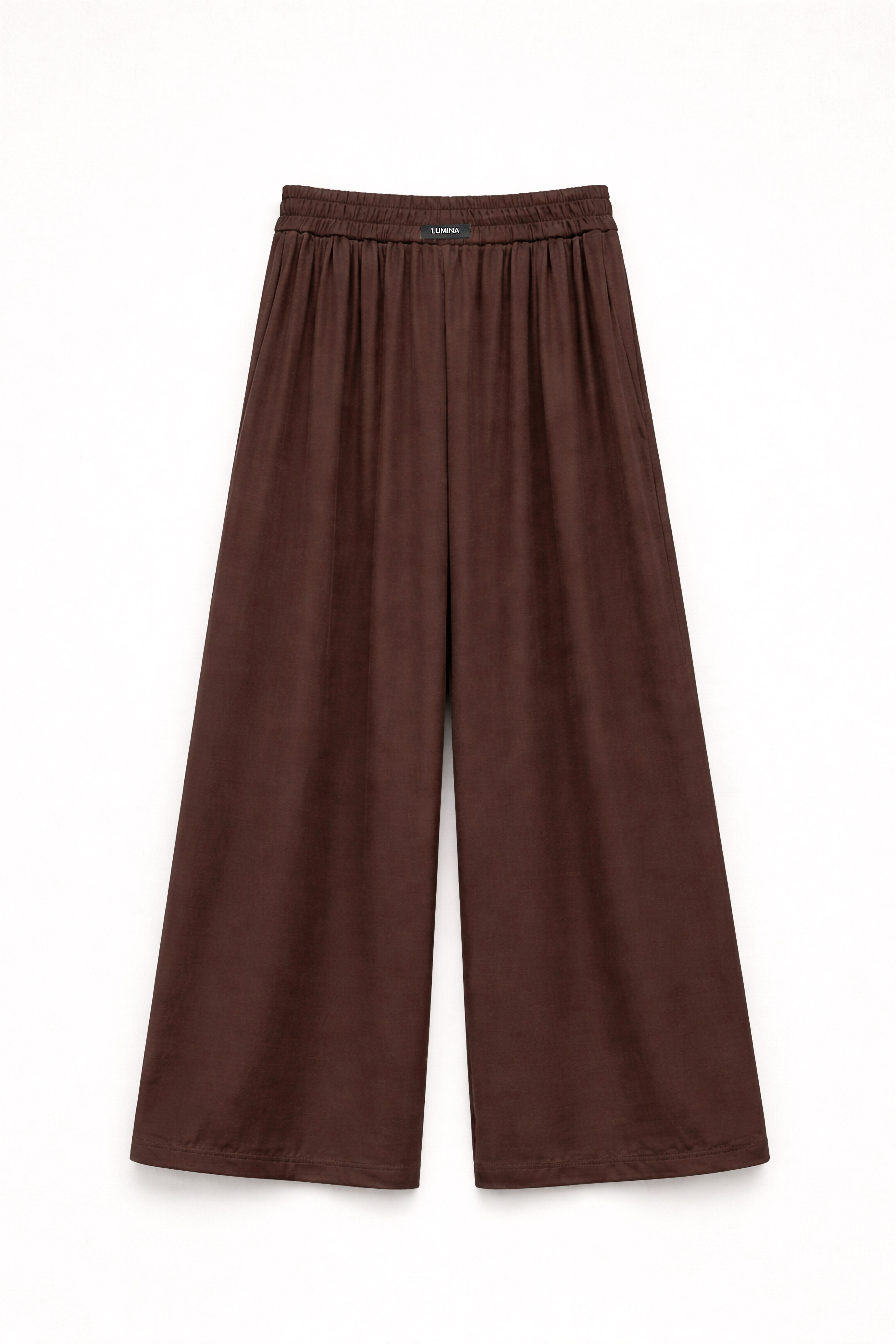 Features an elastic waistband at the back. Wide leg.