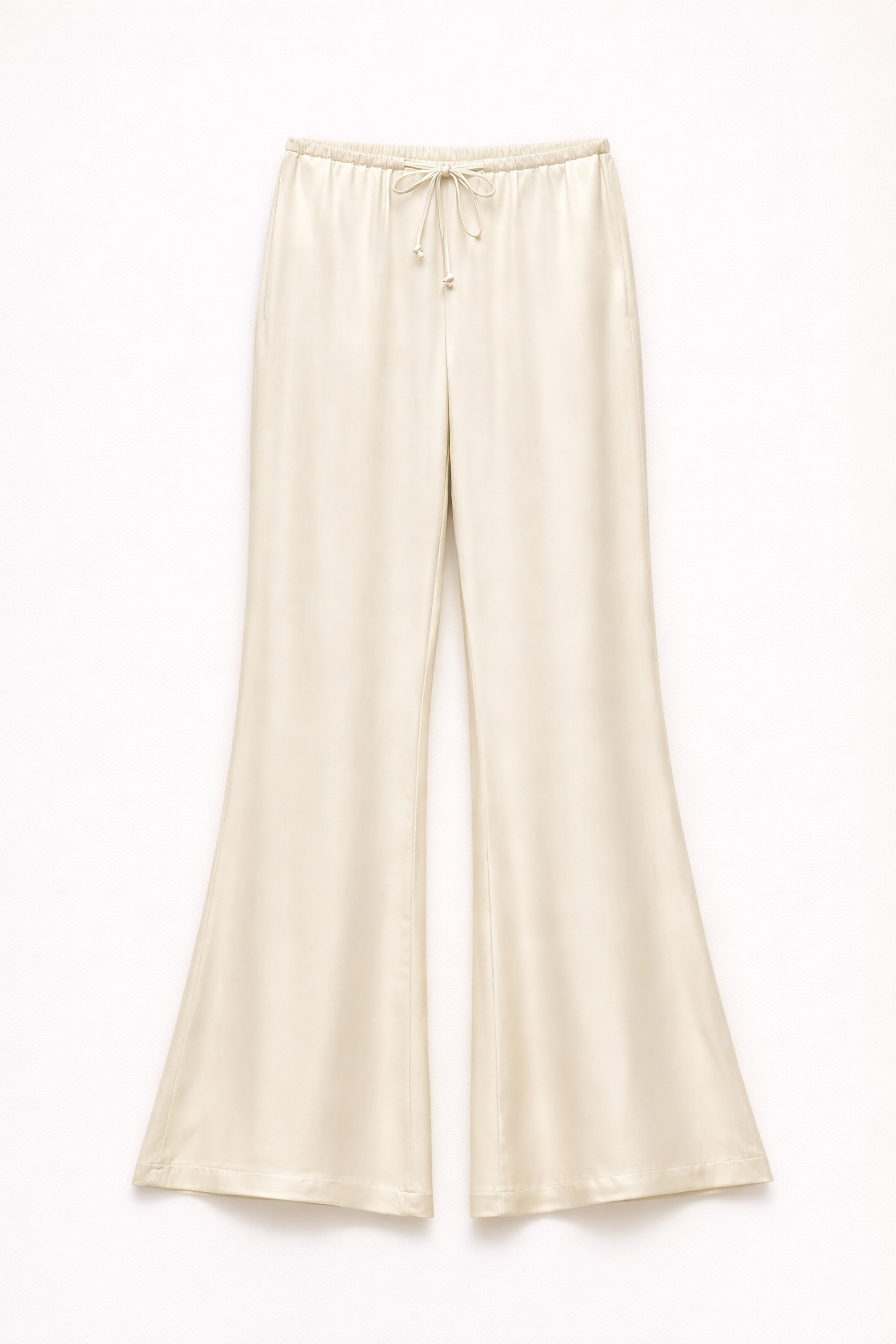 Flared trousers with elasticated waist and adjustable drawstring.