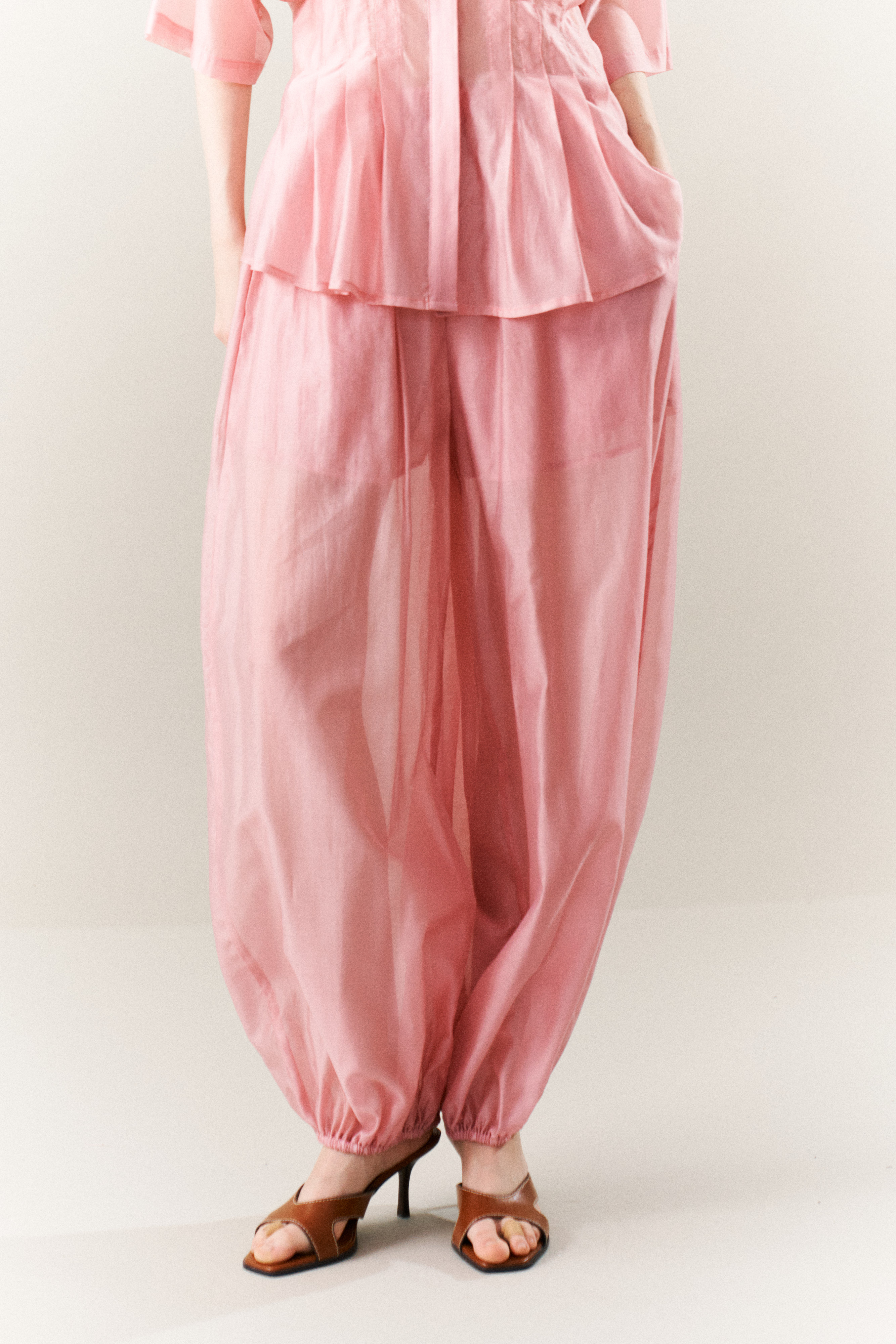 Balloon trousers in satin and lyocell blend fabric.