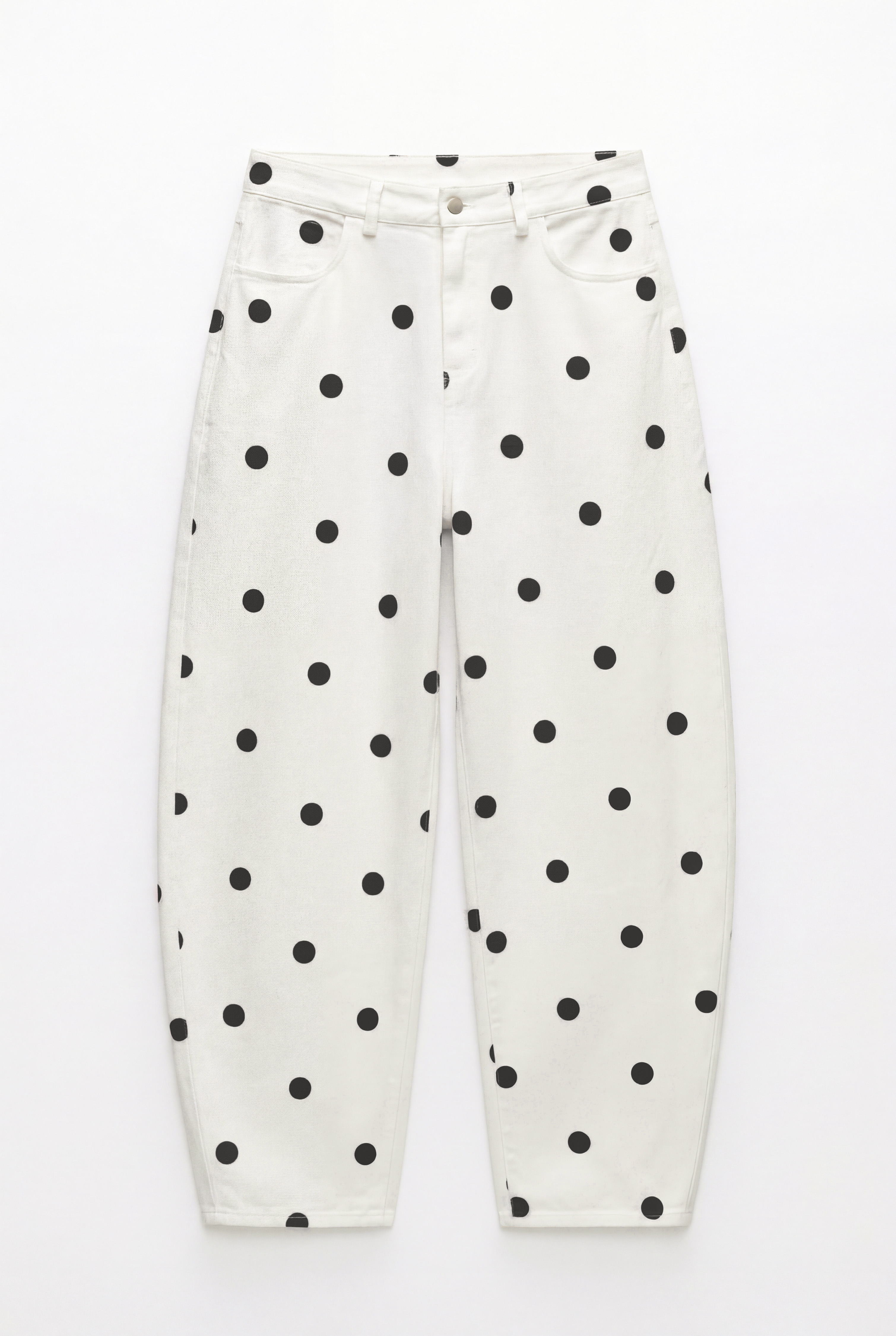 Denim trousers with all-over polka dot print. Regular waist with belt loops. Front inset pockets and two back patch pockets. Soft leg with a slightly rounded line. Front closure with zip and button. Regular fit, available in size S, M, L.