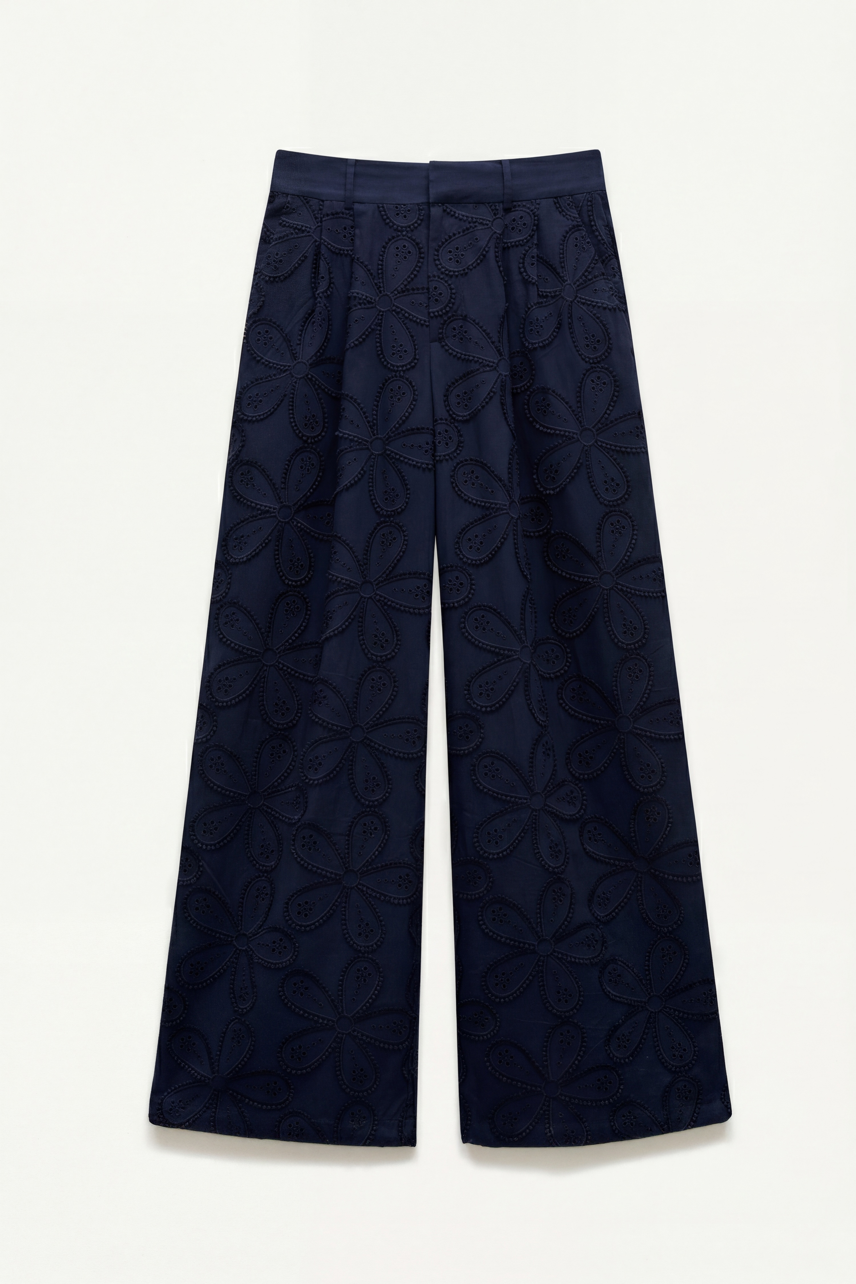 Sangallo trousers with floral motif. High waist with belt loops. Functional side pockets. Welt back pockets. Front closure with zip, hook and button. Regular fit, available in size S, M, L.