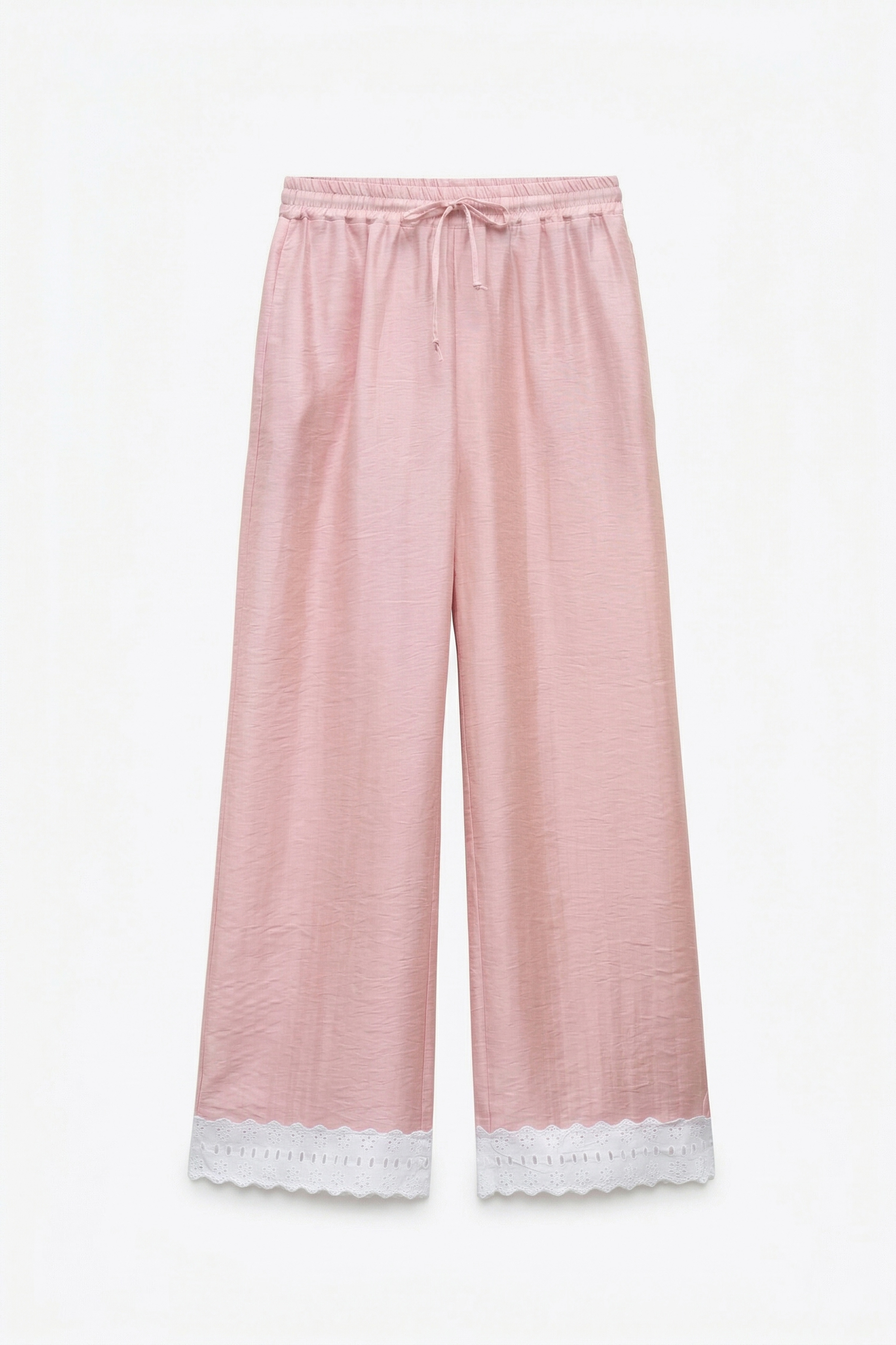 Trousers with vertical striped pattern. Elasticated high waist with gathers. Front slits at the bottom of the leg with insert in contrasting floral lace with a transparent effect. Adjustable laces at the bottom to modulate the slit. Regular fit, available in size S/M, M/L.