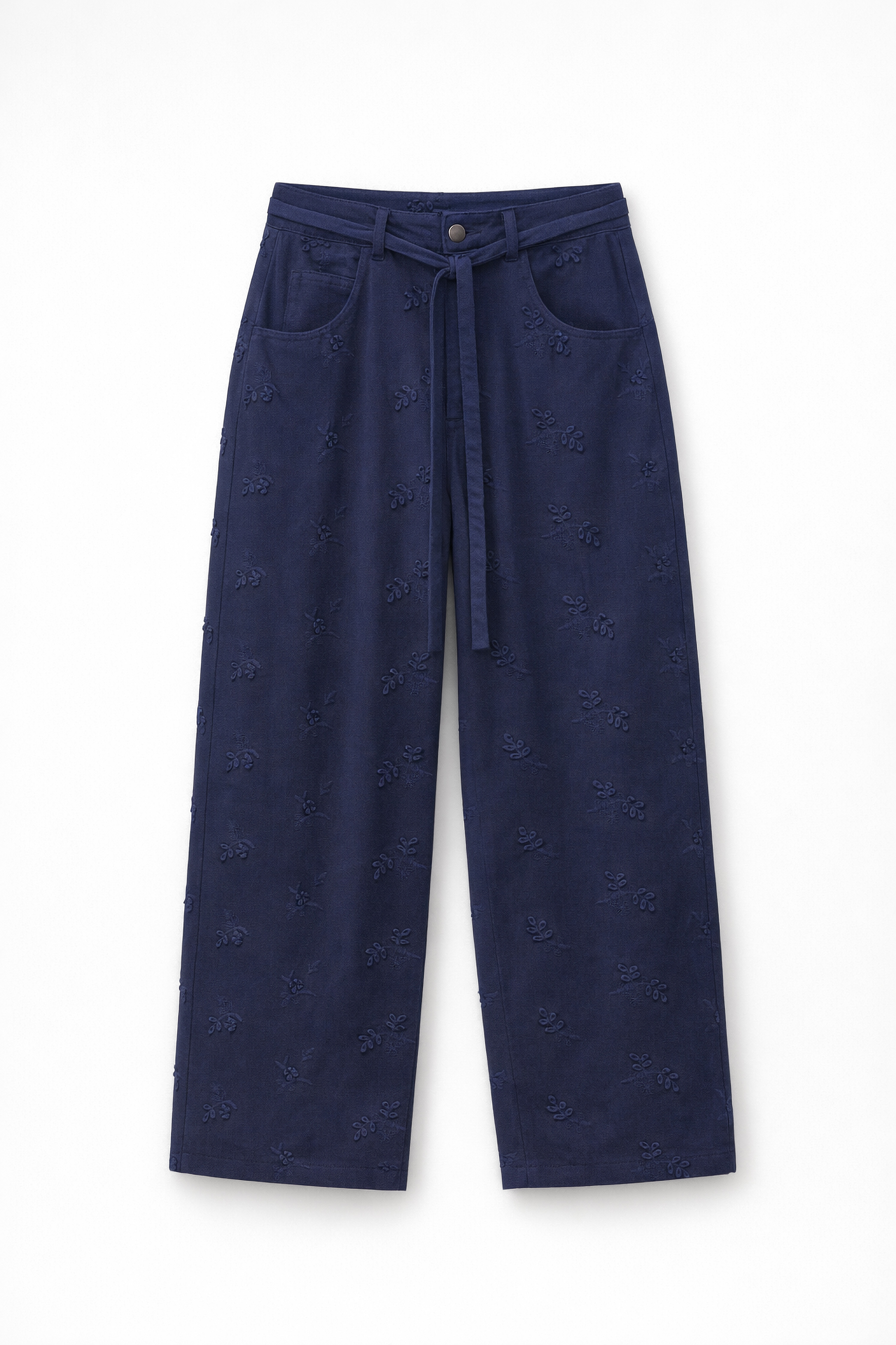 Structured trousers with raised floral embroidery.