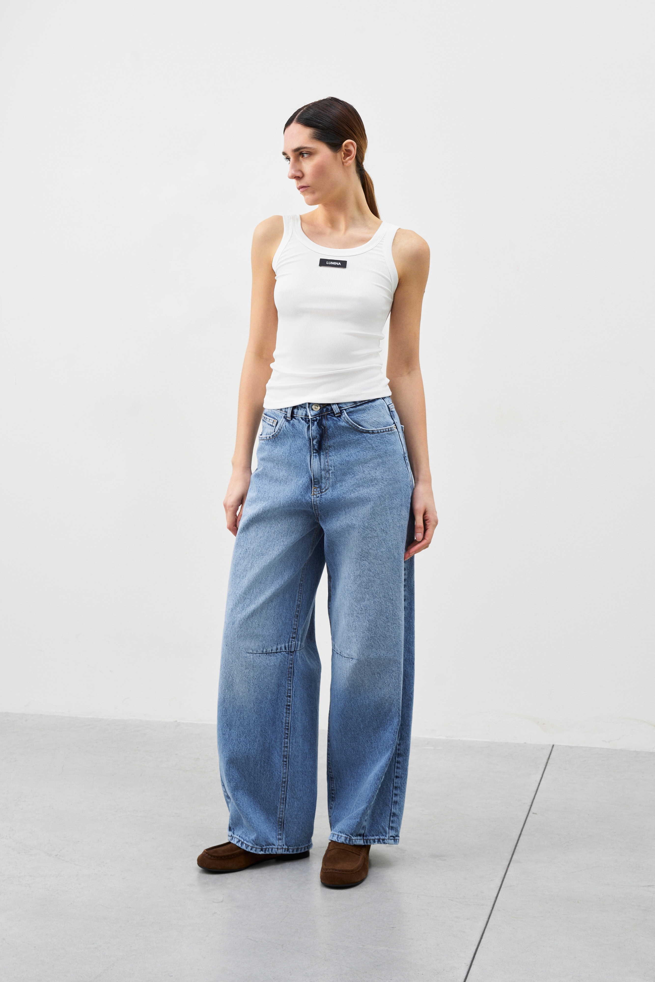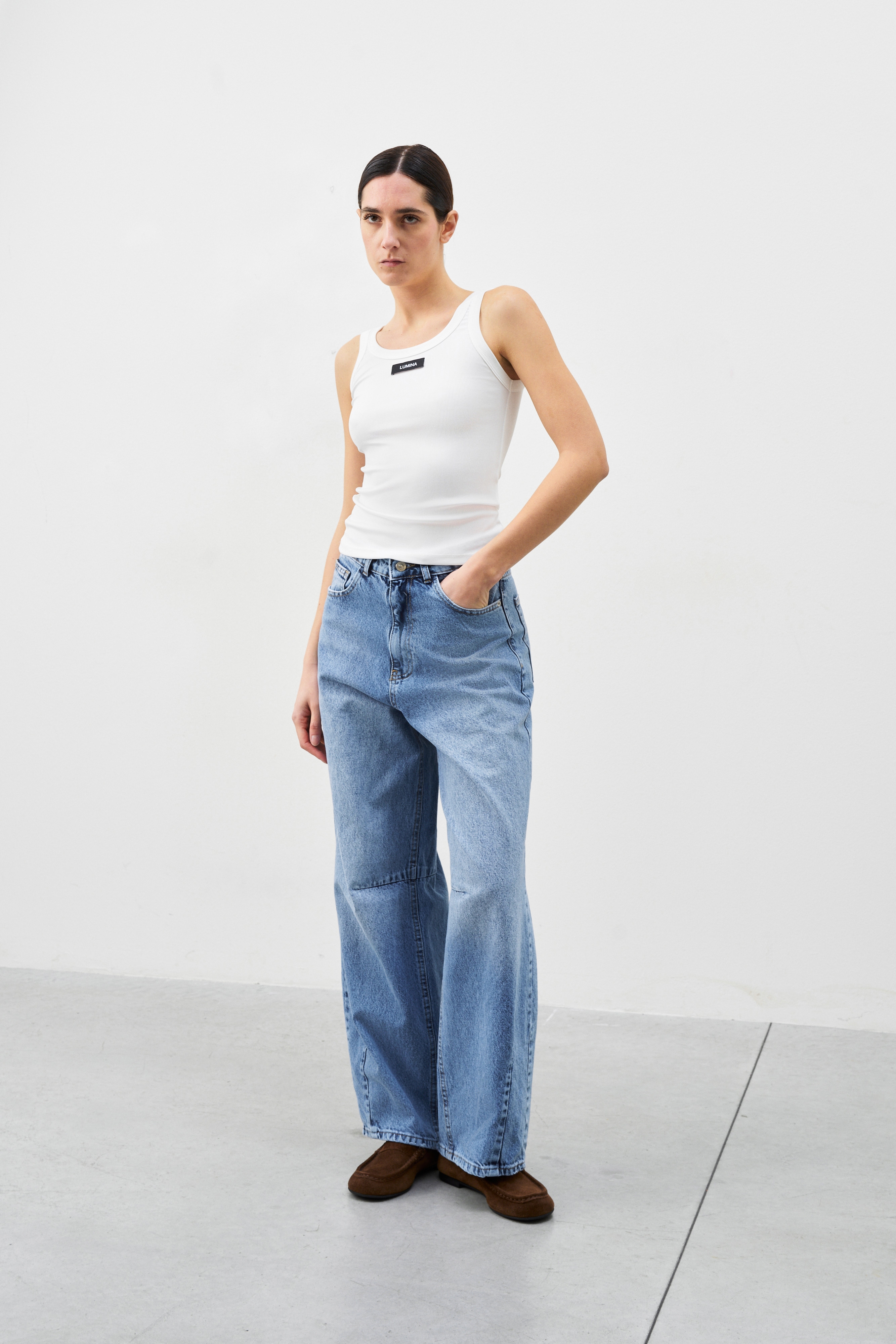 Wide neckline, wide shoulder straps, straight hem finished with lace inserts.