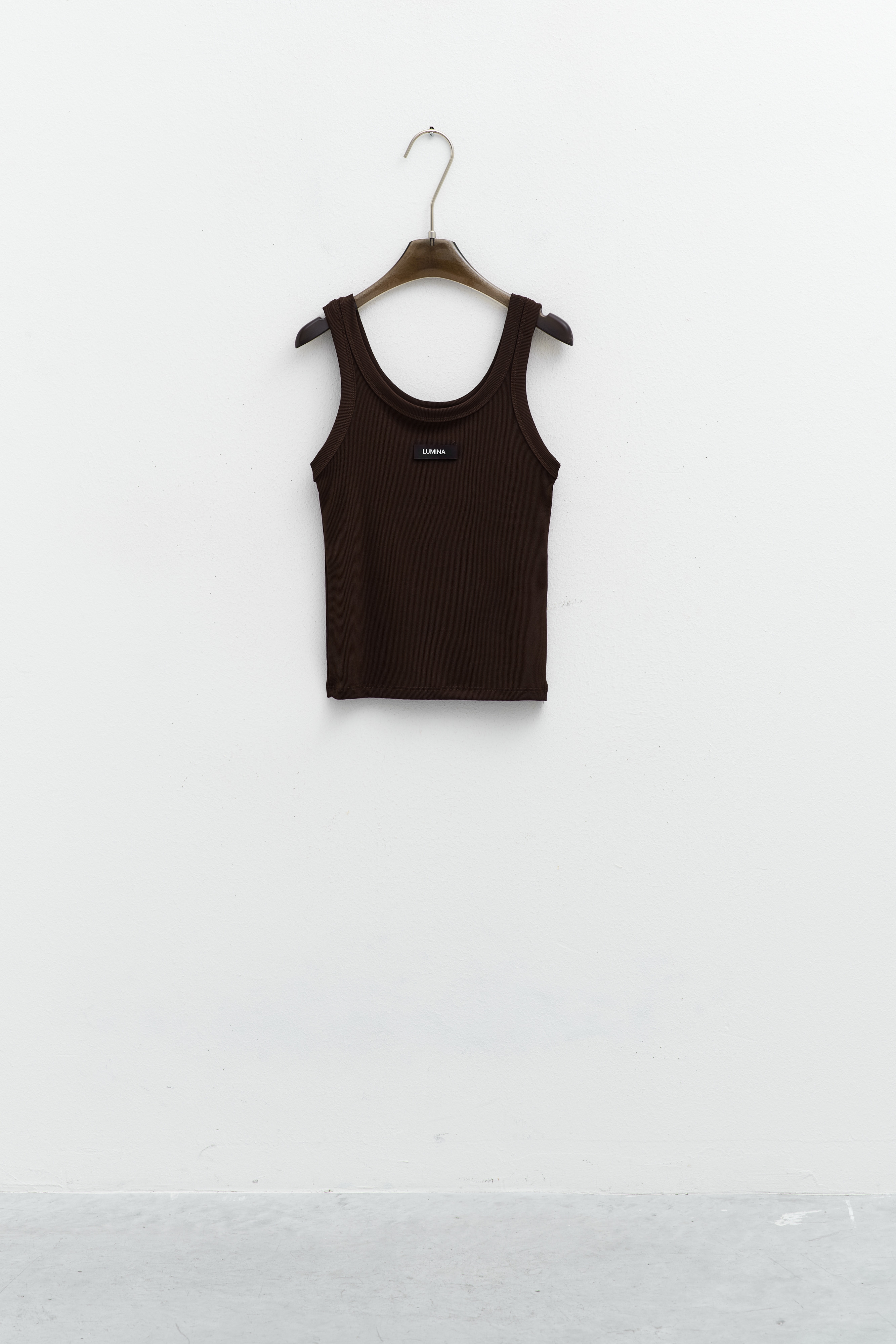 Ribbed crop tank top with wide rounded neckline.