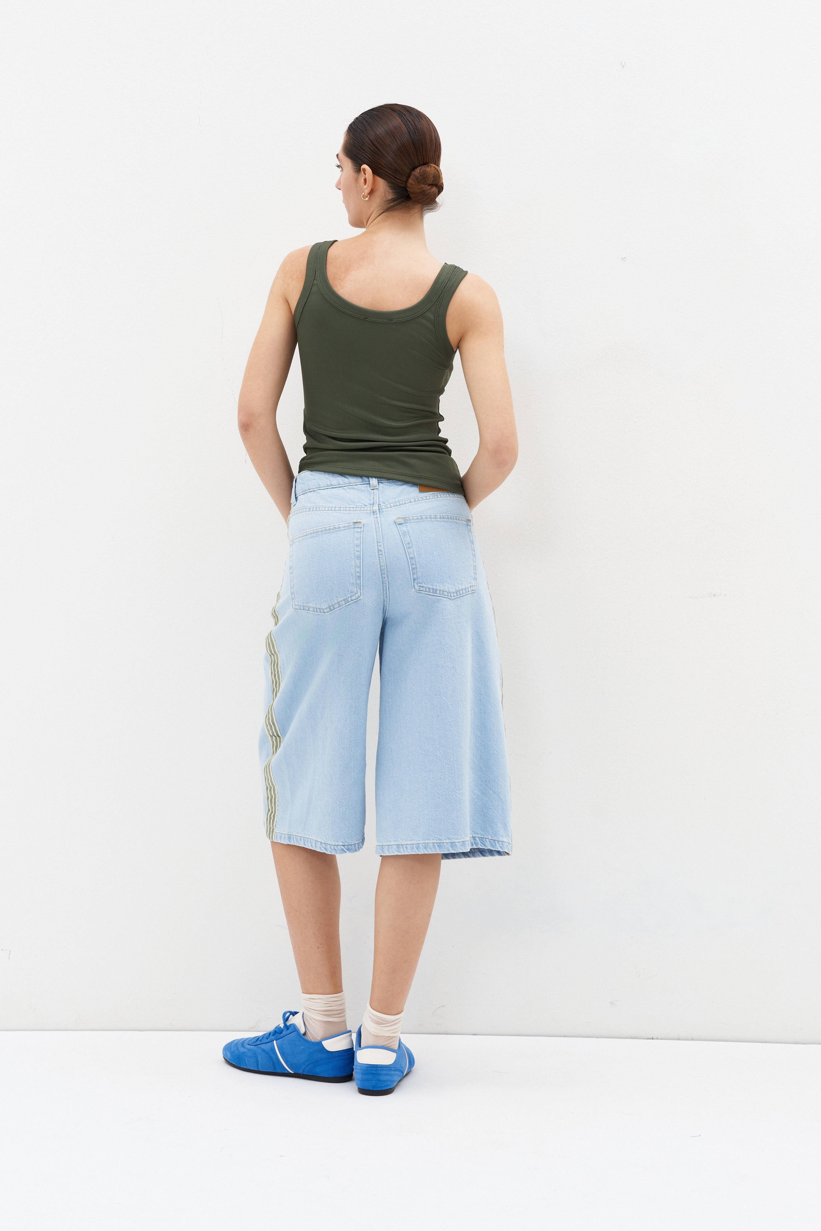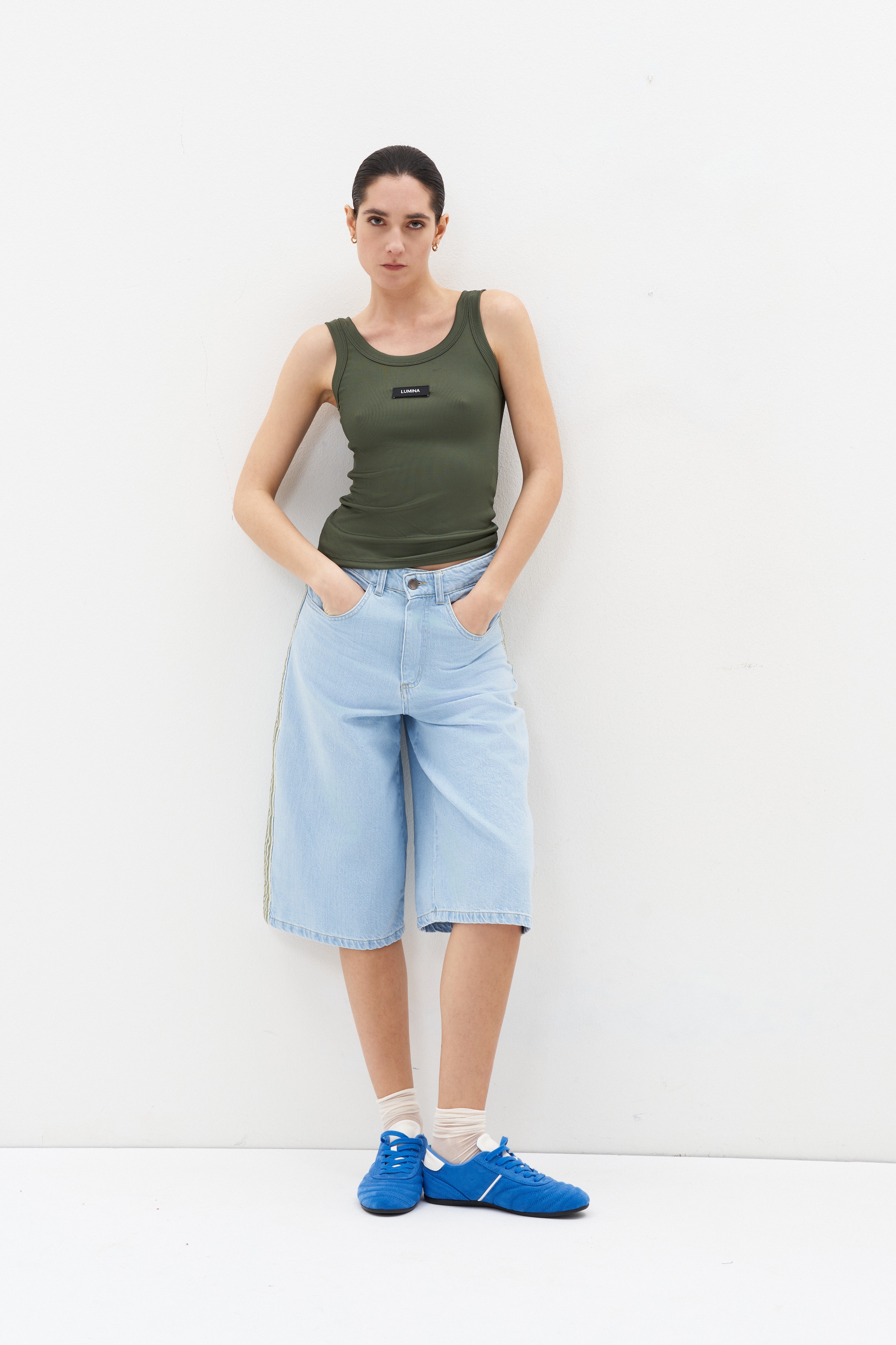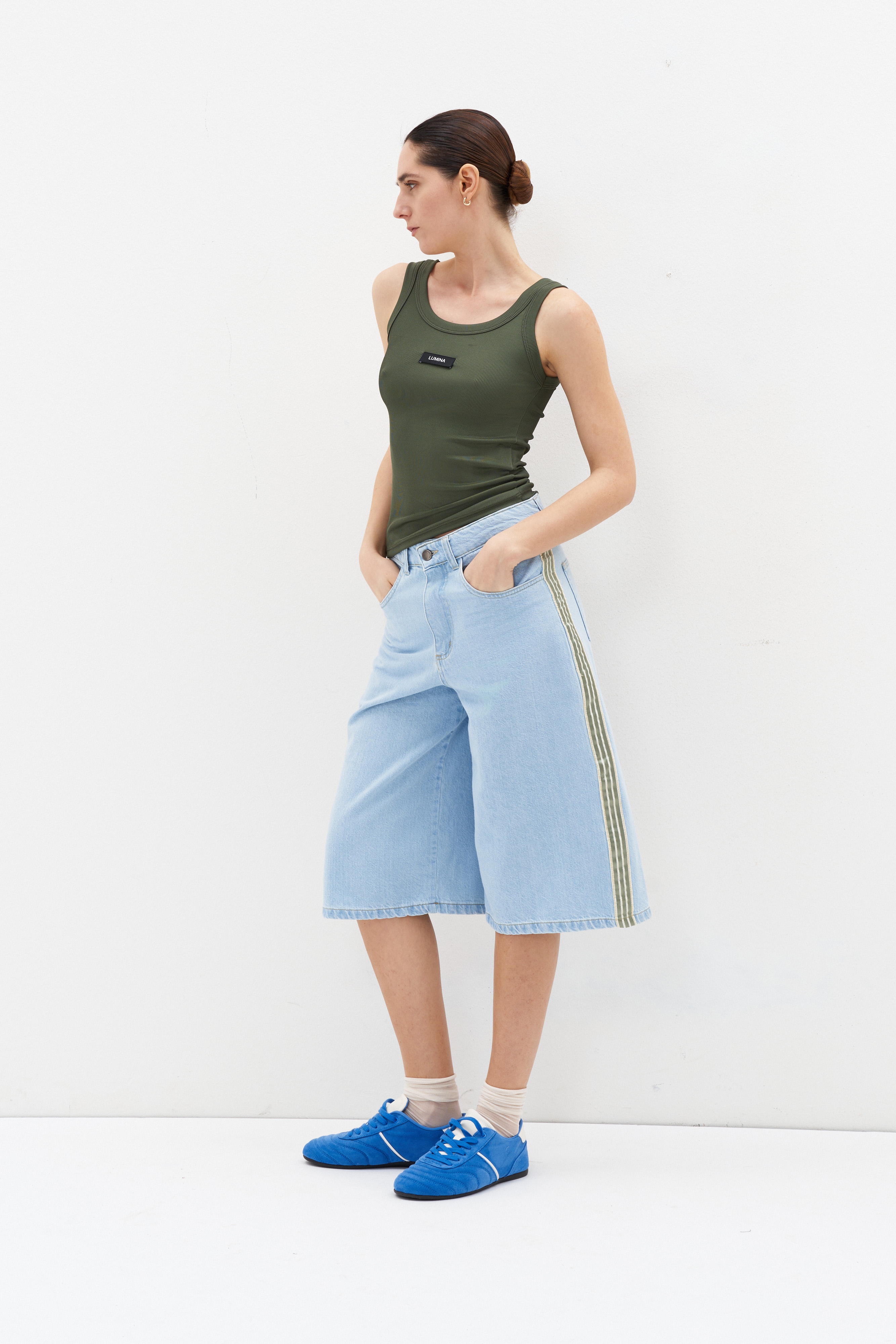 Stretch cotton jersey tank top. Wide crew neckline with a finished finish. Broad shoulders. Front insert with long fringes. Regular fit, available in size S/M, M/L.