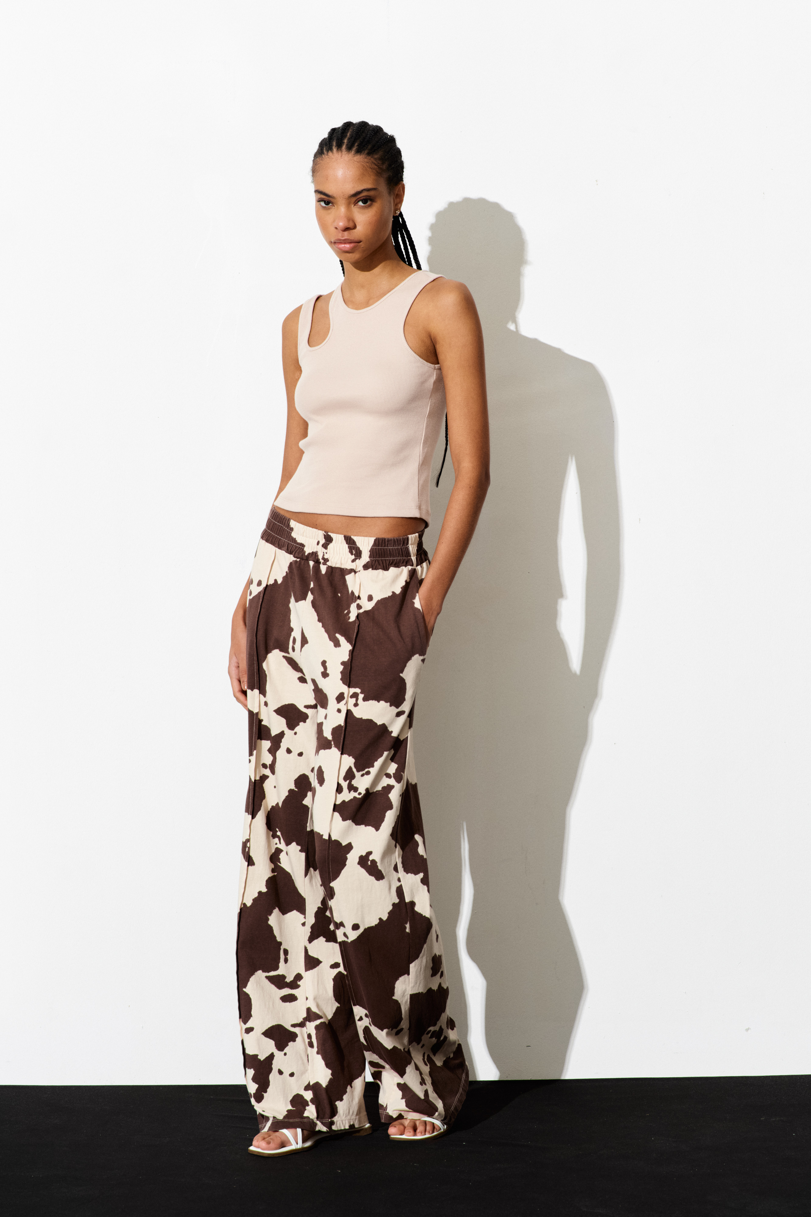 Stretch cotton zebra print top. Round neckline at the front. Short sleeves. Back with open back and adjustable knots. Regular fit, available in size S/M, M/L.