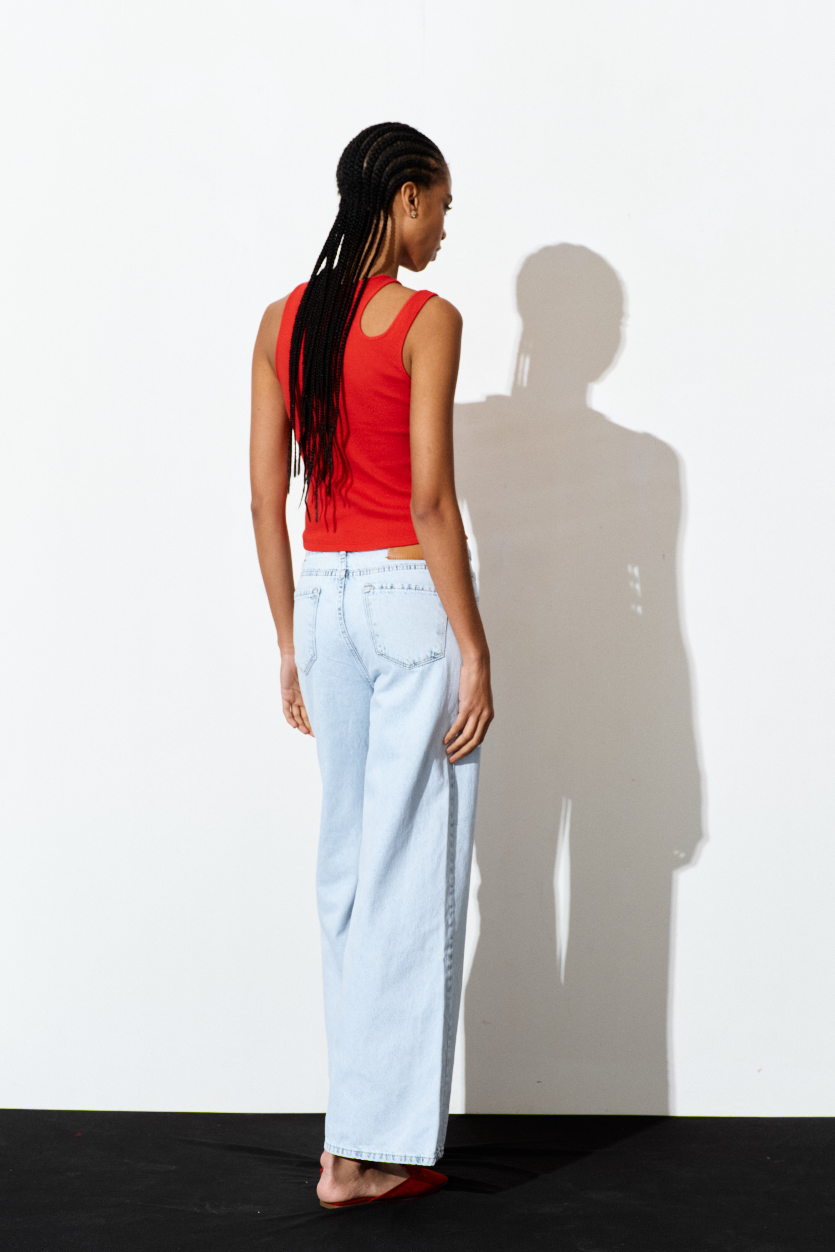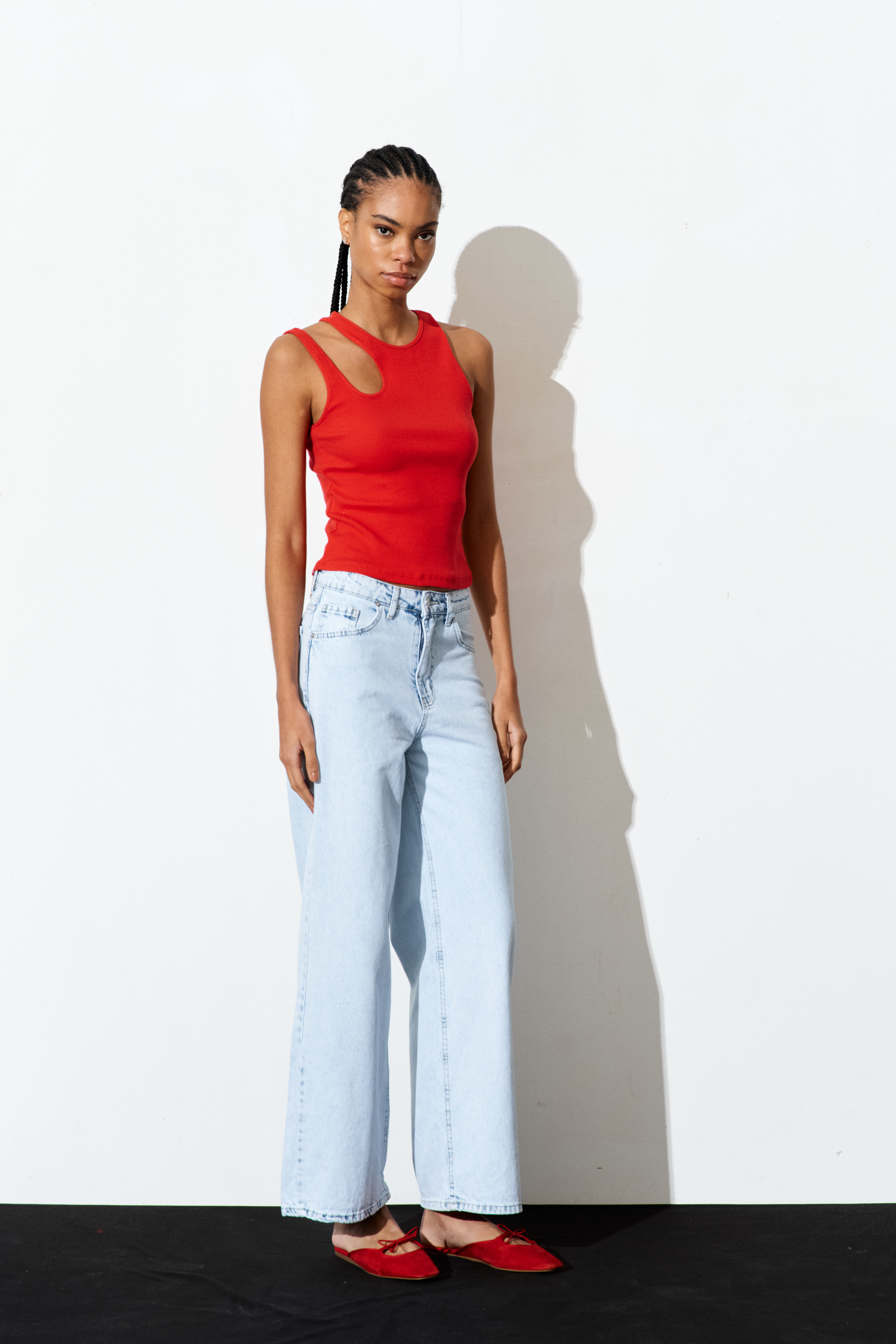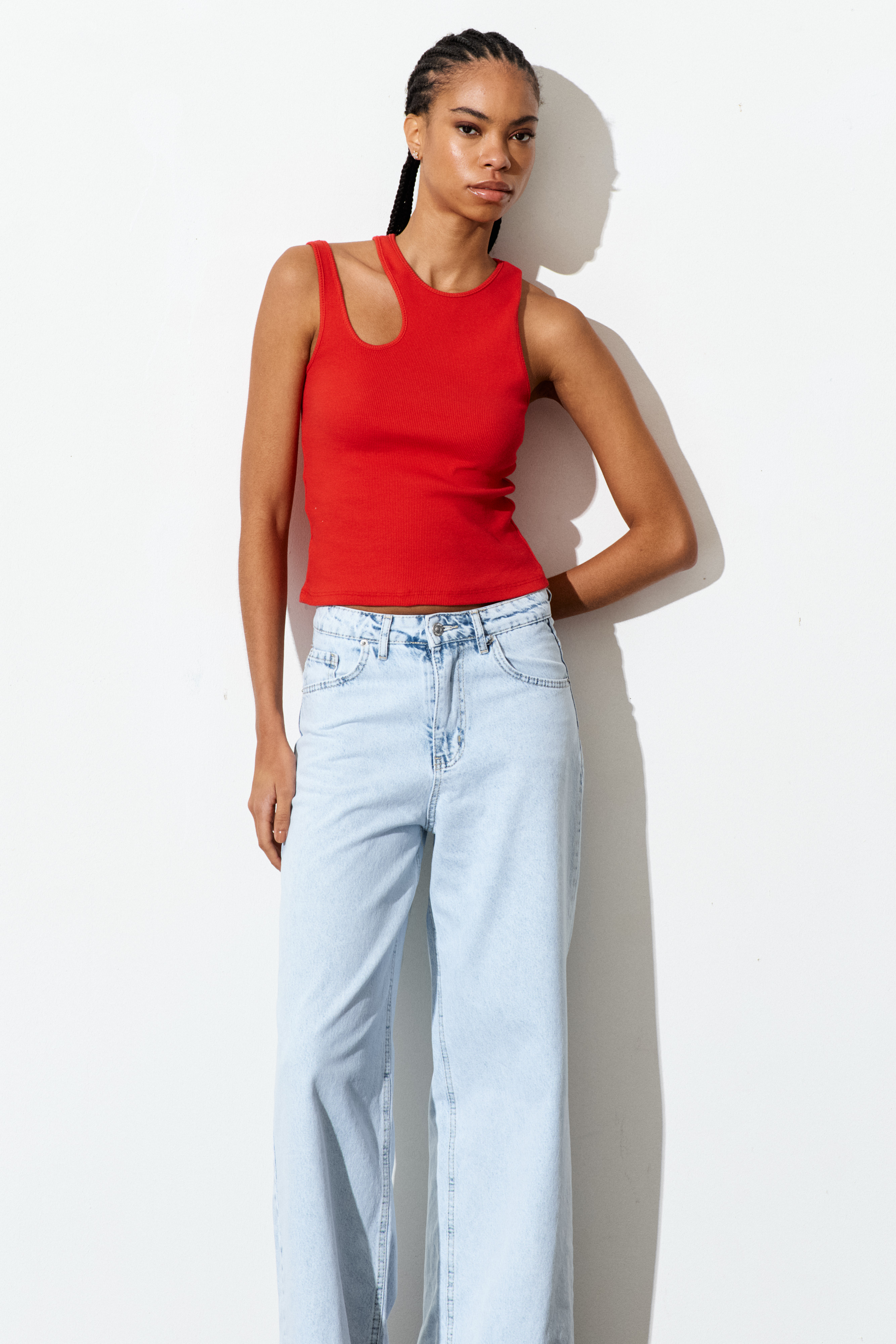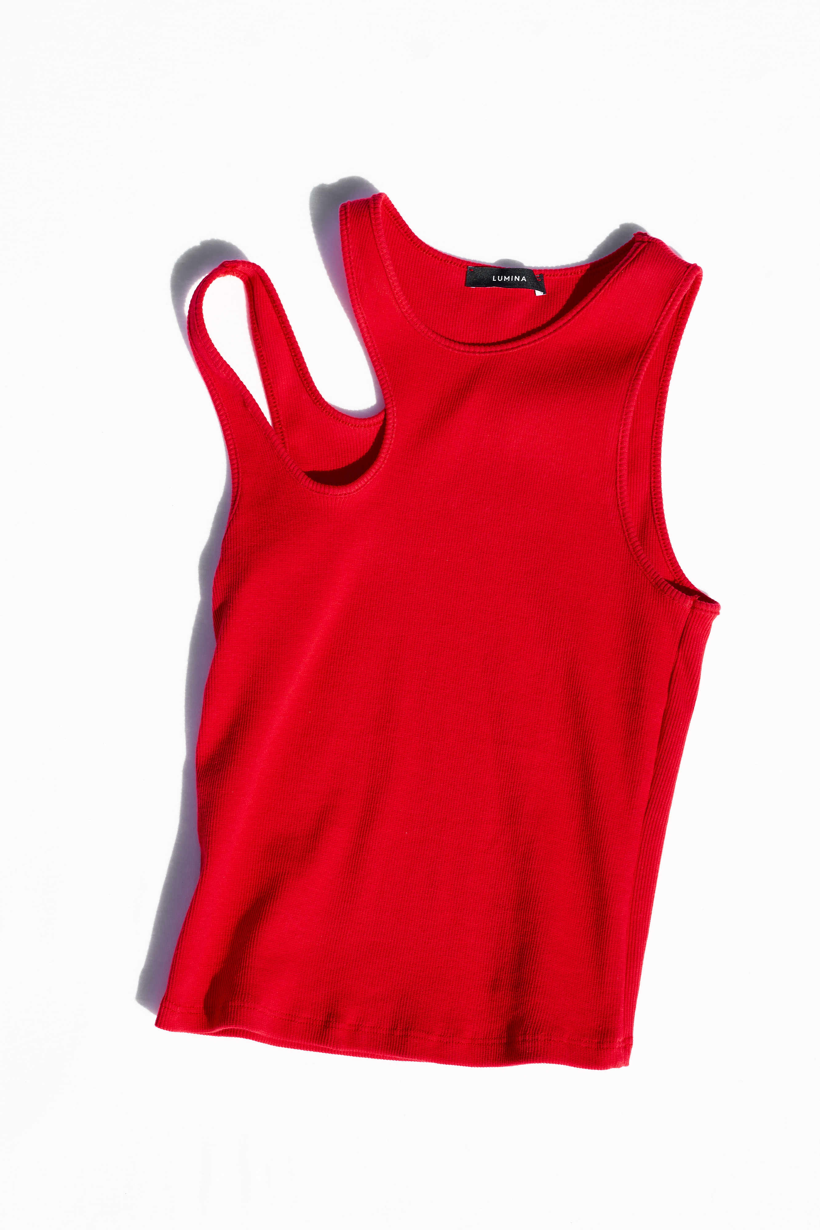 Ribbed crop tank top with wide rounded neckline.