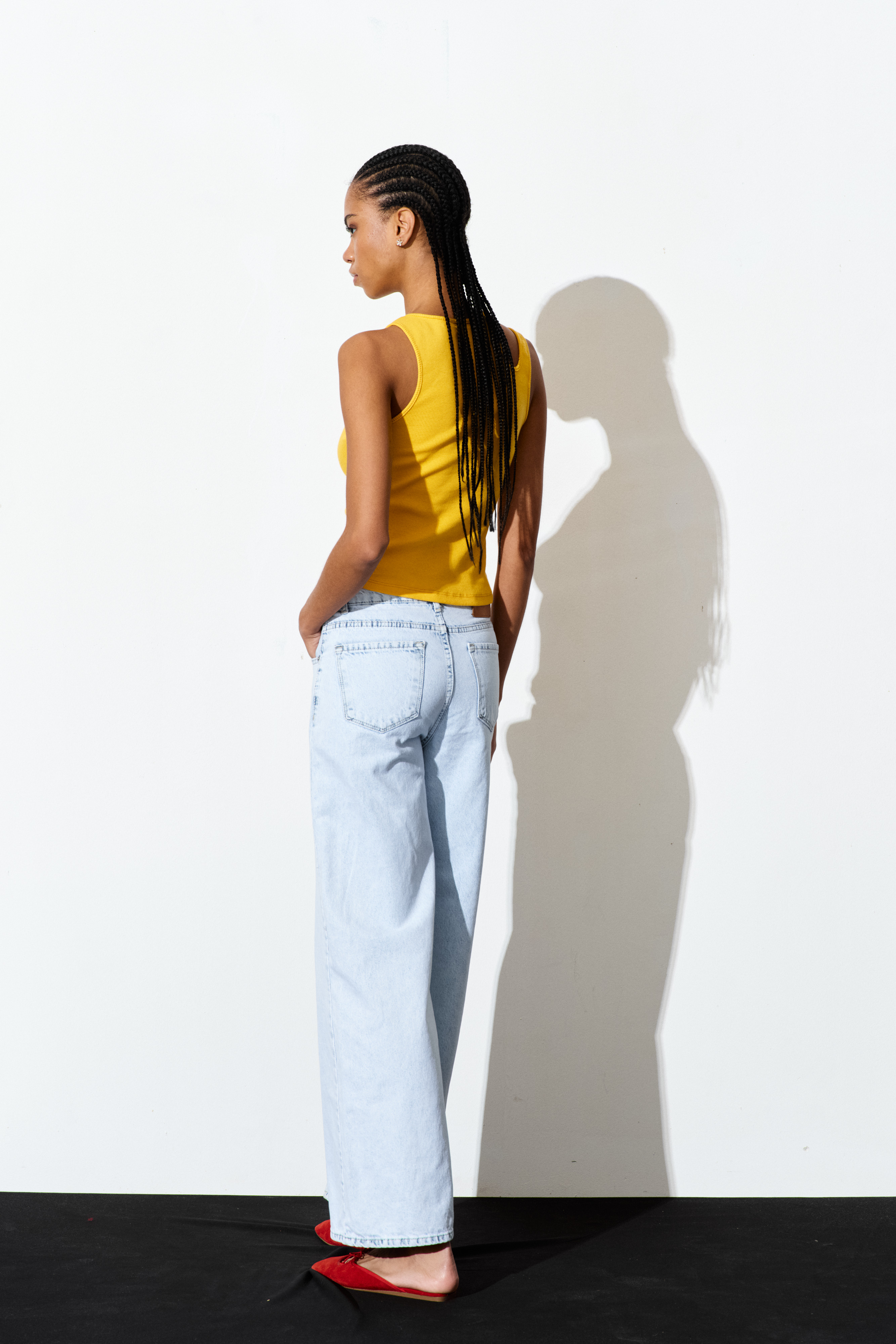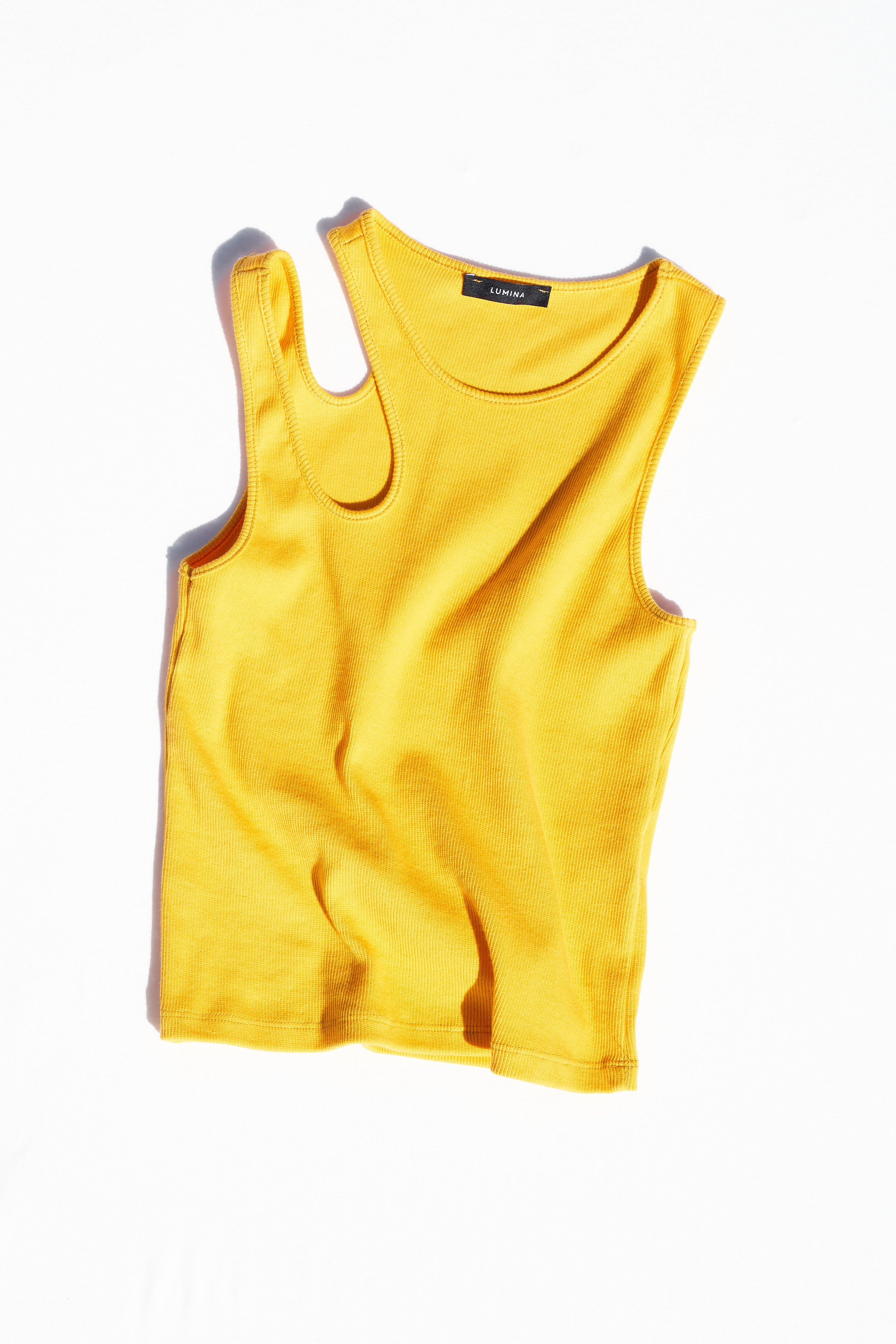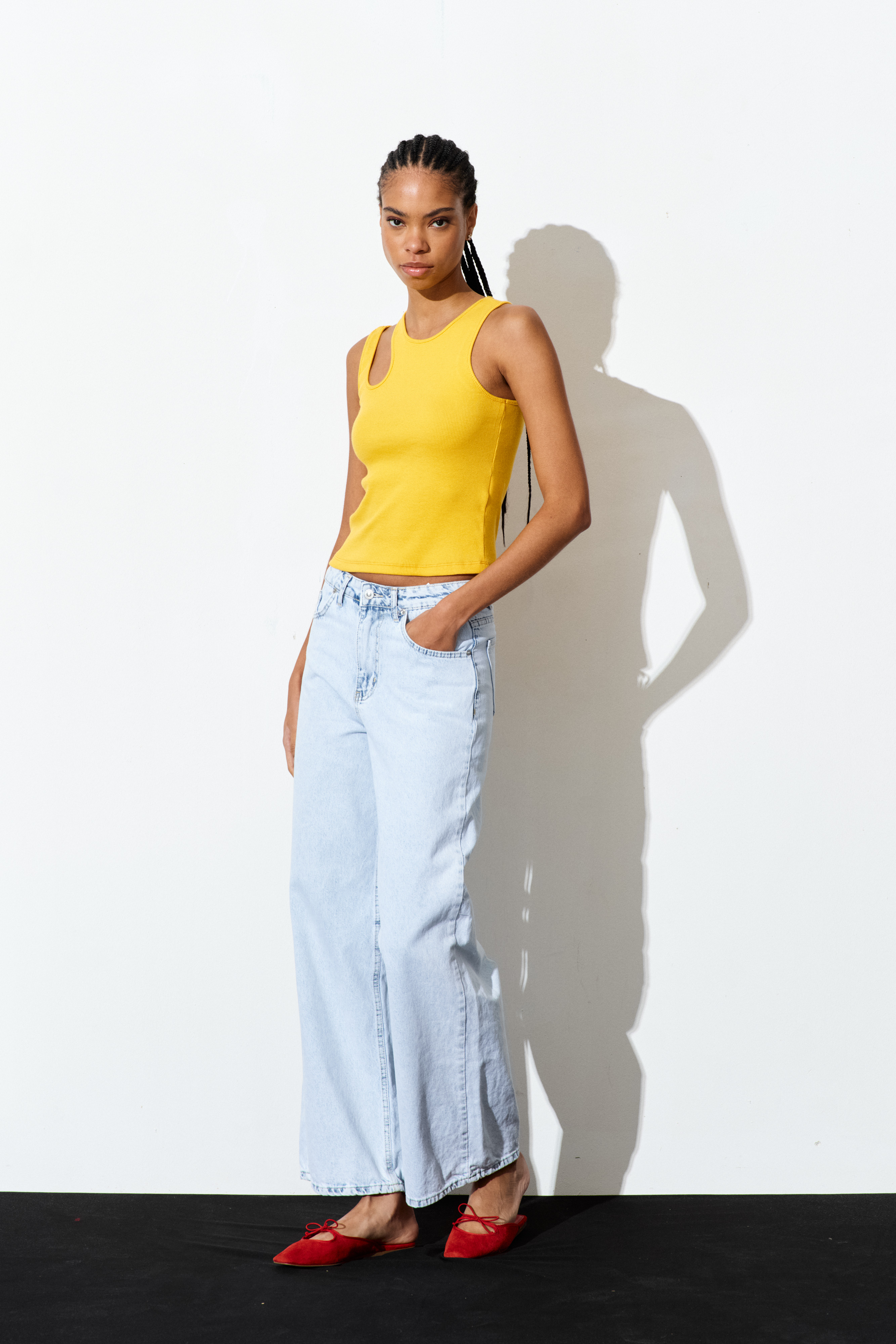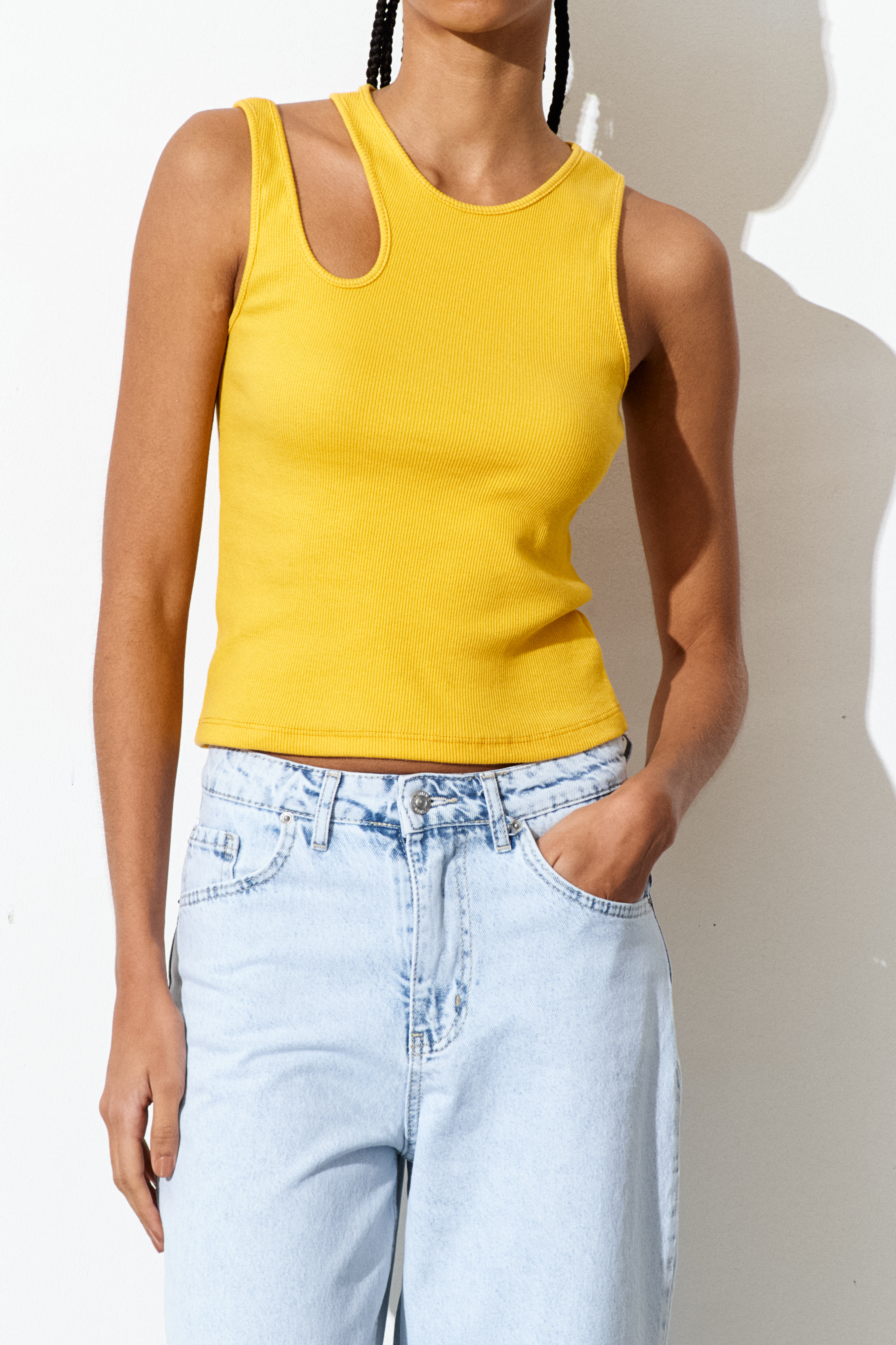 Stretch cotton jersey tank top. Wide crew neckline with a finished finish. Broad shoulders. Front insert with long fringes. Regular fit, available in size S/M, M/L.