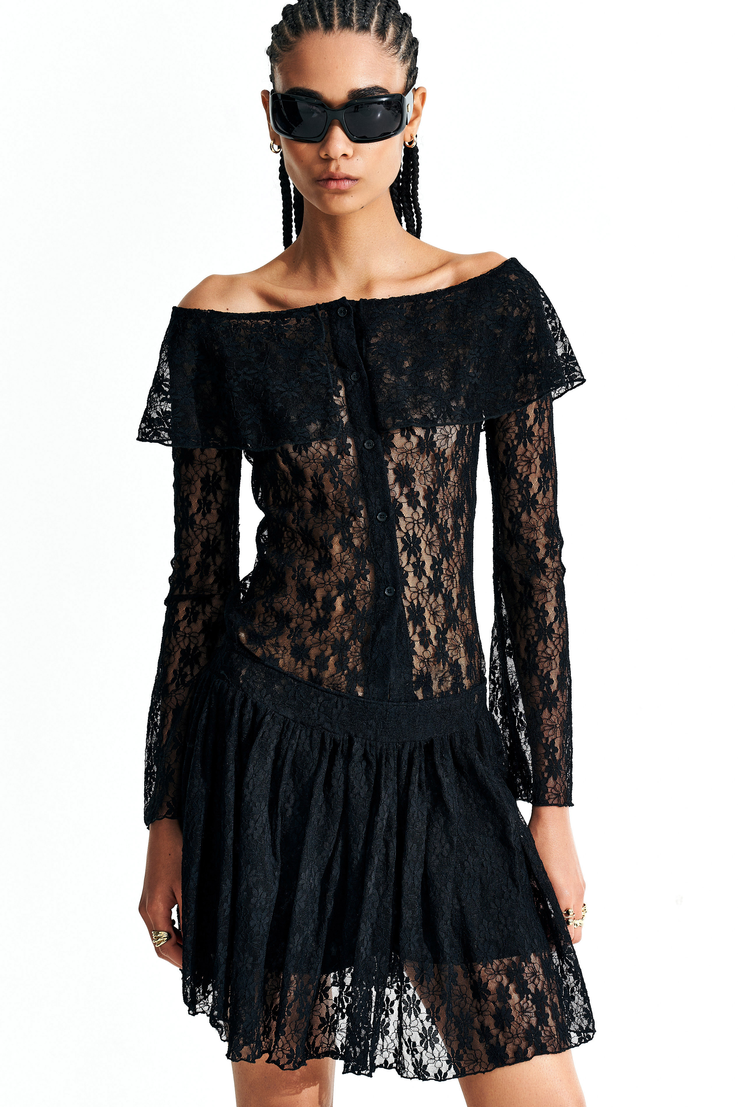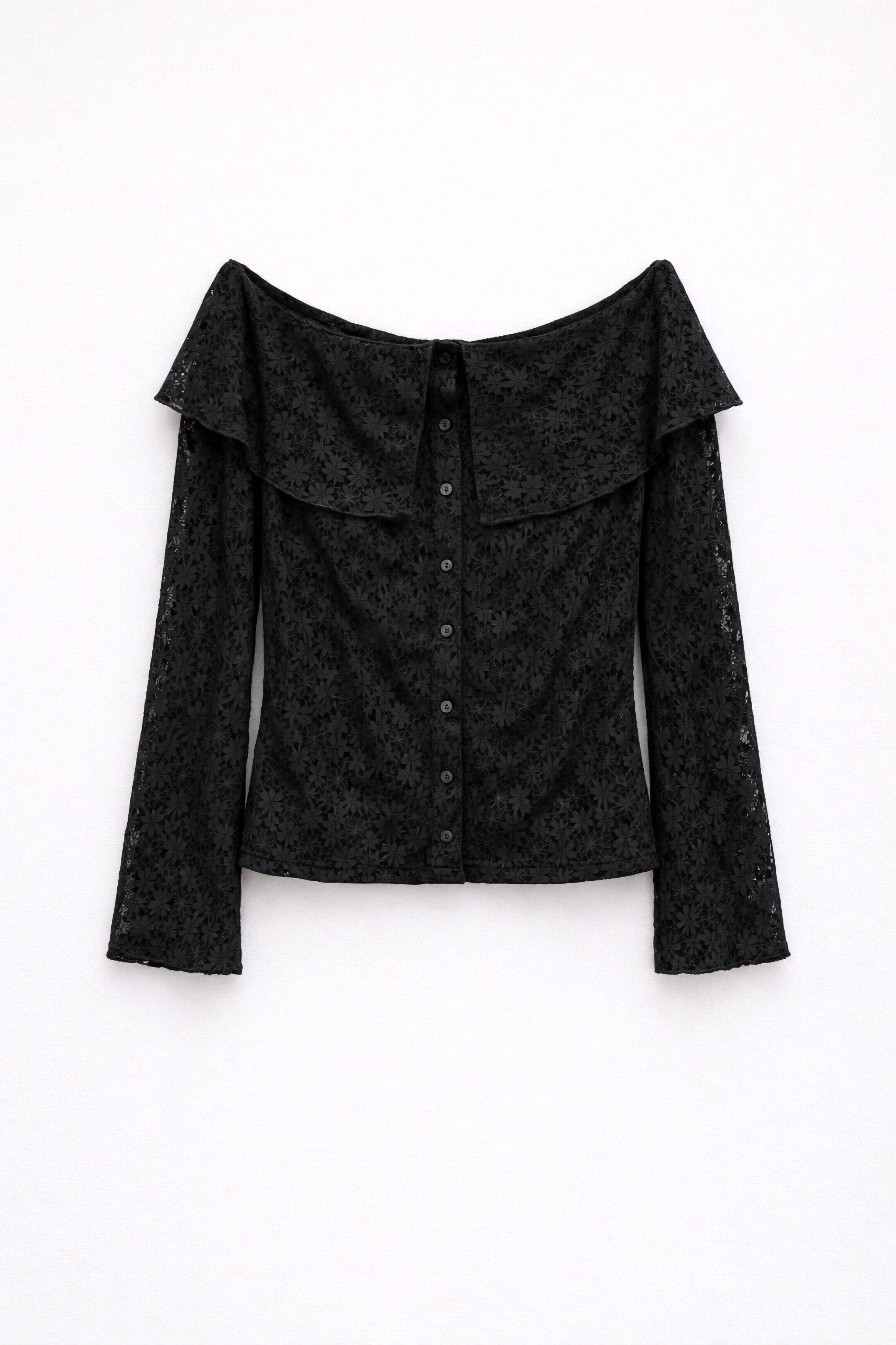Wide off-the-shoulder top with elasticated ruffles.