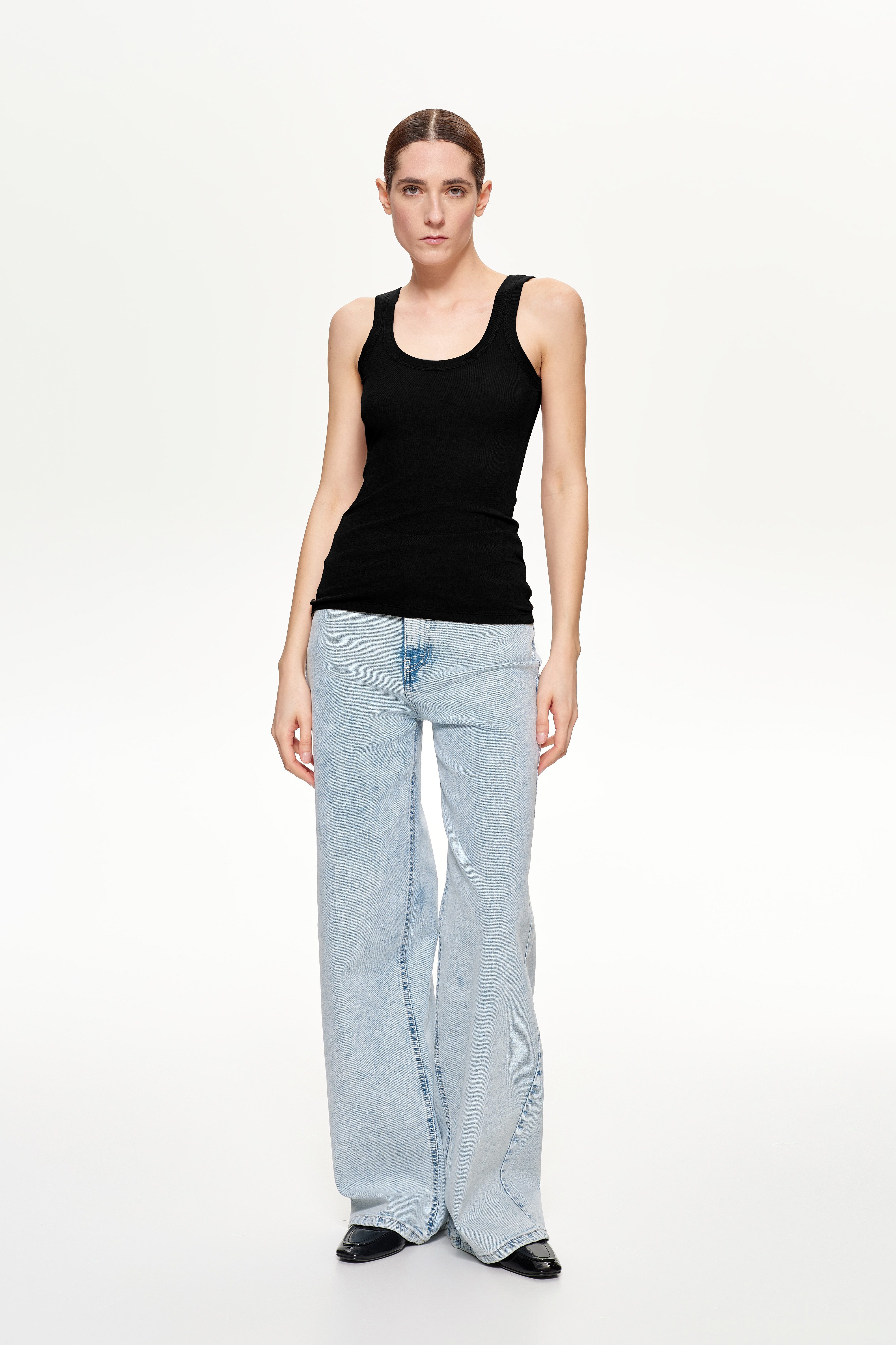 Ribbed crop tank top with wide rounded neckline.