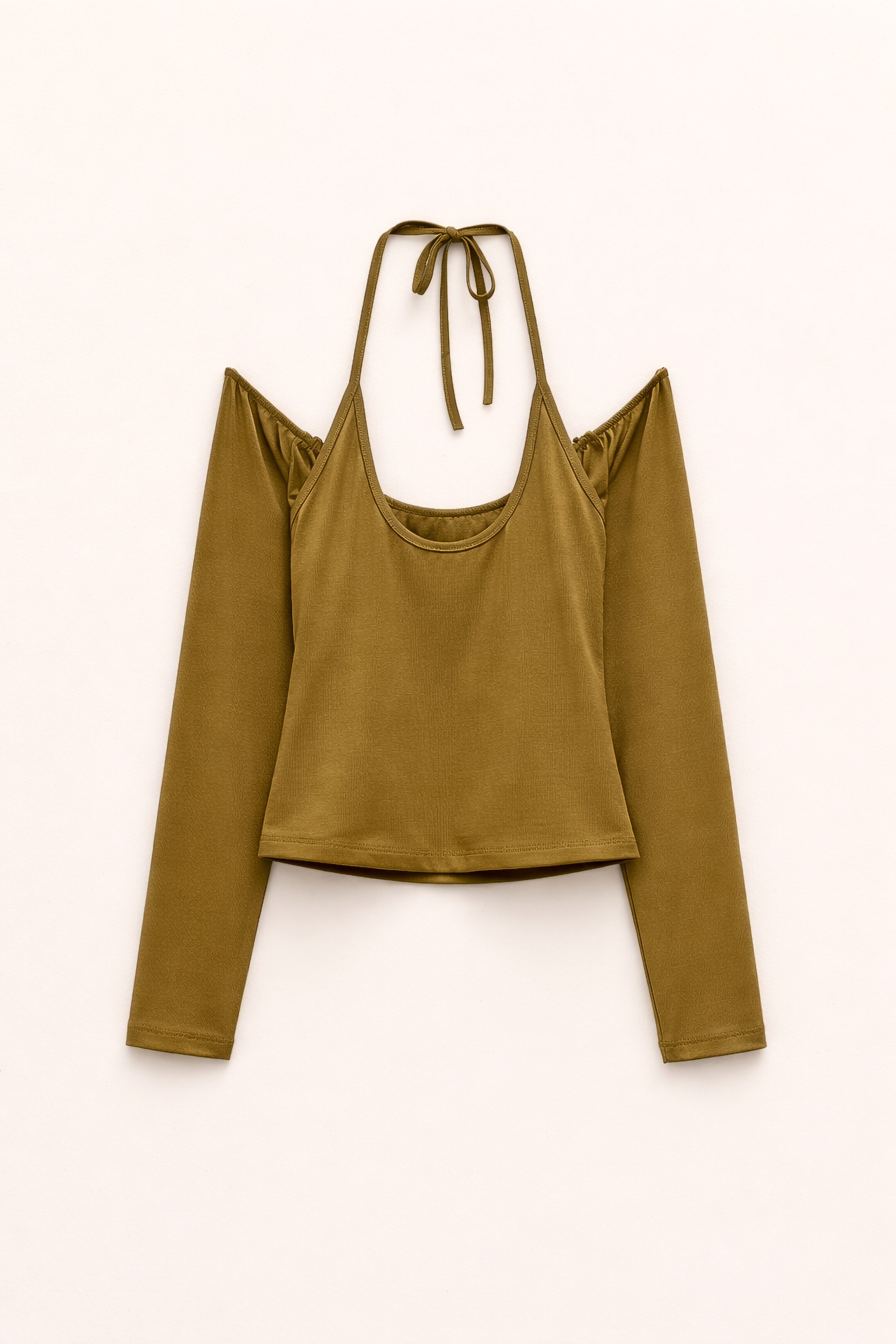 Long-sleeved, off-the-shoulder shirt.
