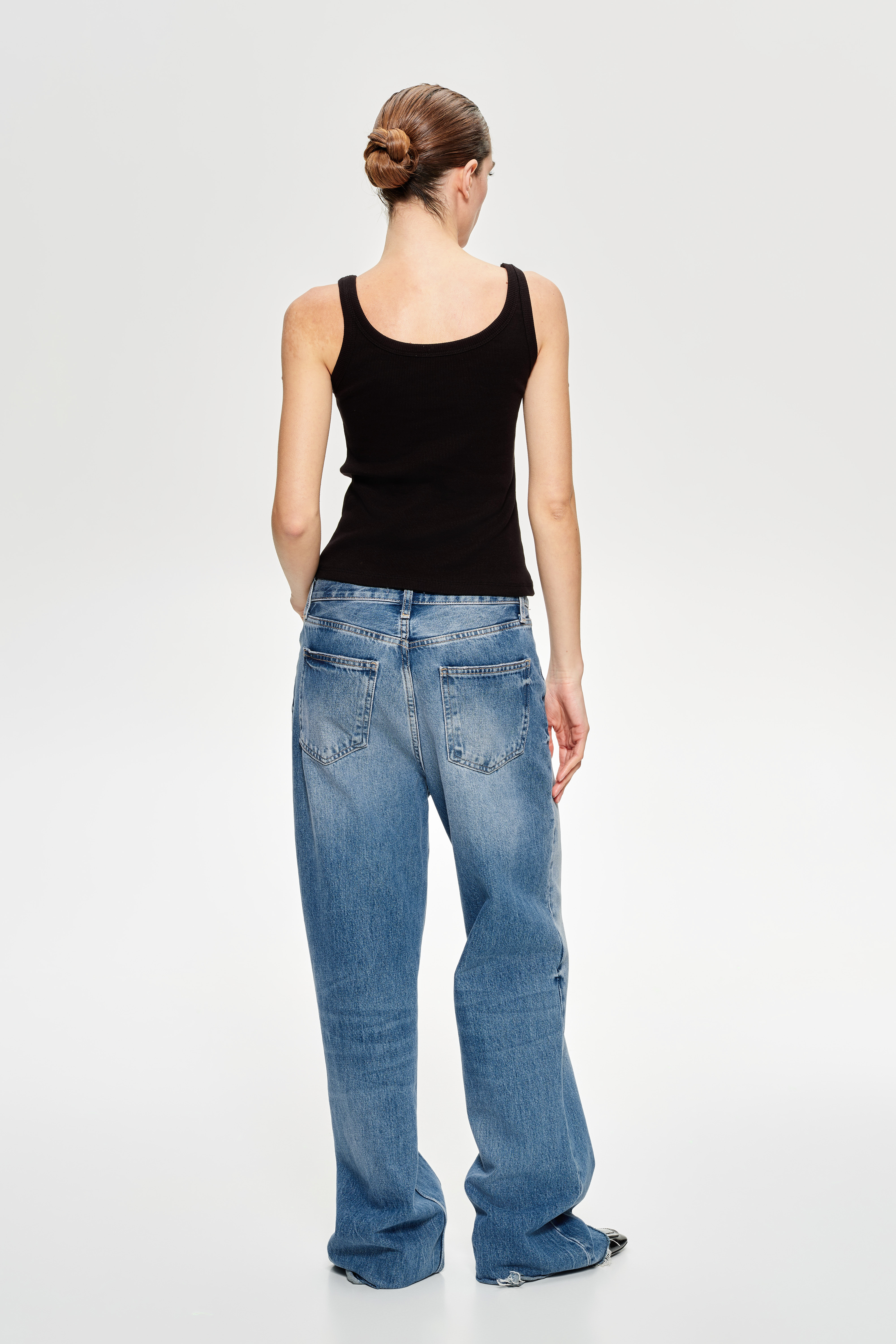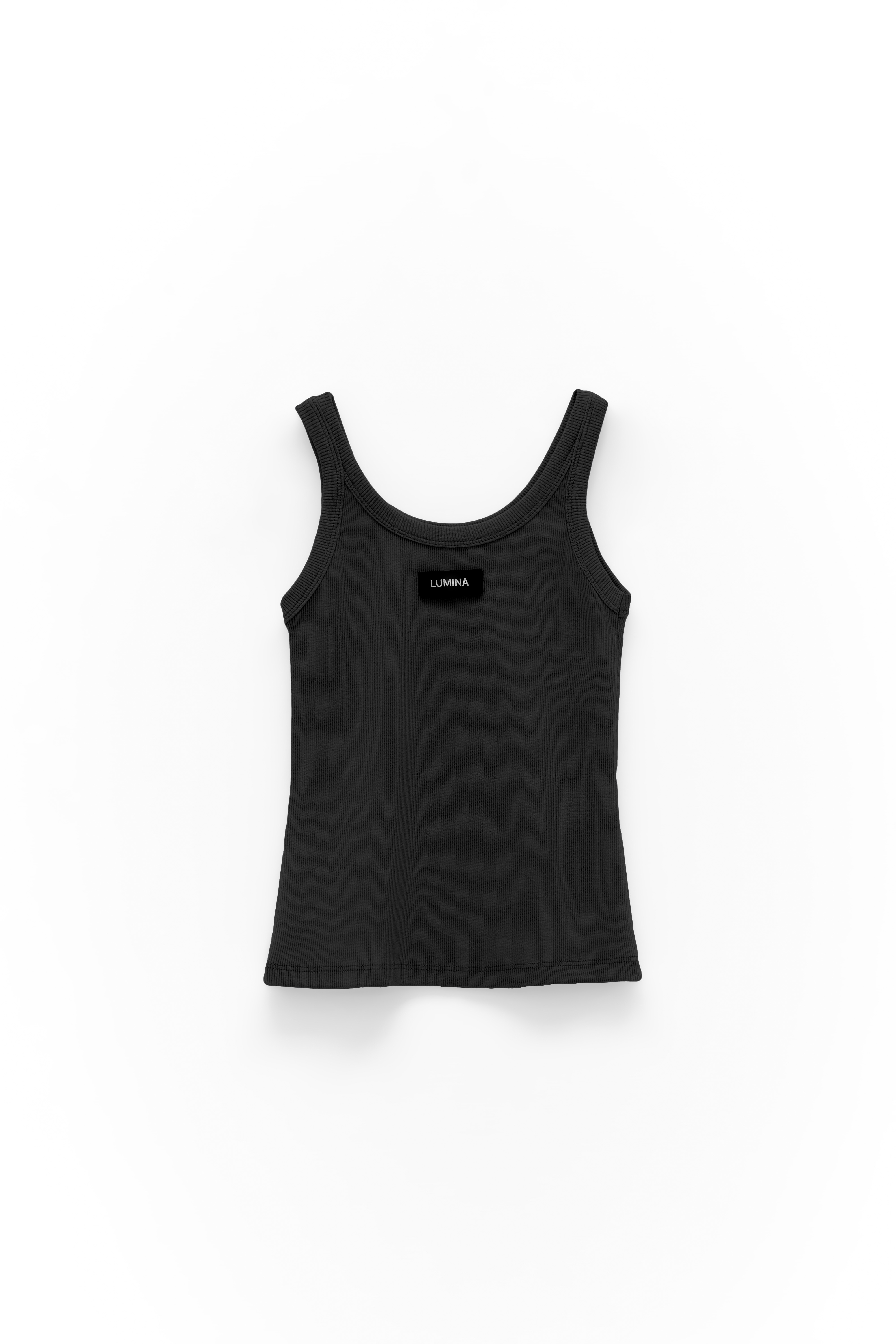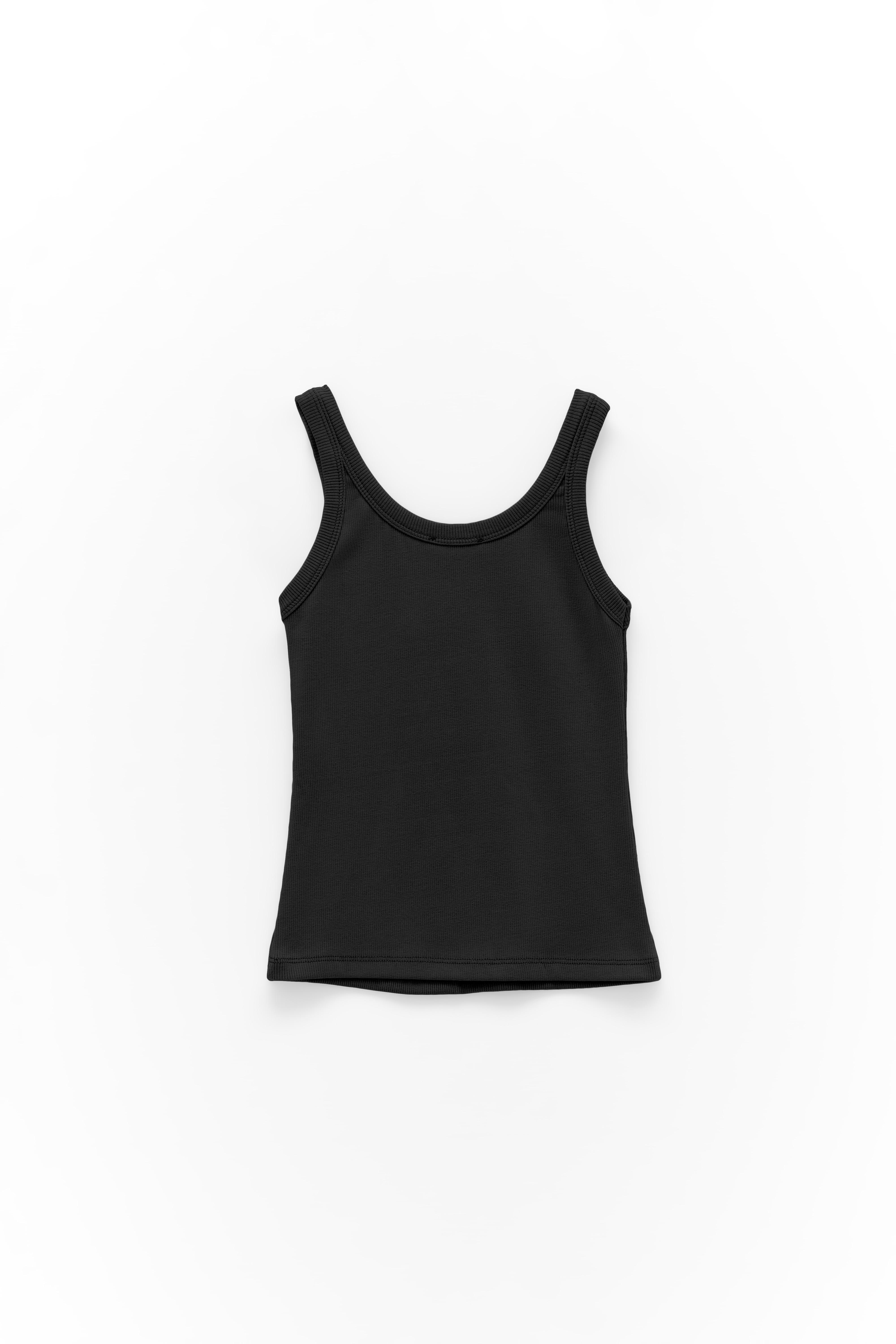 Ribbed crop tank top with wide rounded neckline.